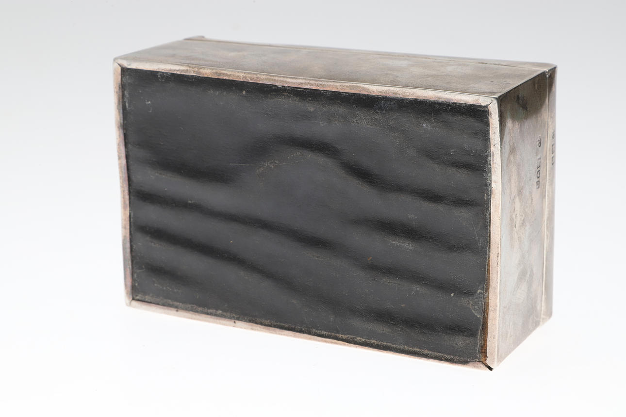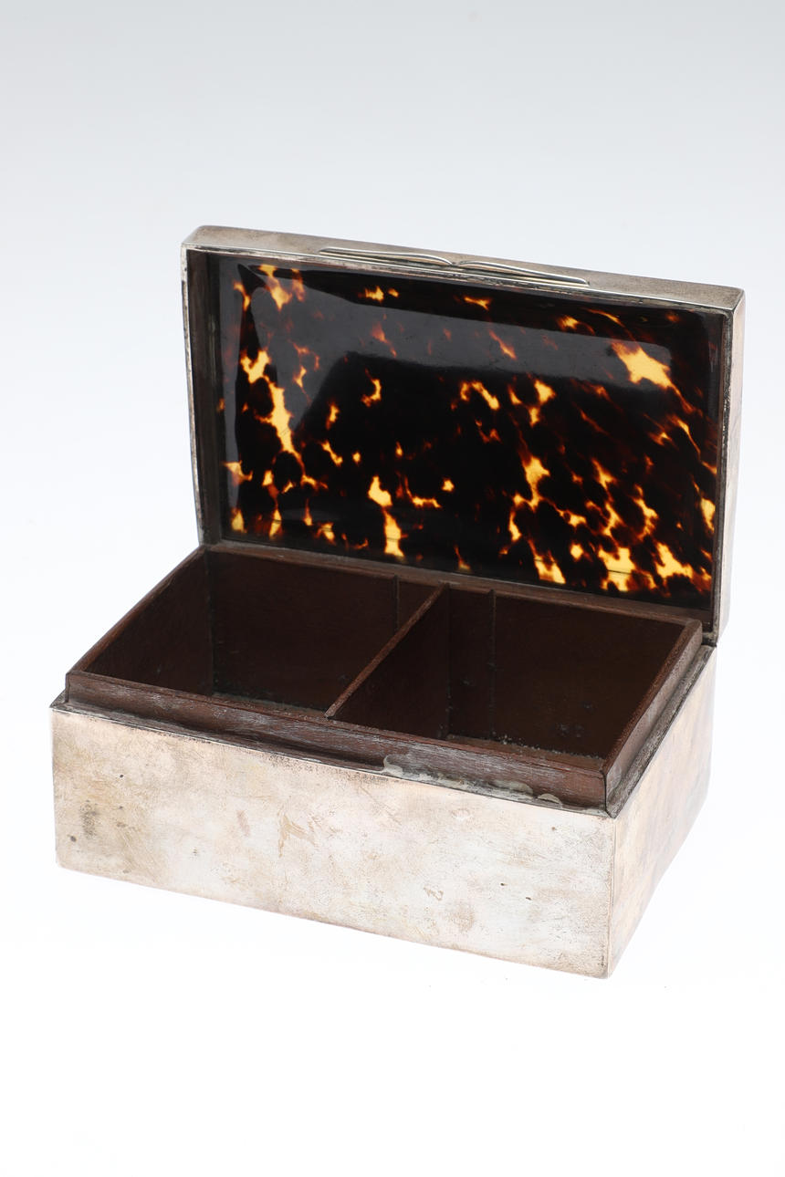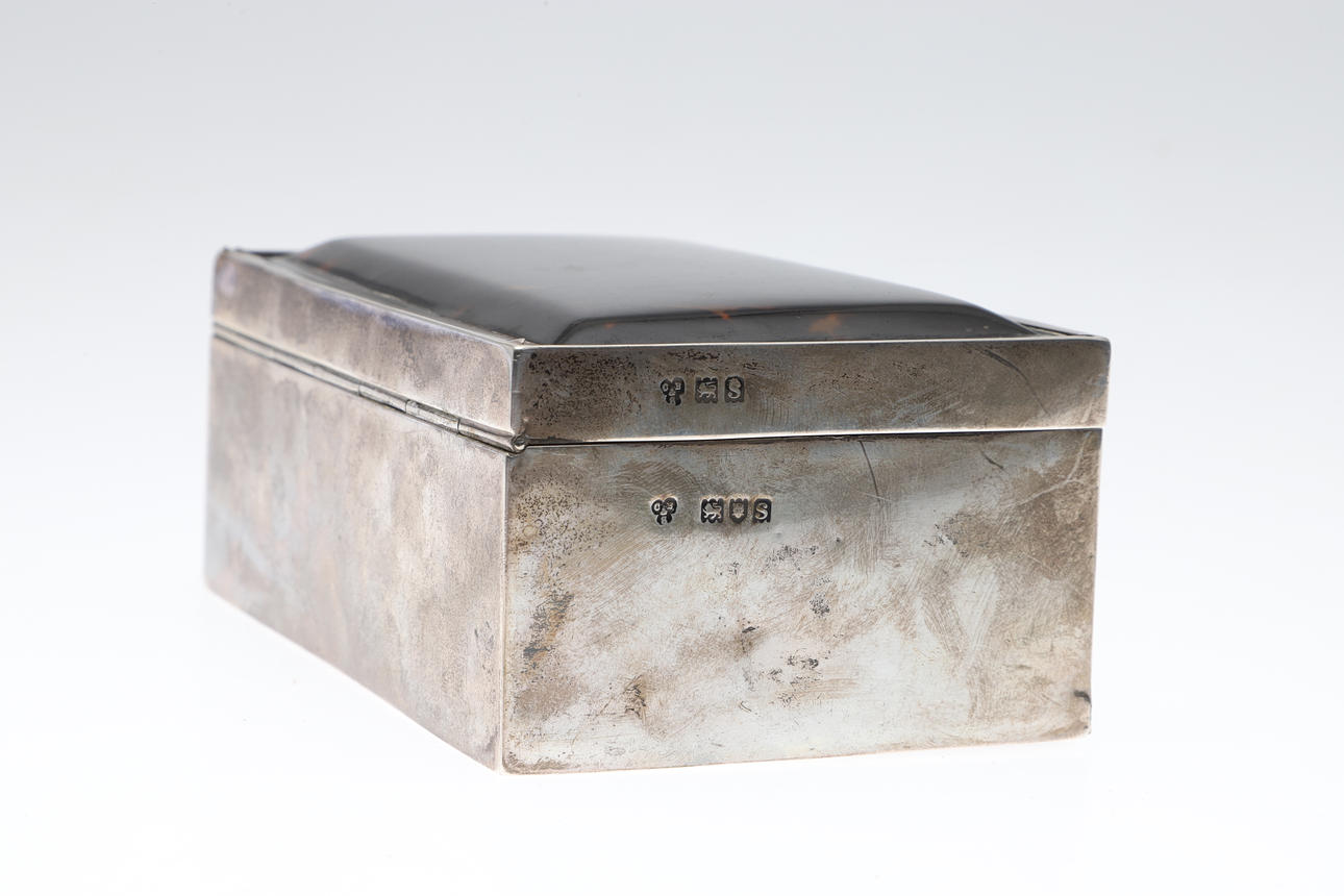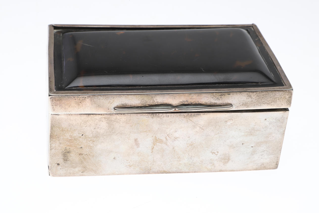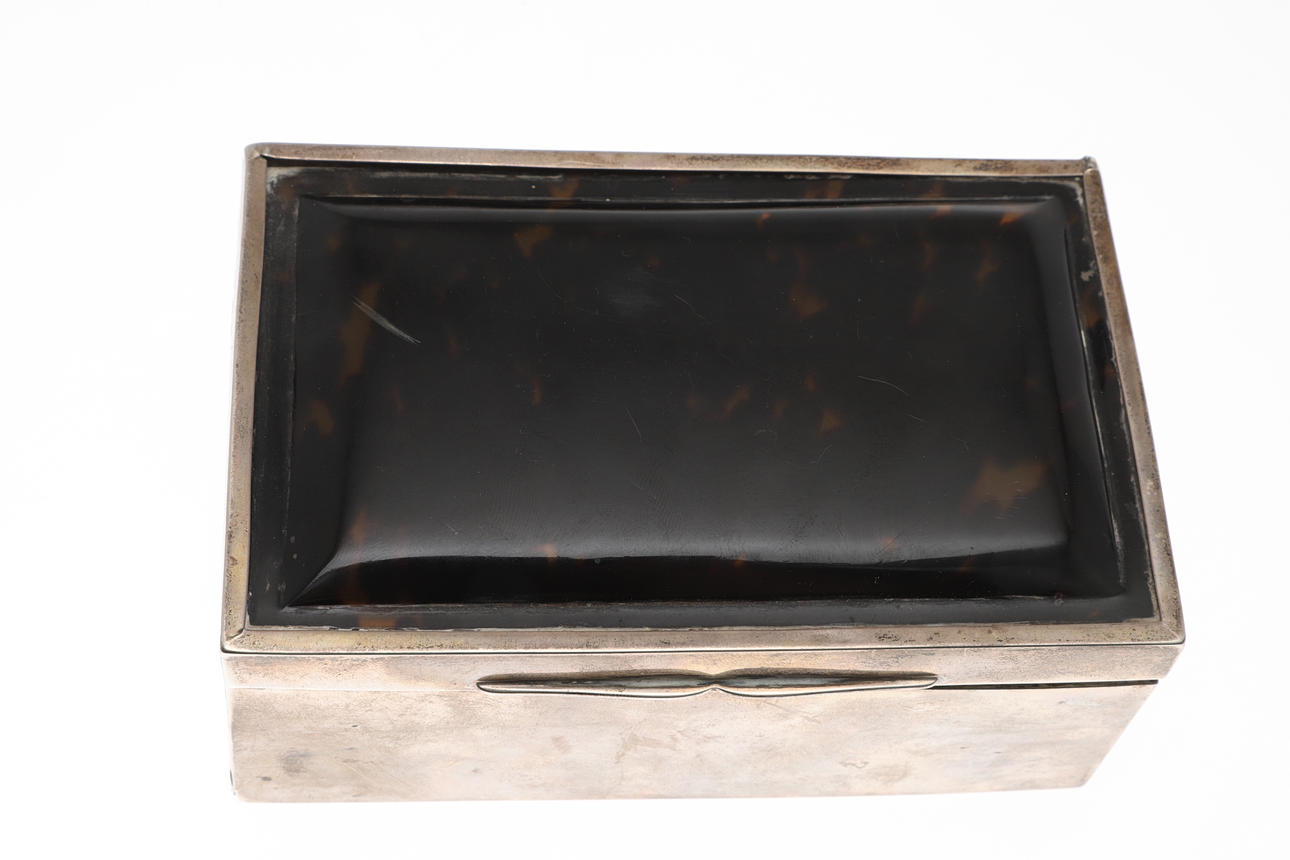 Of rectangular form with tortoiseshell lid, hallmarked Charles Boyton & Son Ltd, 1913. Height 6cm x Width 14cm x Depth 9cm.