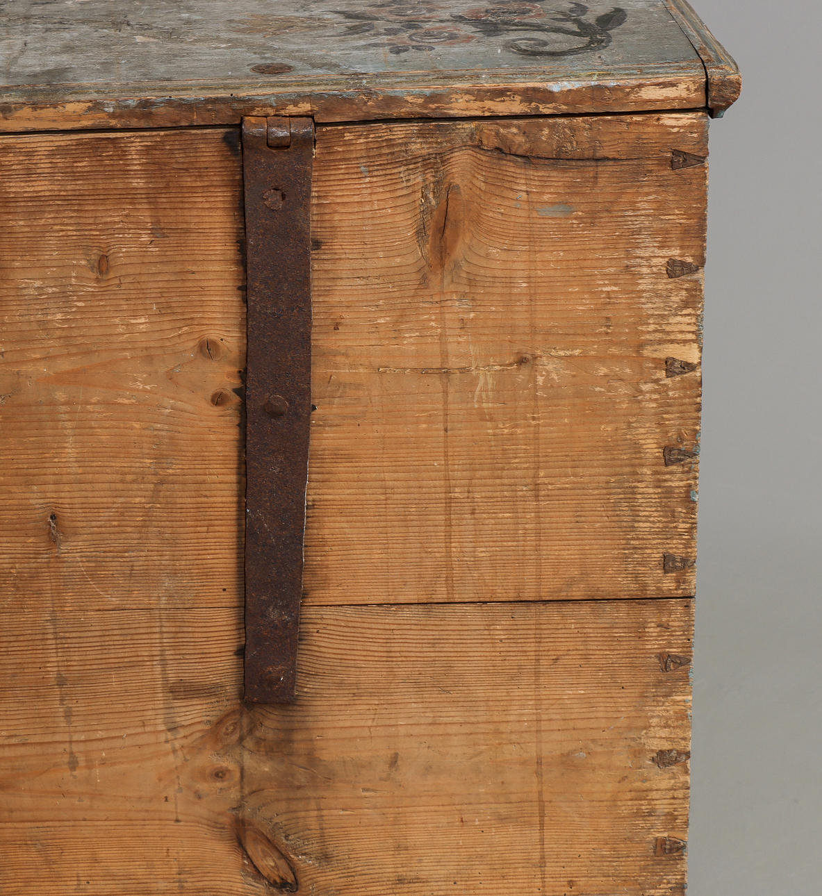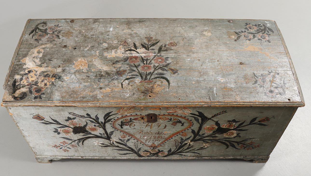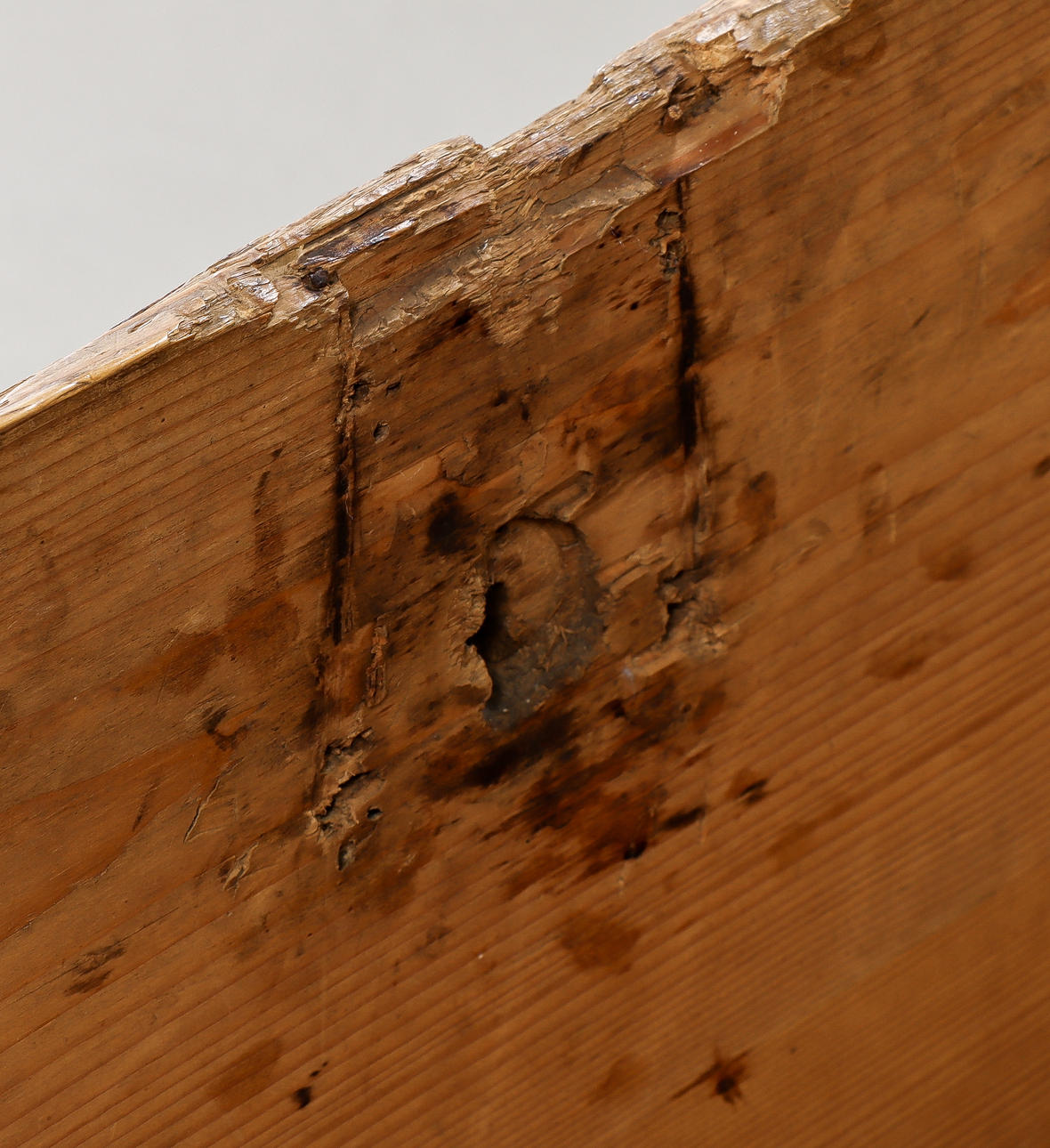 Age-related wear, cracks, rejection and minor damage, missing locks, slightly worm-stung, renovated plinth.