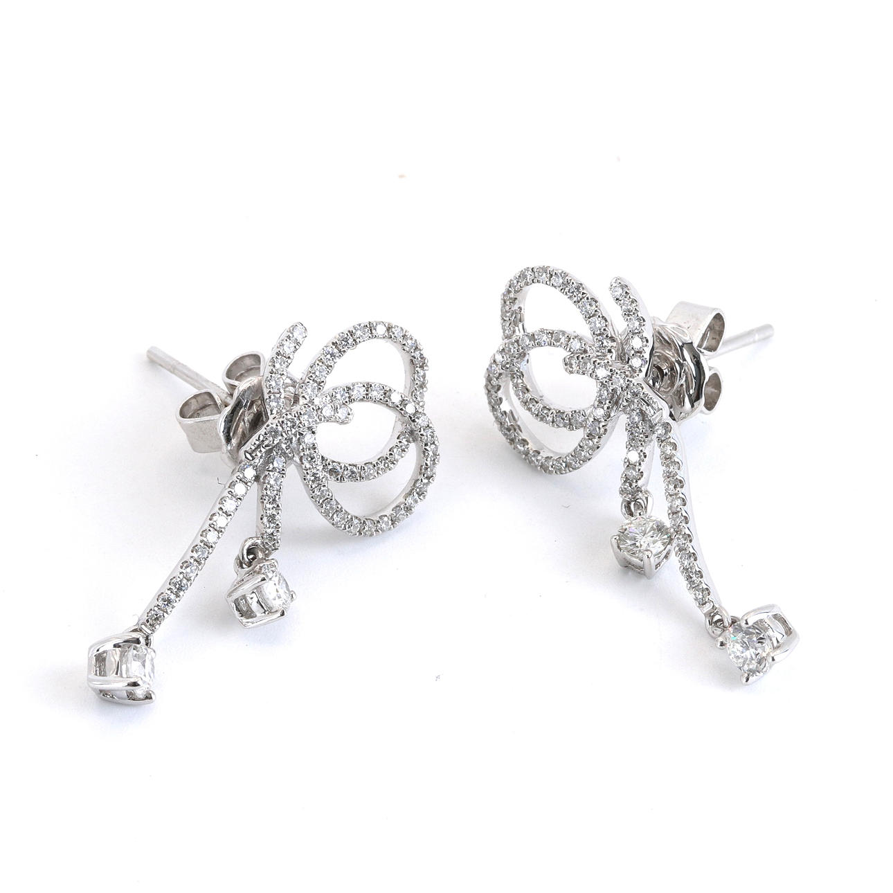 A pair of 18ct white gold earrings set with 0.89ct of brilliant cut diamonds. L. 2.7 cms.
