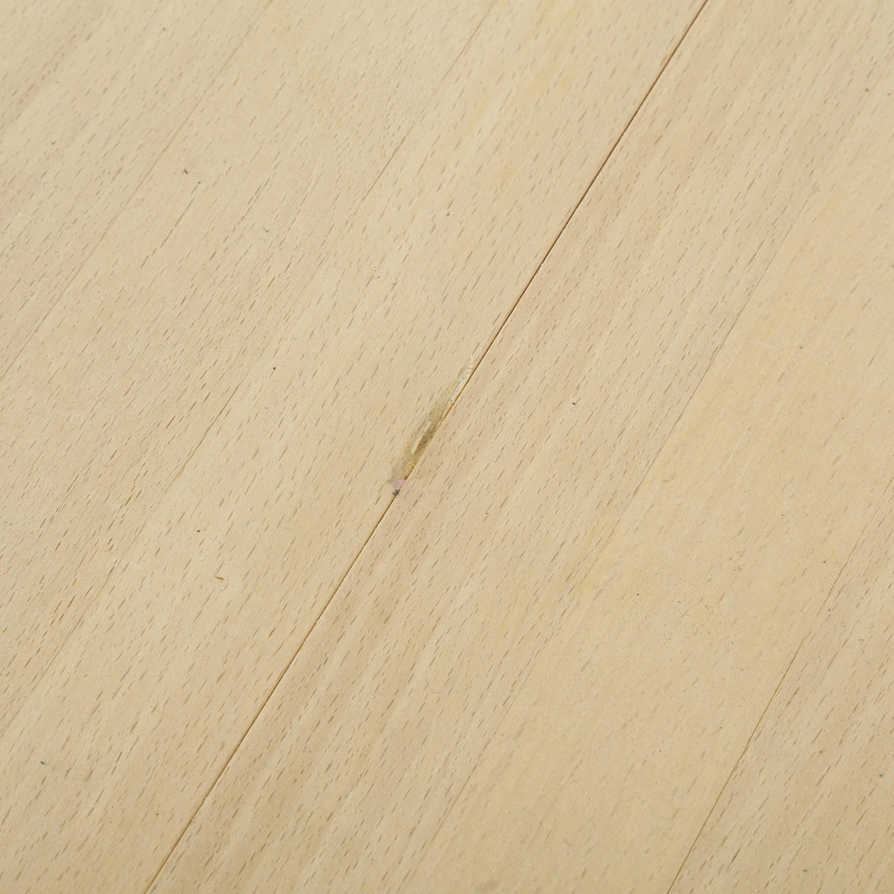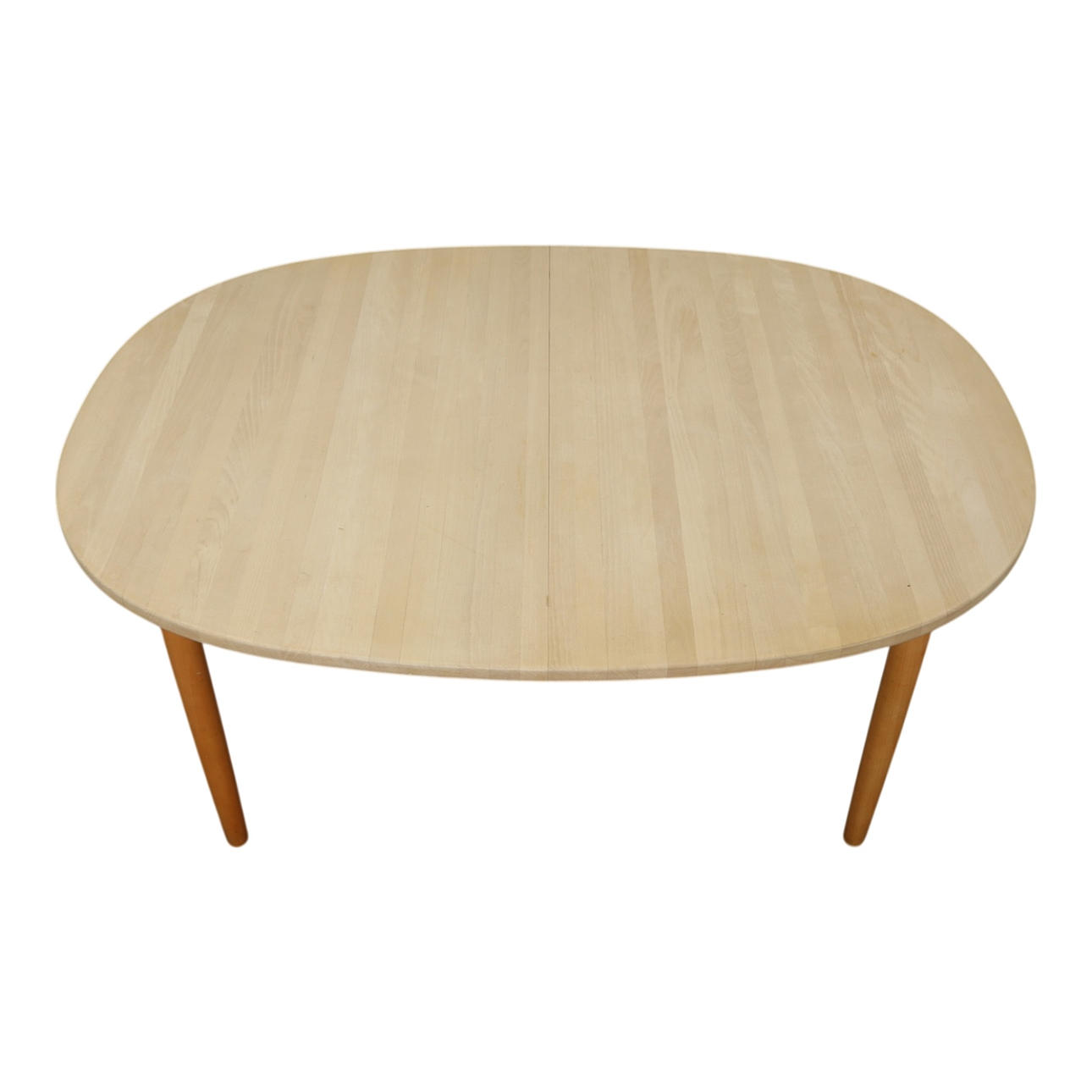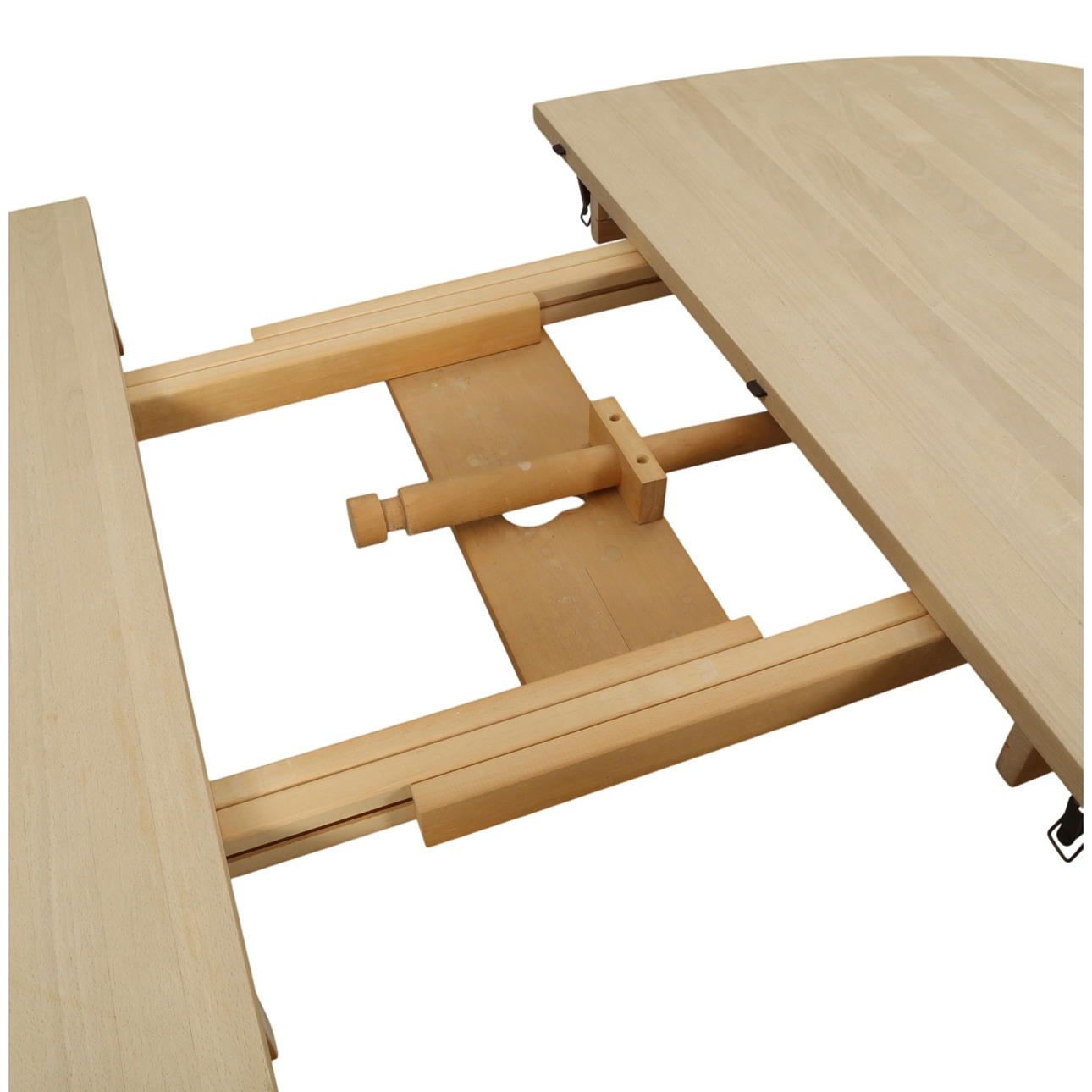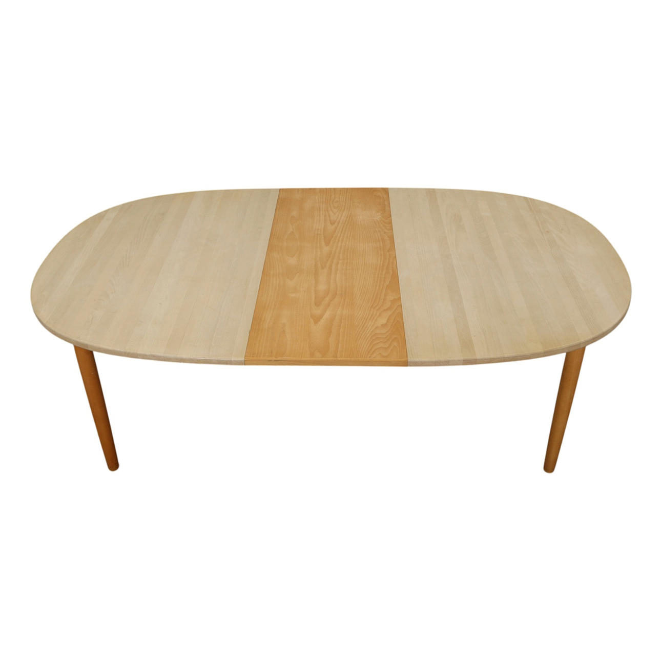 Oval dining table made of solid wood glued and soap-treated beech wood with pull-out. H. 69.5, L. 165, B. 125 cm. For this, one veneered additional plate without sarg, B. 49 cm. Support legs included.