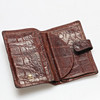 Leather wallet, lined checkered fabric. Button closure.