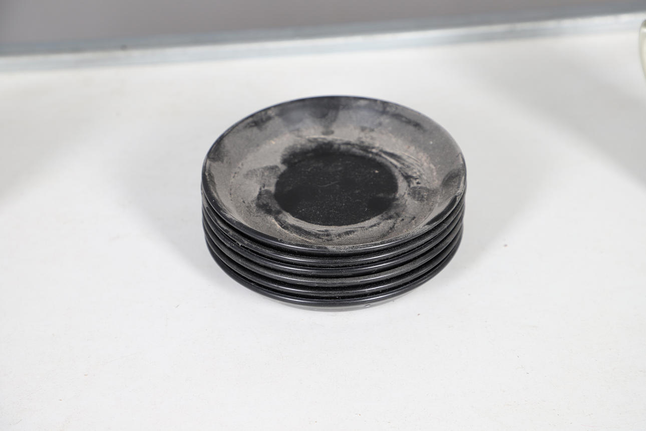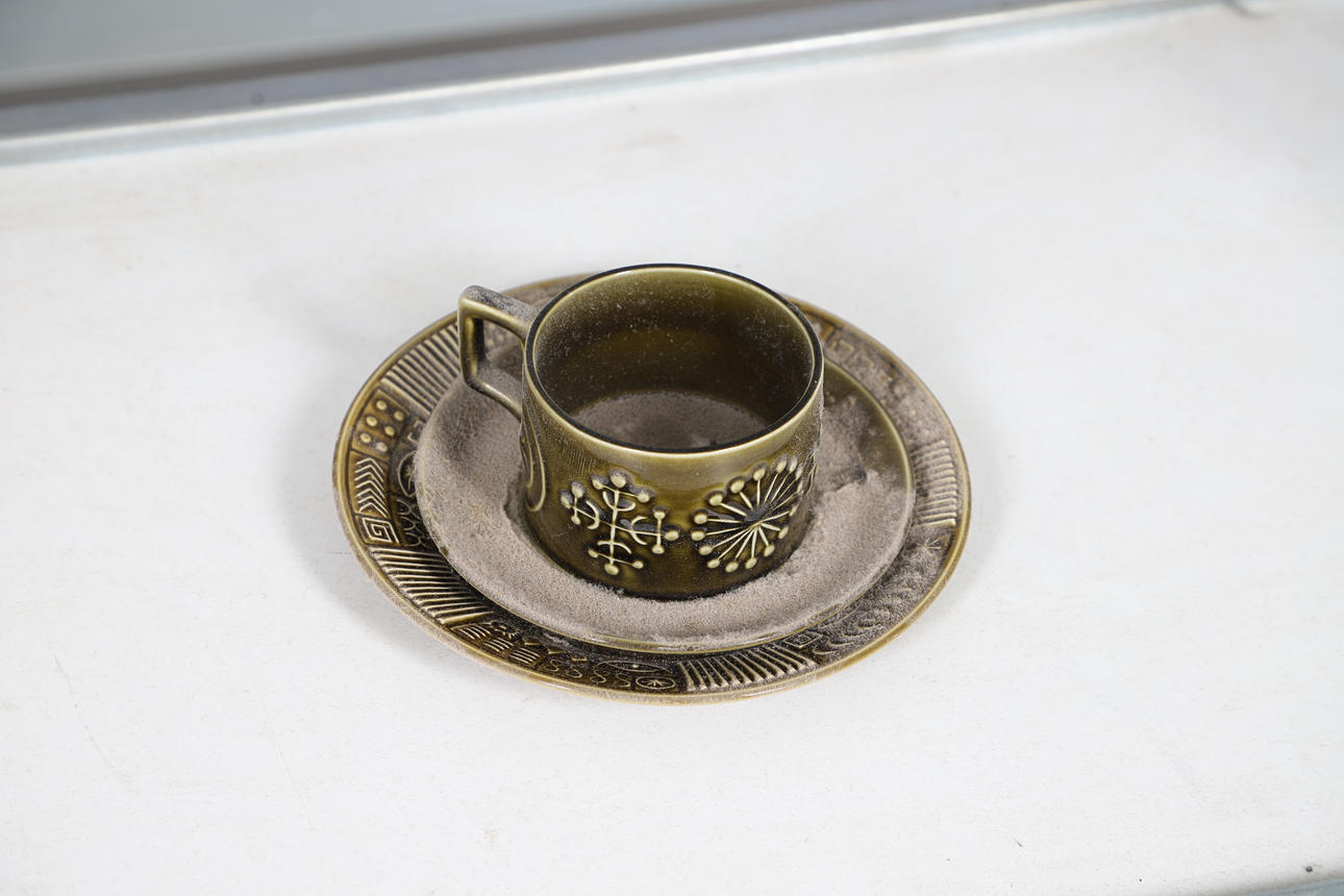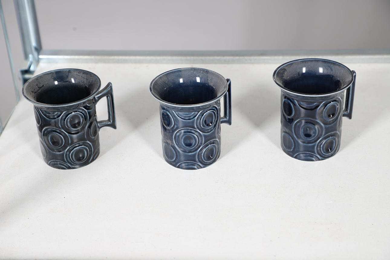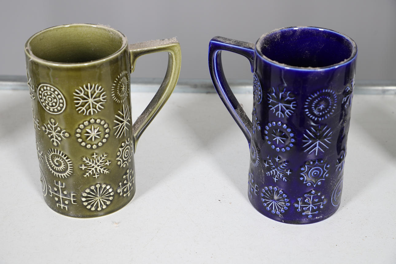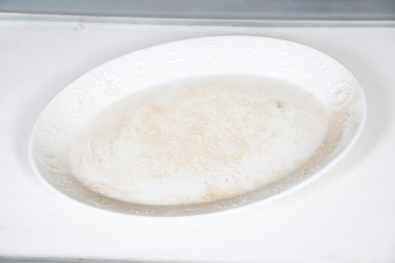 Overall condition good, needs cleaning, white plate very crazed and discoloured, wear to cork stoppers.