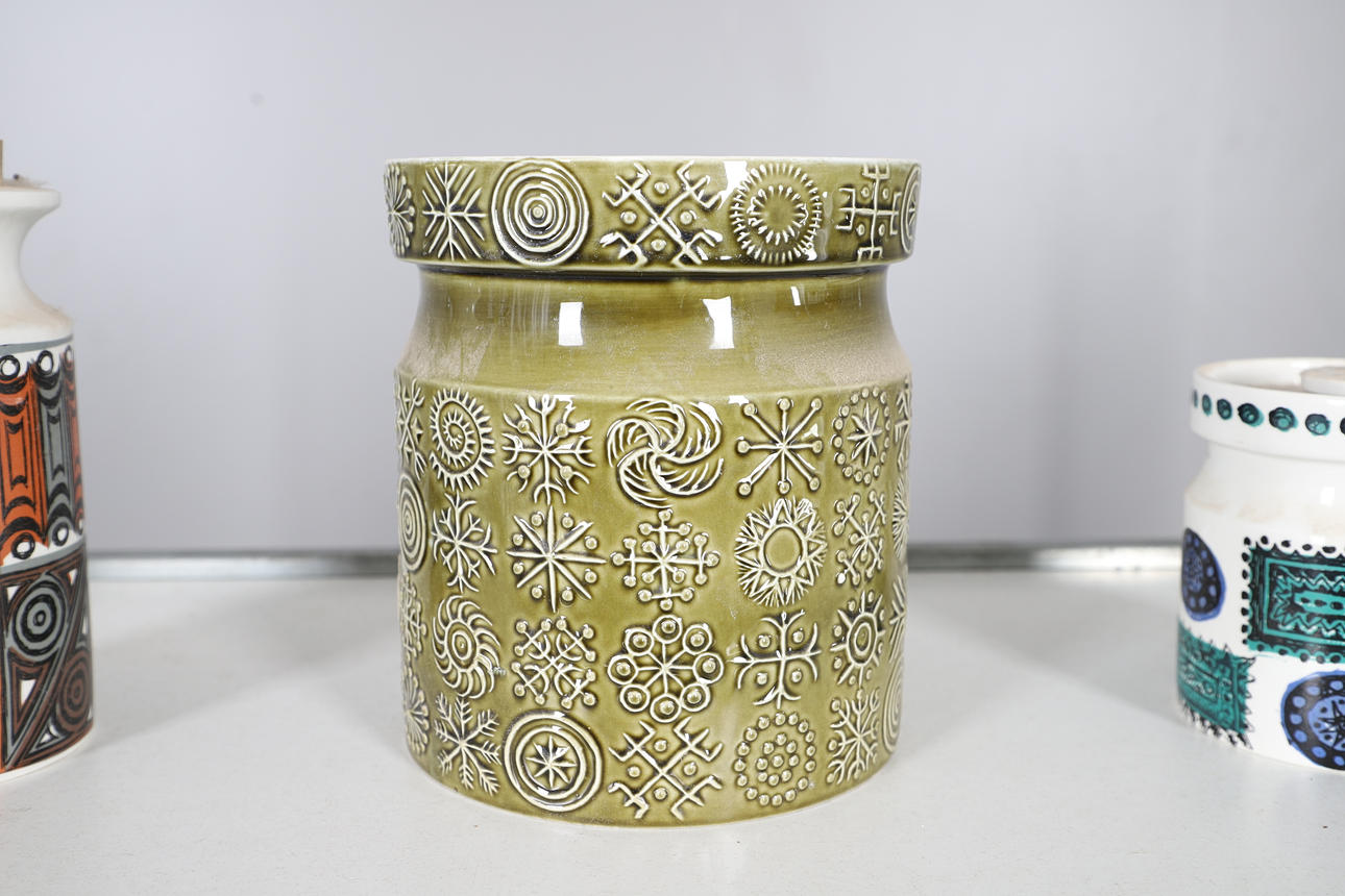 A Portmeirion green 'Totem' biscuit barrel, 20cm high x 17cm diameter, matching sugar pot and cover, jug, storage jar, cup and saucer, together with a white Totem serving plate, 38cm diameter, blue Totem jug, 'Talisman' pattern storage jar and lid, 'Variations' storage jar and cork, 'Jupiter' blue part coffee set etc.