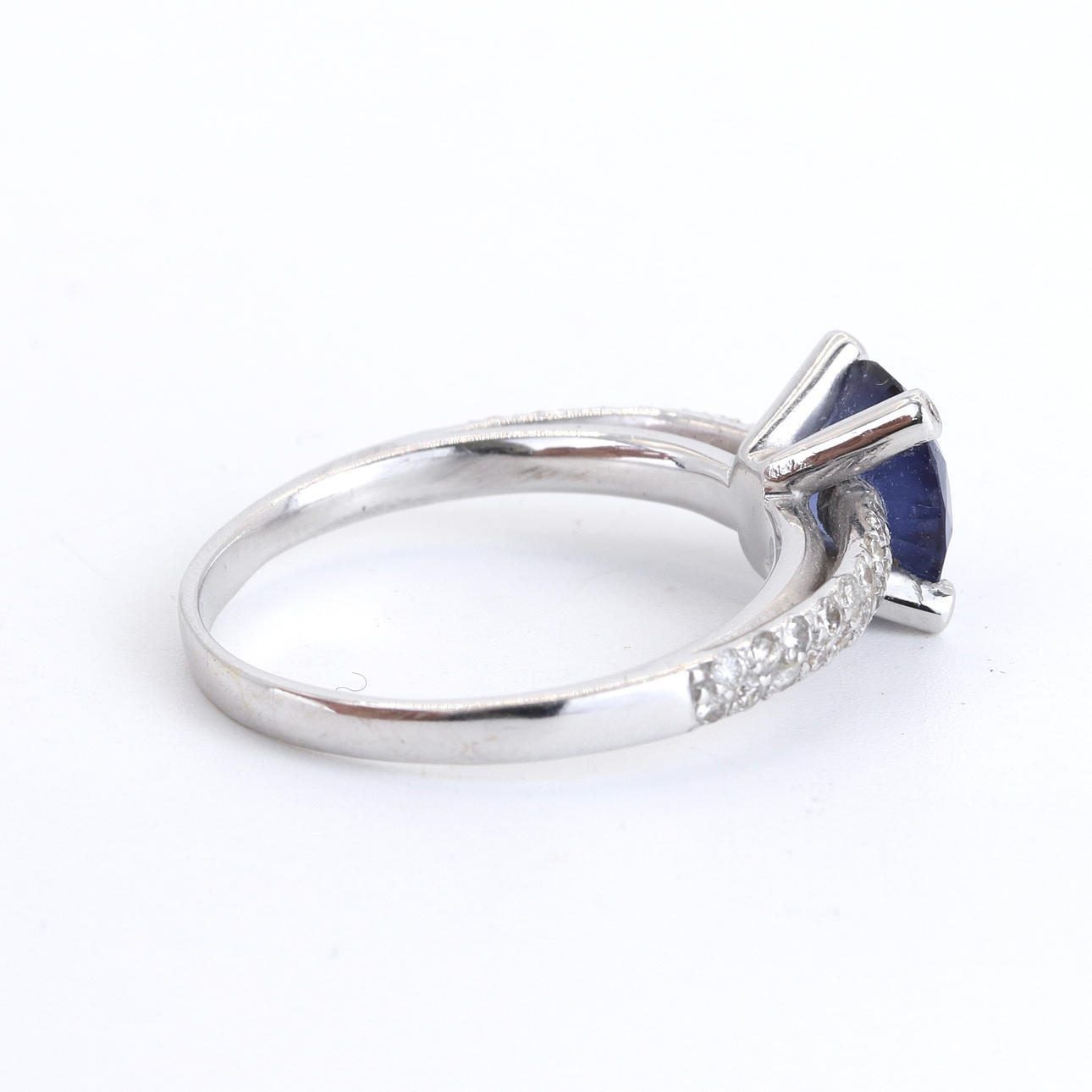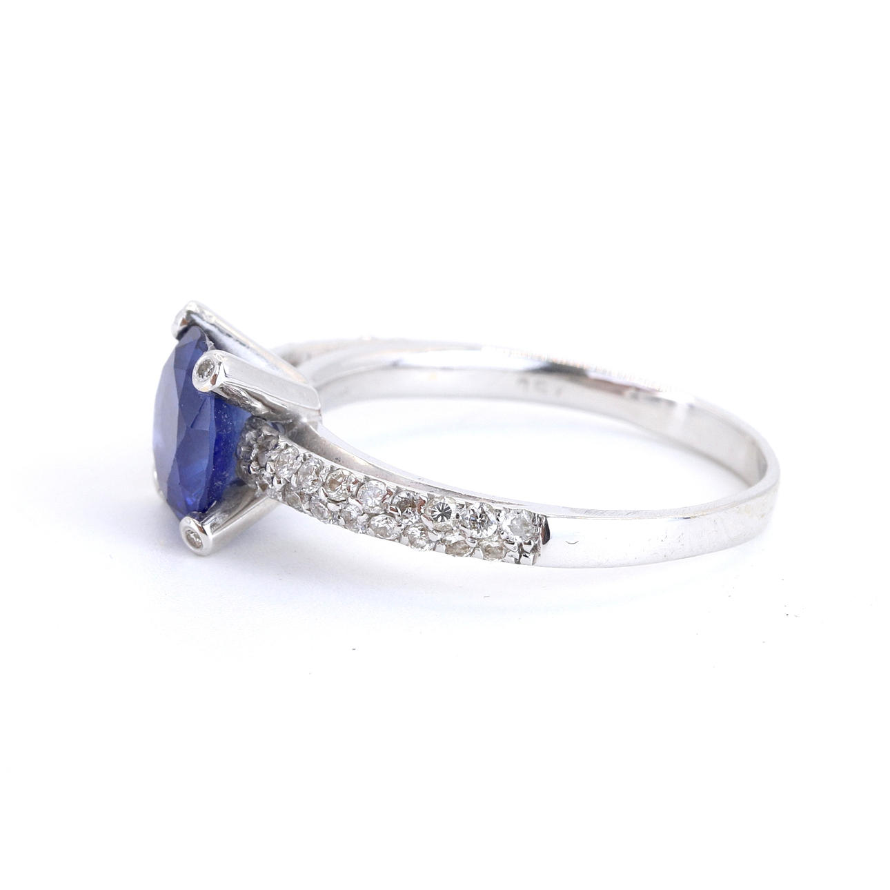 An 18ct white gold ring set with a rich blue sapphire and diamond shoulders. UK ring size Q.5.