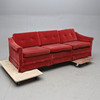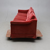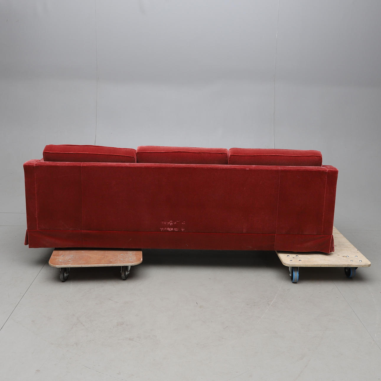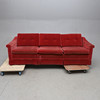 Textile upholstery. Loose cushions in the back and seat. Length ca 210, width 77, height 80 cm.
