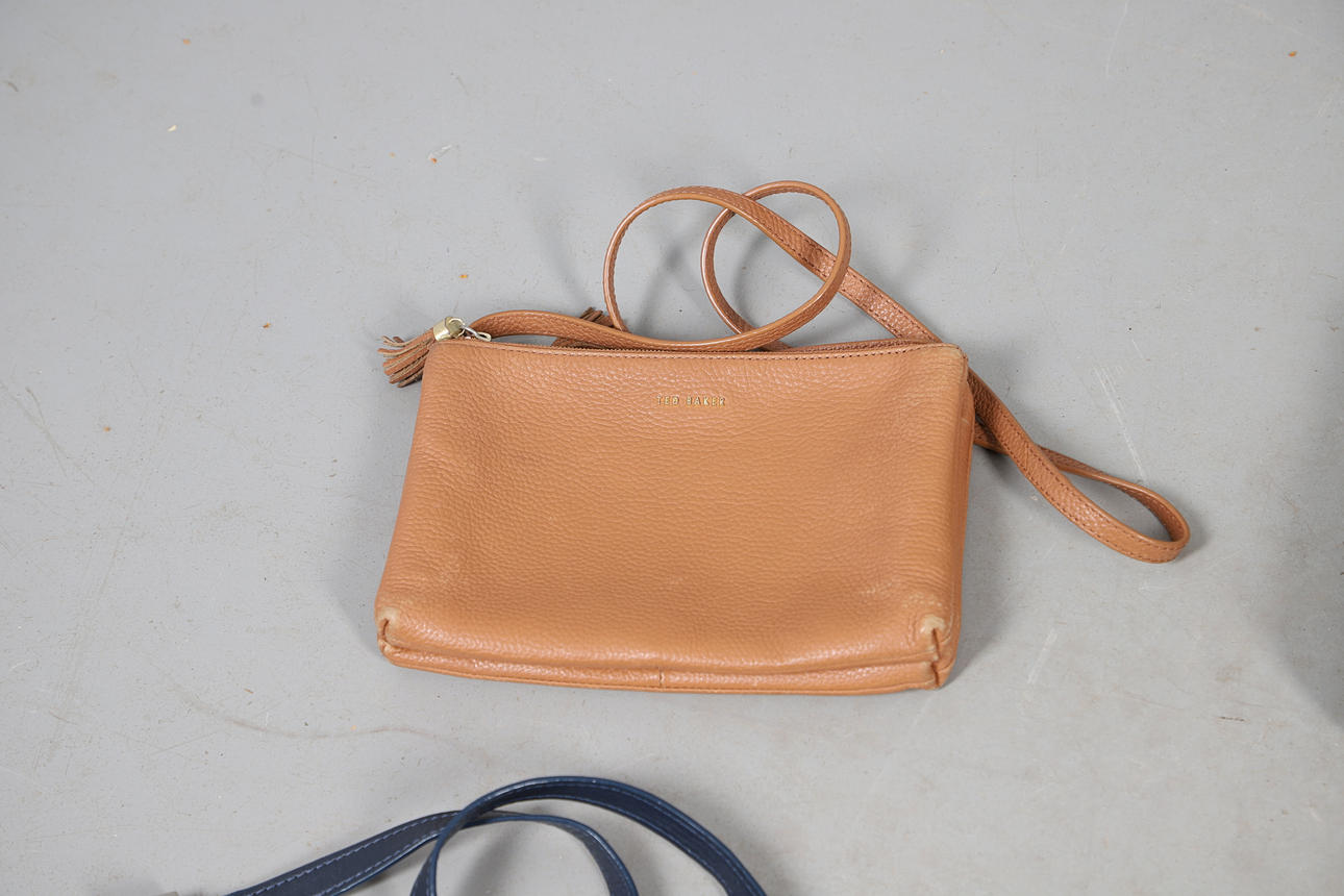Four Radley bags (two crossbody, lime green bag with stitched detail, canvas bag), a Radley leather purse with dustbag, Tula brown leather shoulder bag, 48cm (inc. strap) x 39cm, Ted Baker shoulder bag, two leather Hidedesign bags.