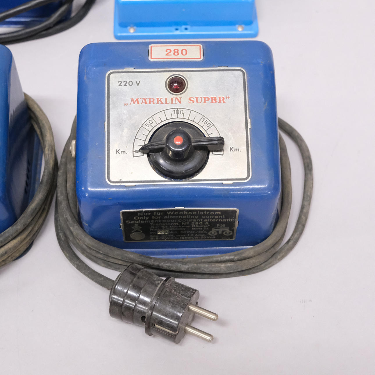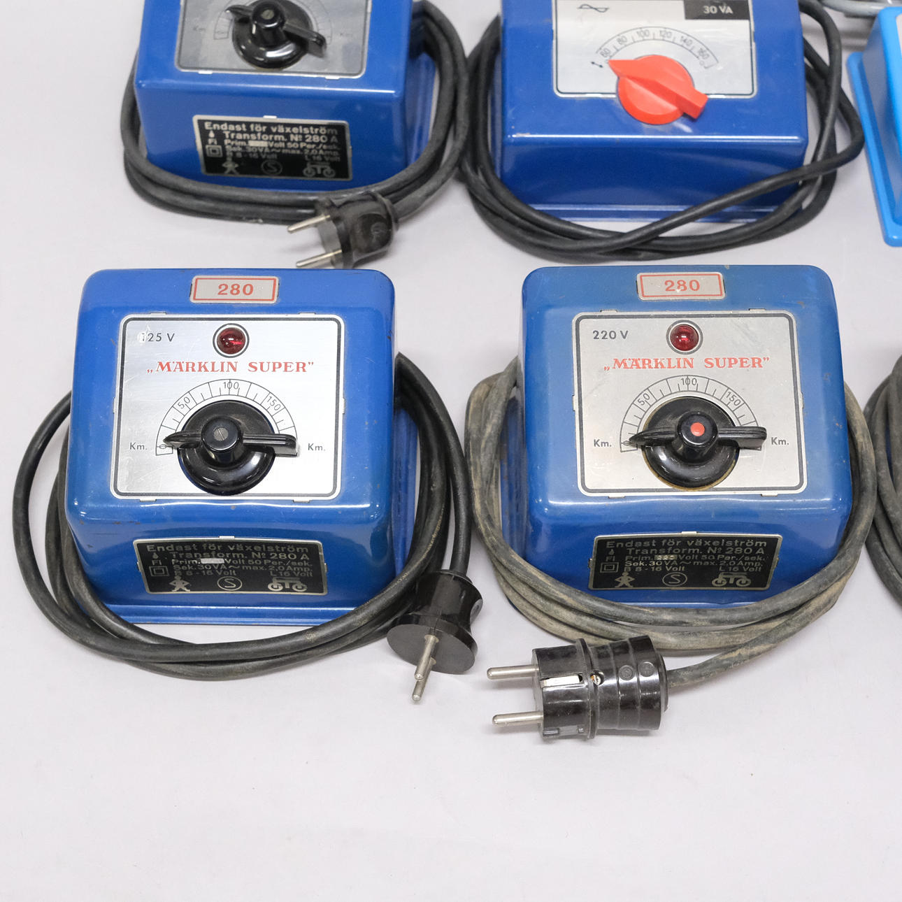 Three “Märklin Super”, 220V. A “Märklin Super”, 125V. A 30VA. A 10VA.
