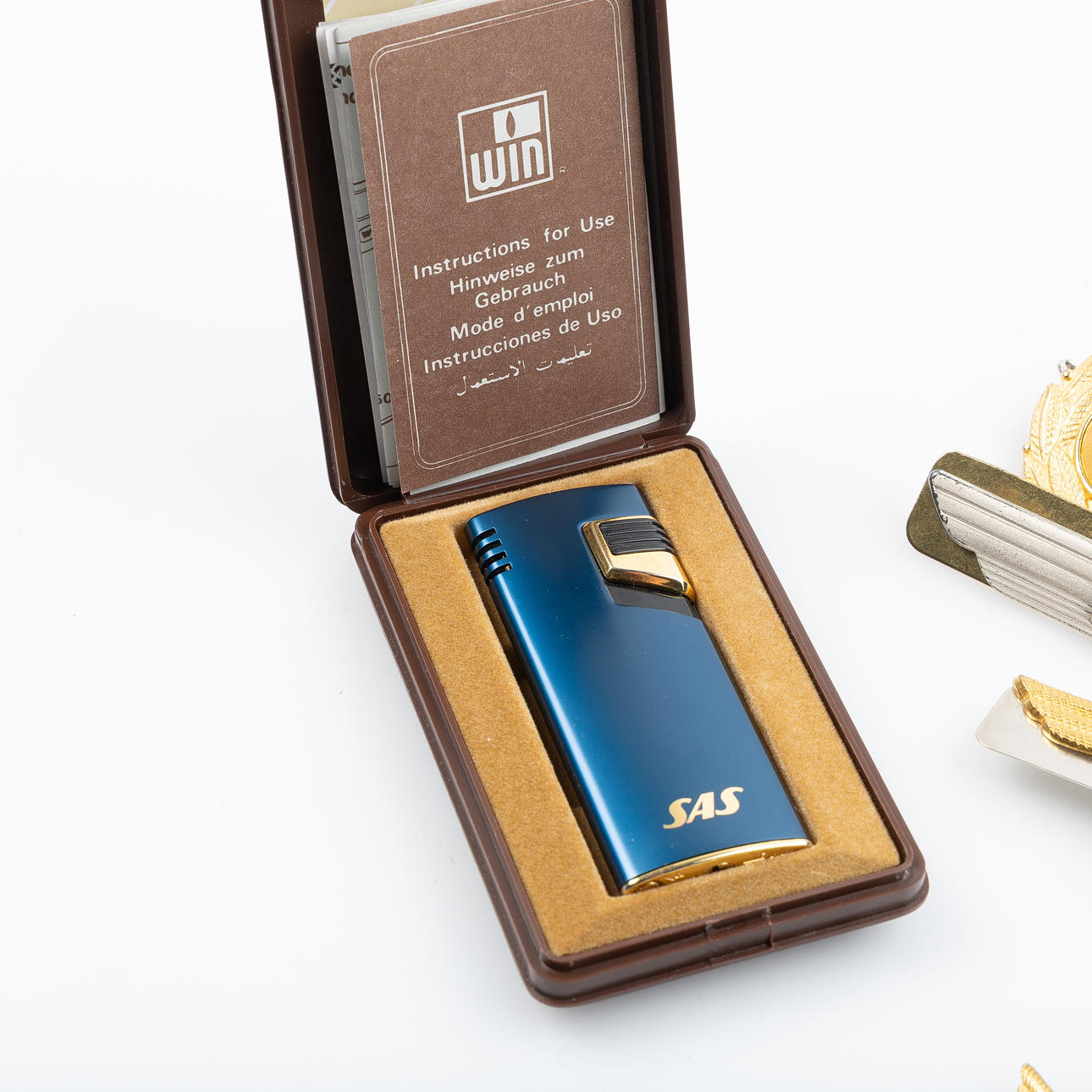 Advertising lighters from Wim International with SAS logo. Cap plates and uniform badges.