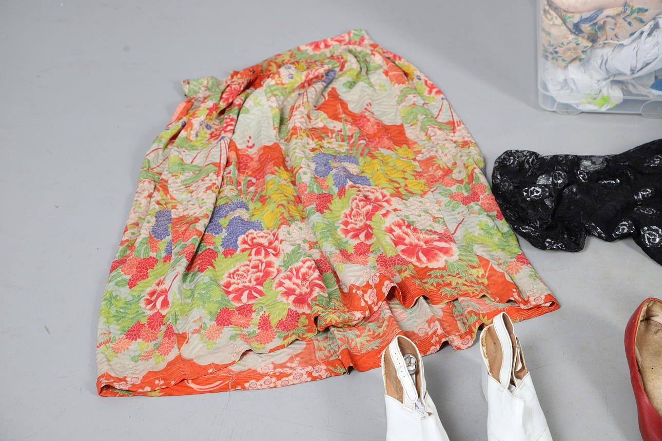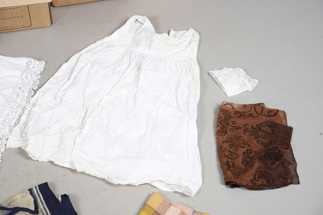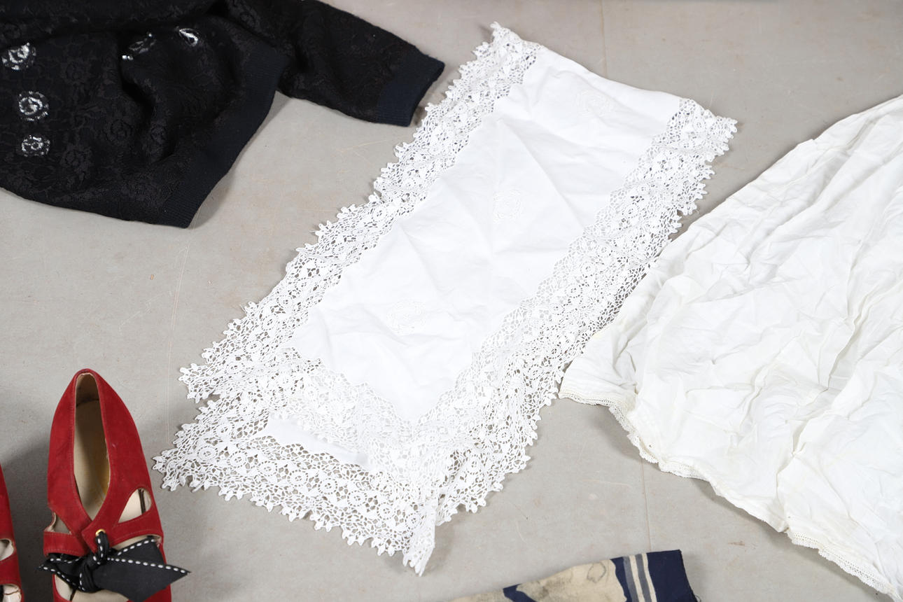 A quantity of vintage clothes and assorted textiles, to include pairs of ladies shoes, clothes and scarfs. Together with a large quantity of assorted textiles, including lace, linen, and other fabrics, to also include rolls of wallpaper. Size of largest box, 43cm (h) x 54cm x 53cm. (3).