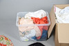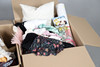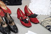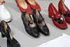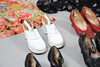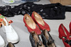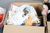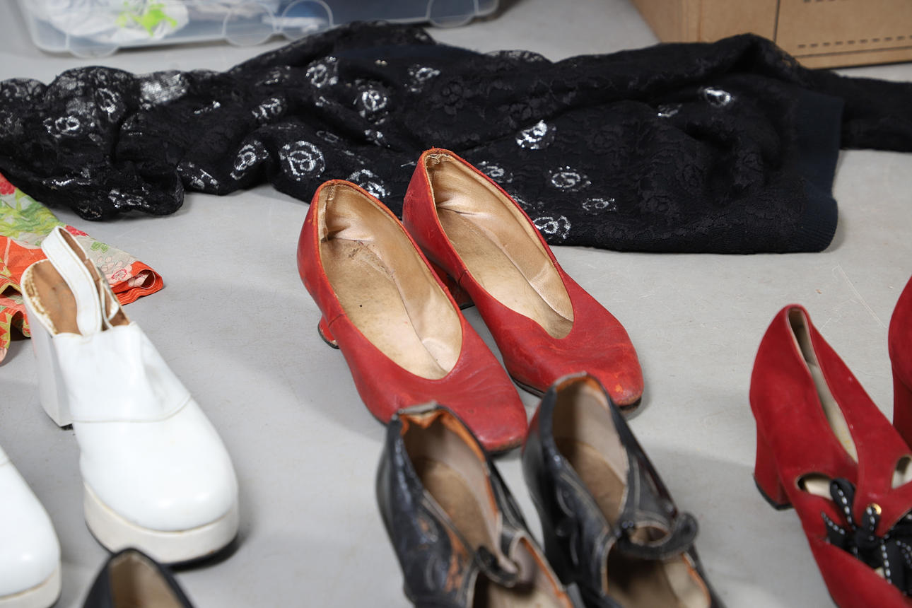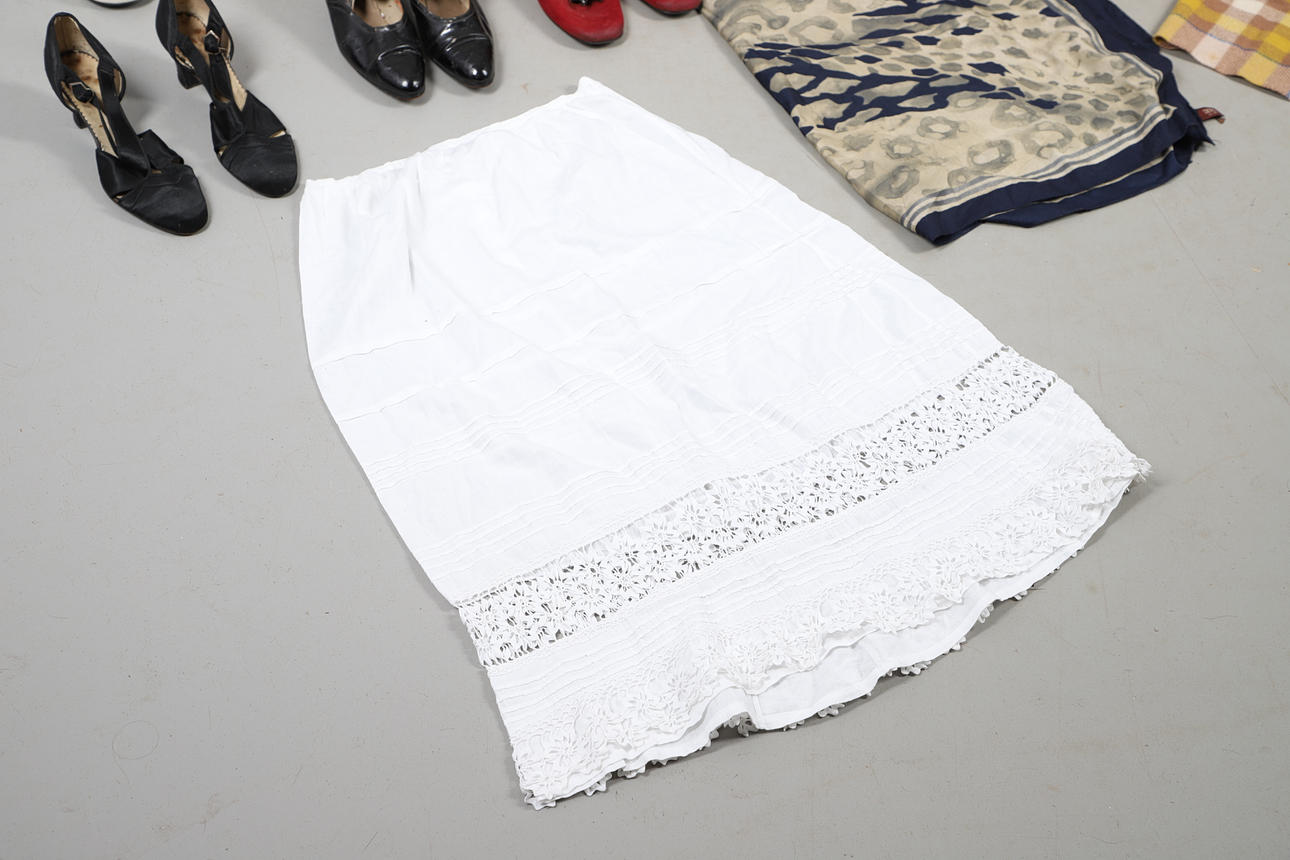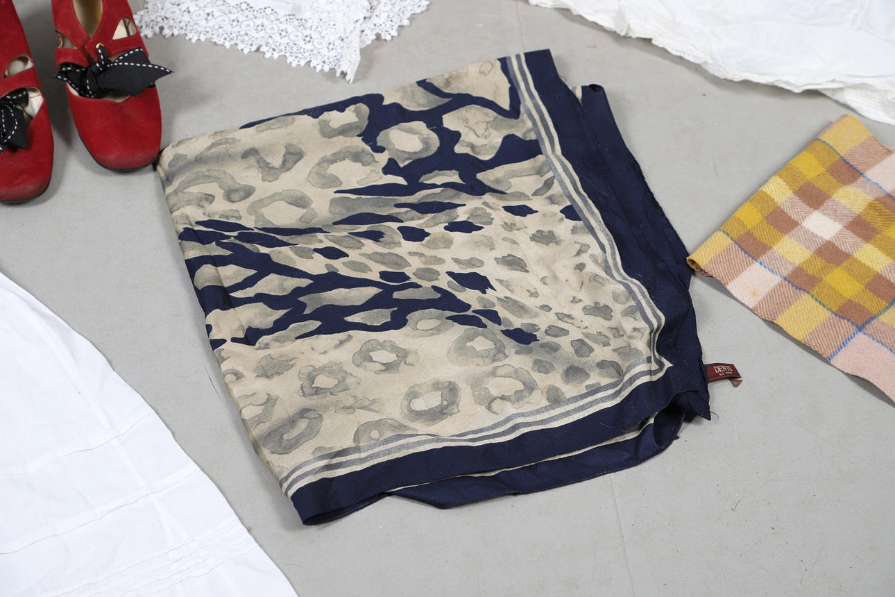 A quantity of vintage clothes and assorted textiles, to include pairs of ladies shoes, clothes and scarfs. Together with a large quantity of assorted textiles, including lace, linen, and other fabrics, to also include rolls of wallpaper. Size of largest box, 43cm (h) x 54cm x 53cm. (3).