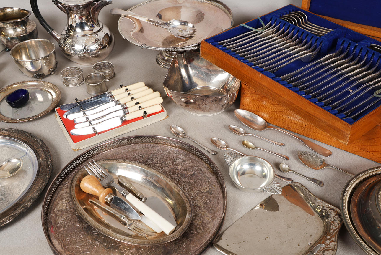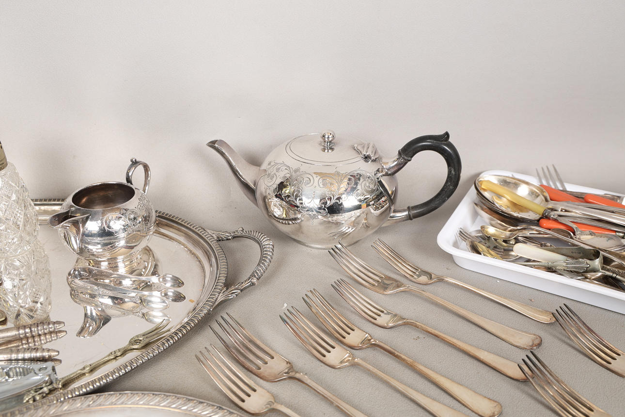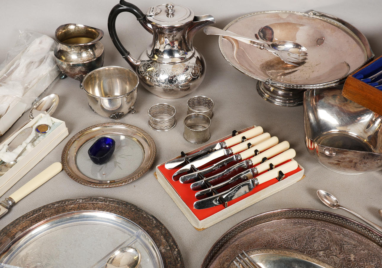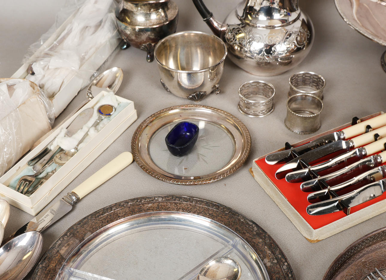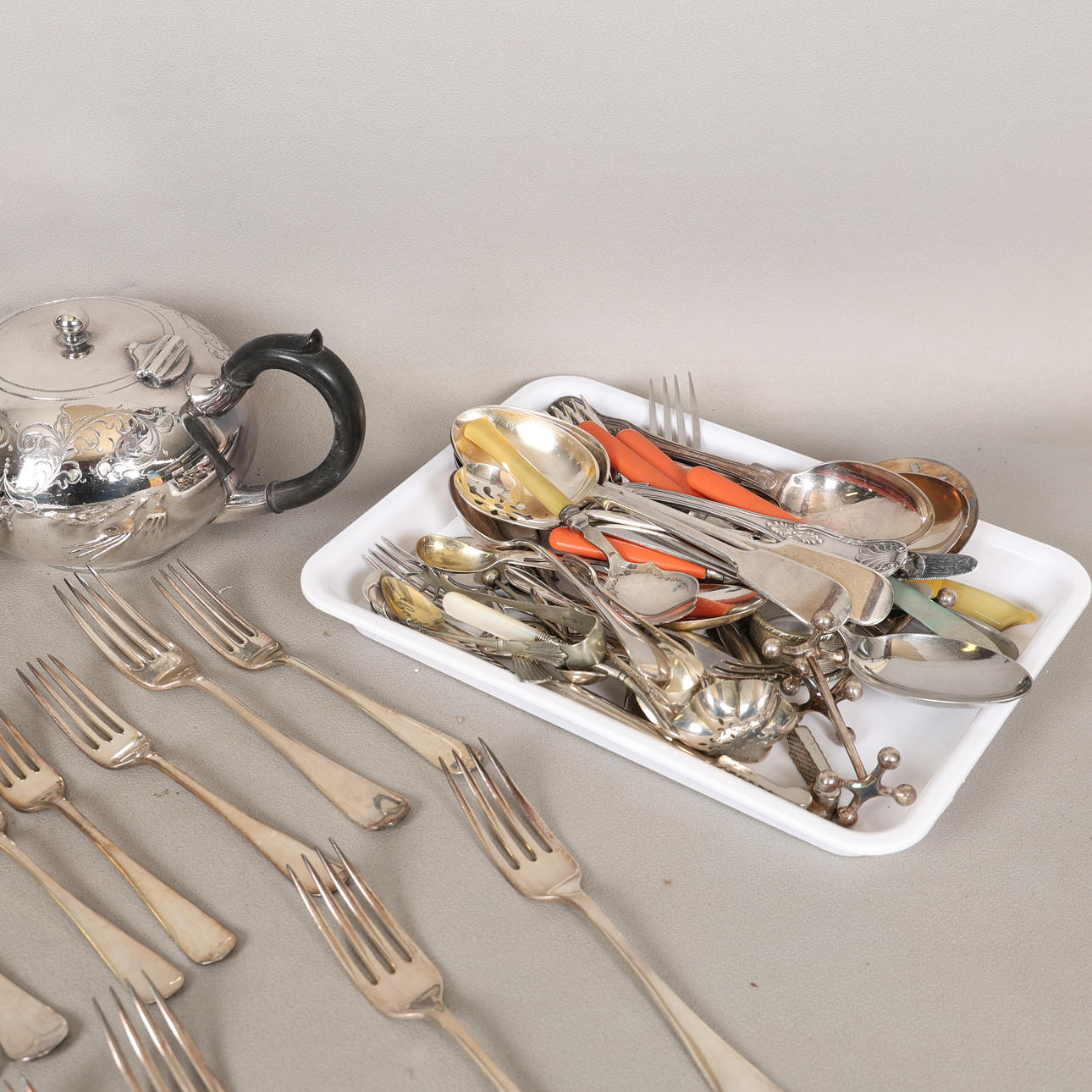 To include a canteen of cutlery, various tray, teapots, loose cutlery etc,the largest 15cm high (qty).