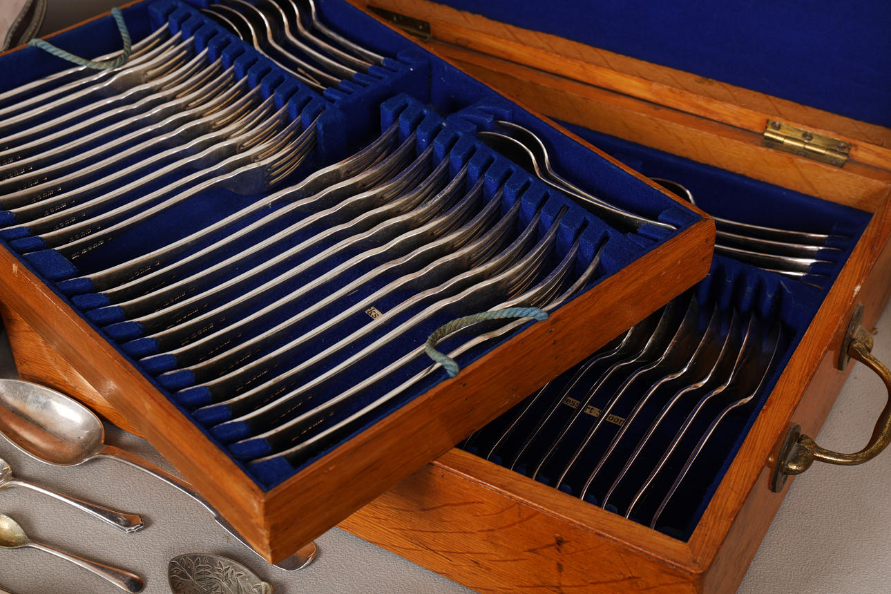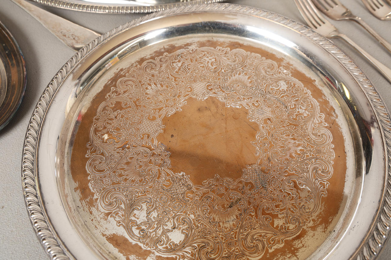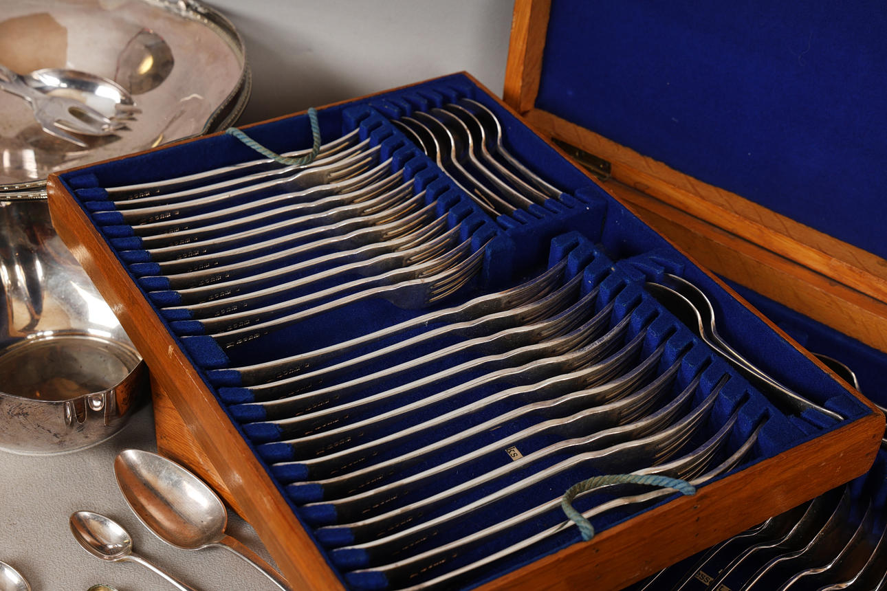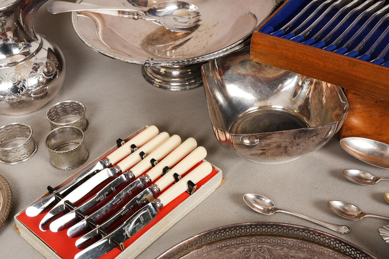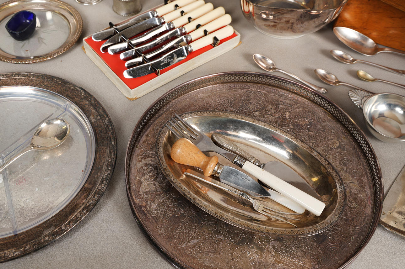 To include a canteen of cutlery, various tray, teapots, loose cutlery etc,the largest 15cm high (qty).