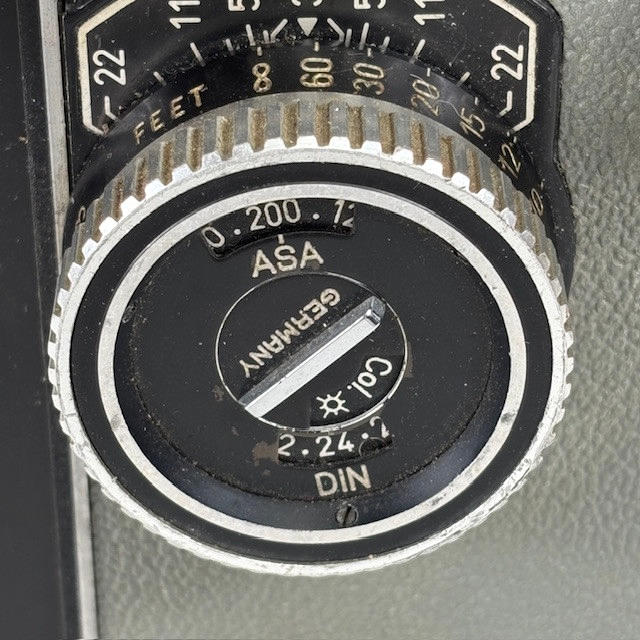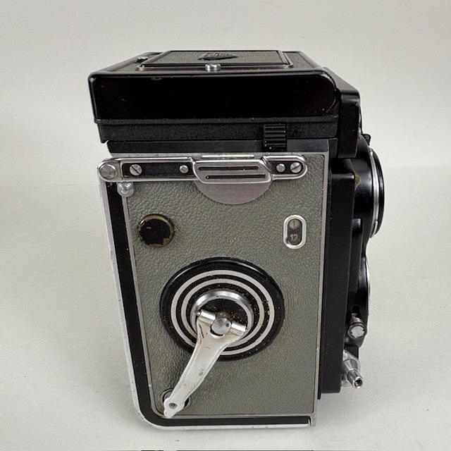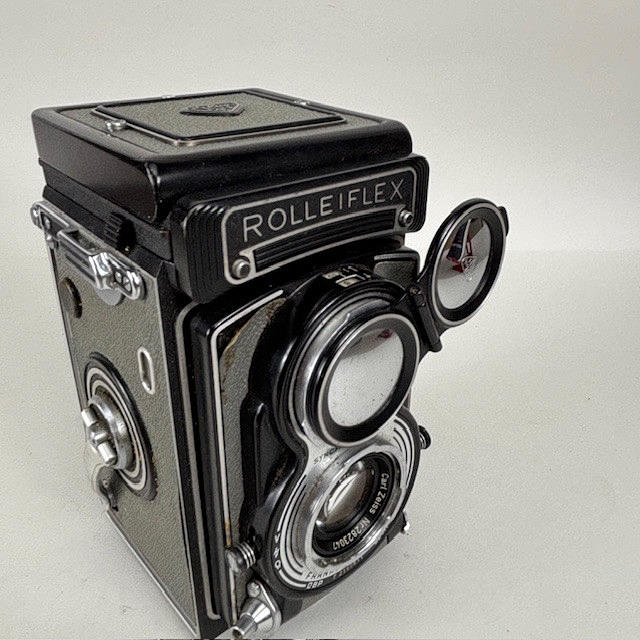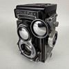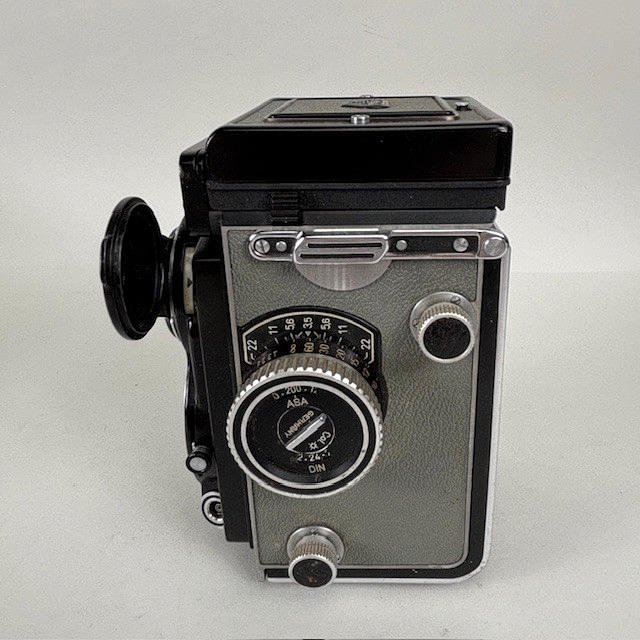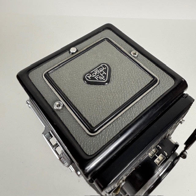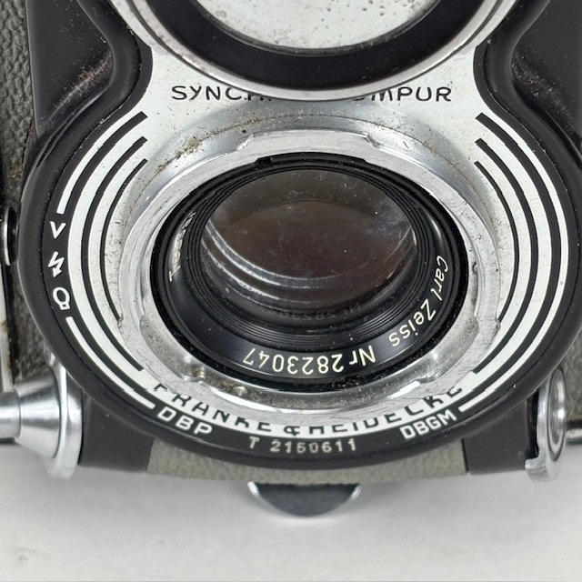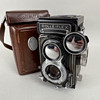 Vintage Rolleiflex Franke & Heidecke 1:3.5 F 75mm Synchro Compur, black body Nr 4190276, with brown leather case.