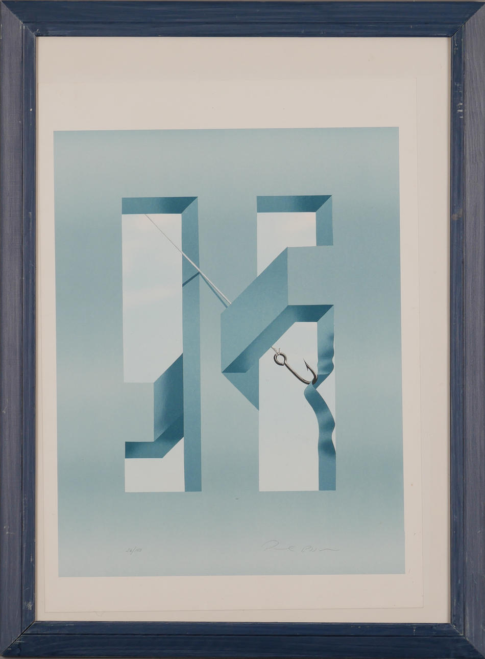 4985625. OIDENTIFIERAD KONSTNÄR. Impossible figure with fishing hook, color lithograph, signed.