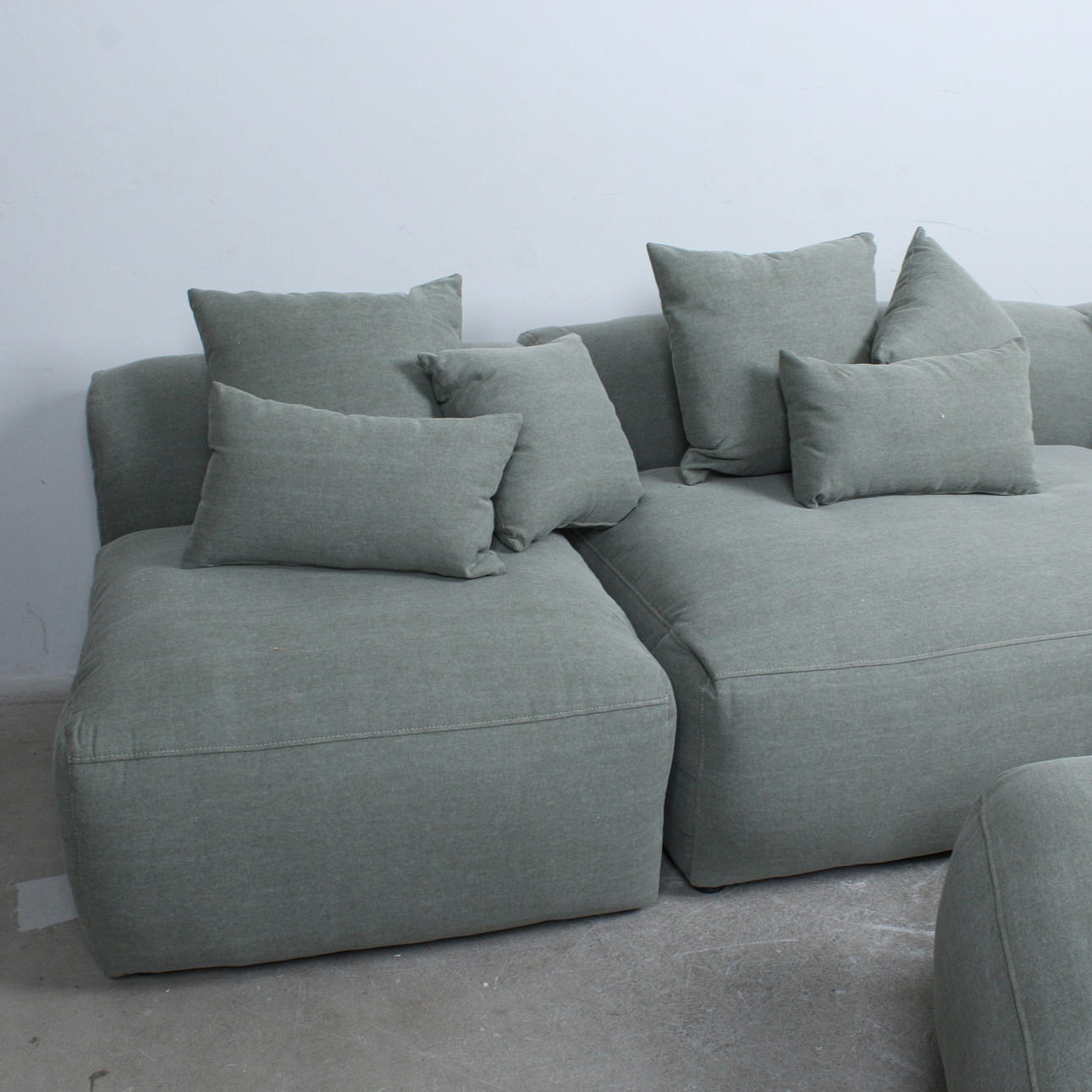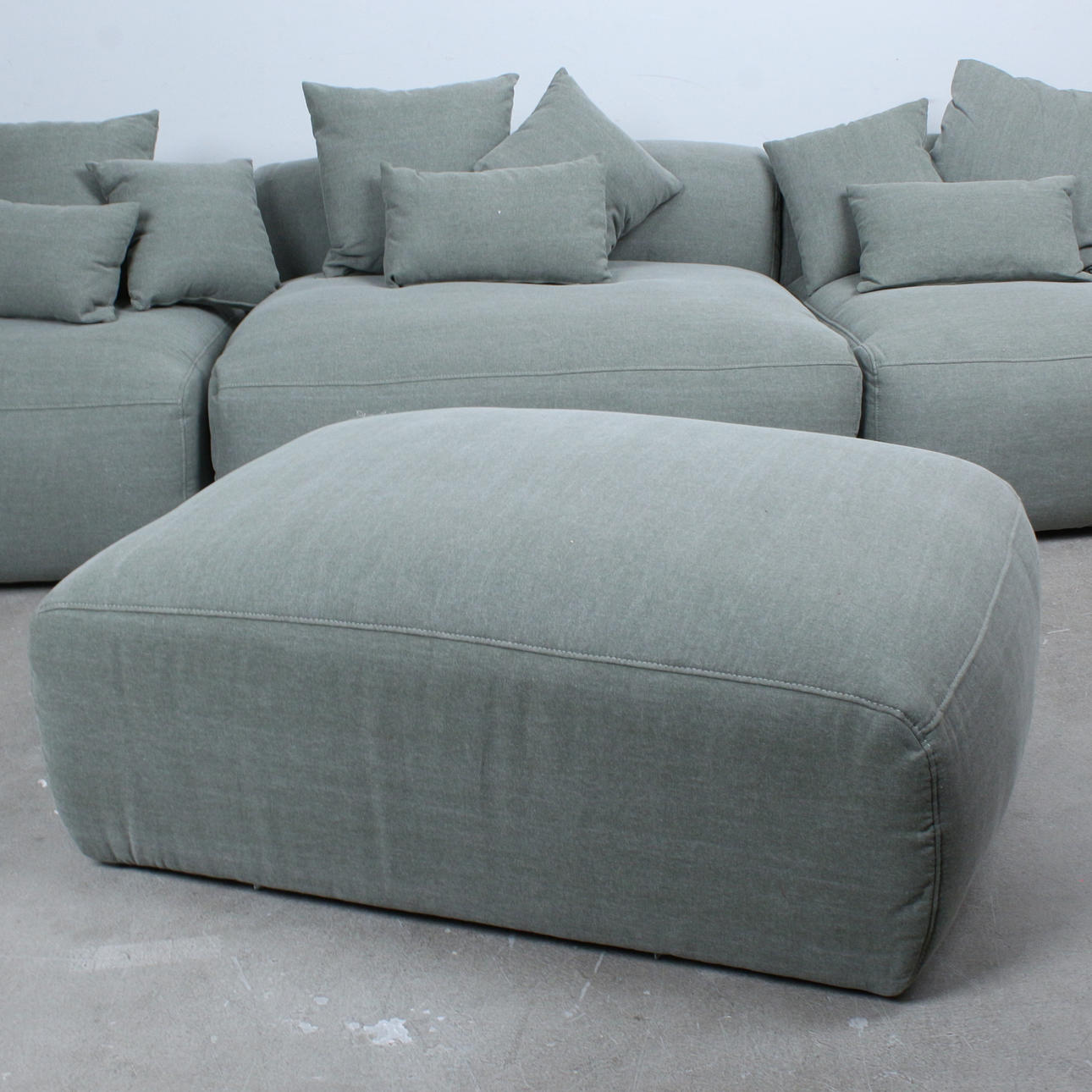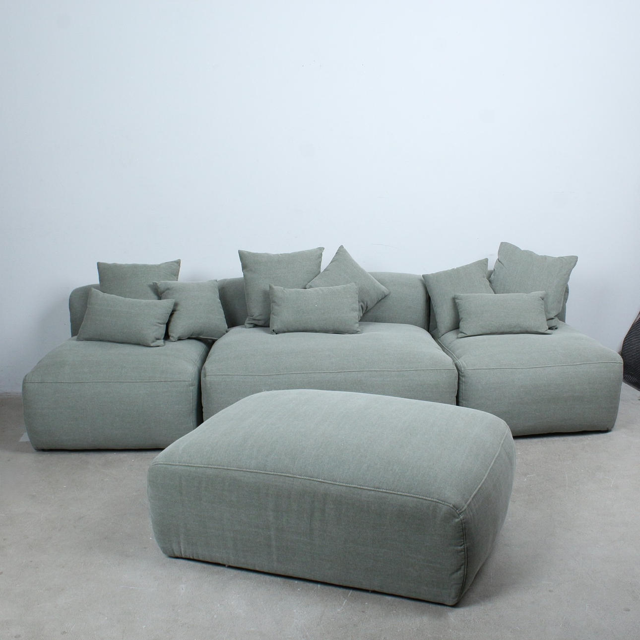 Primavera, 3-piece modular sofa and stool with 9 cushions, fabric. . Wooden construction with grey-green fabric upholstery.