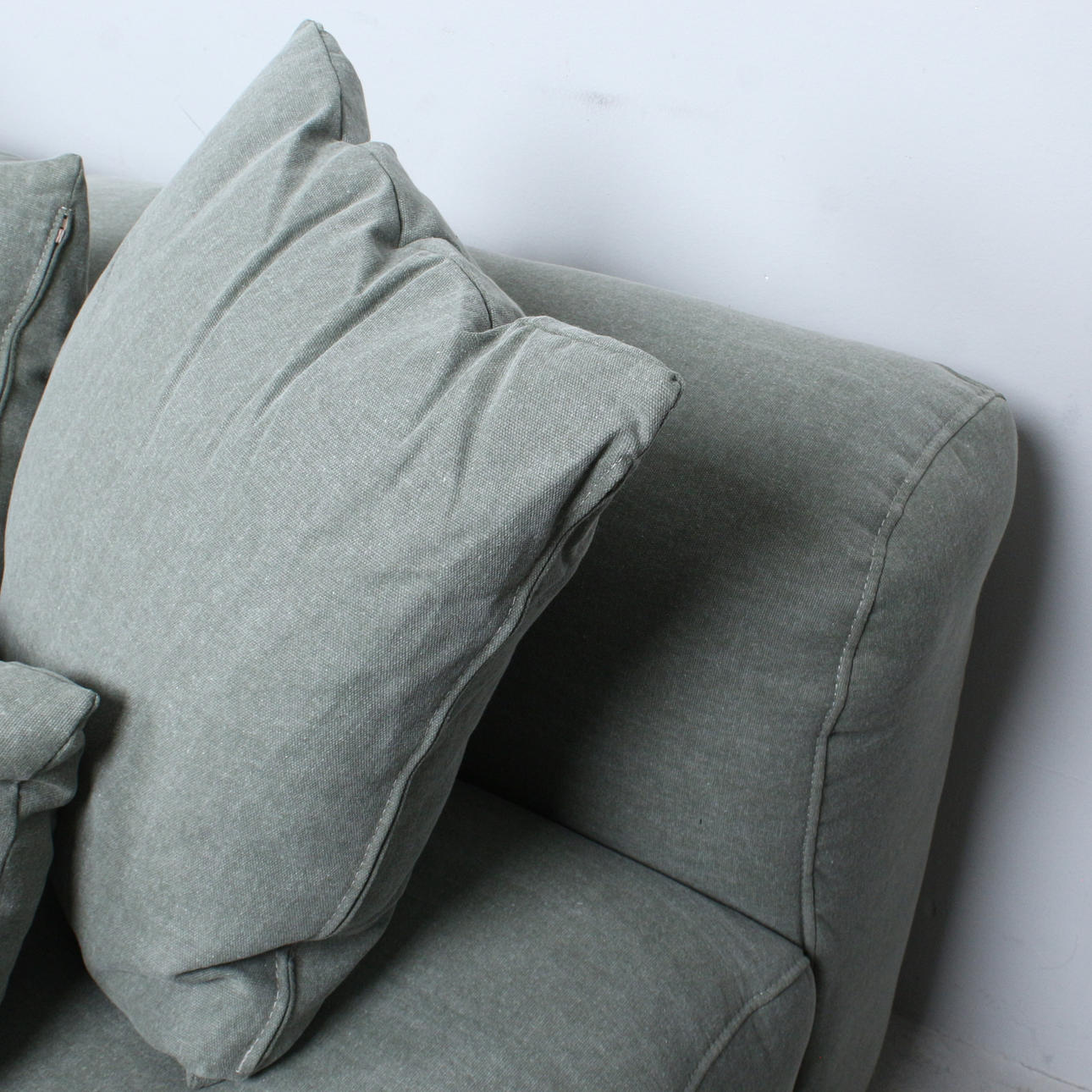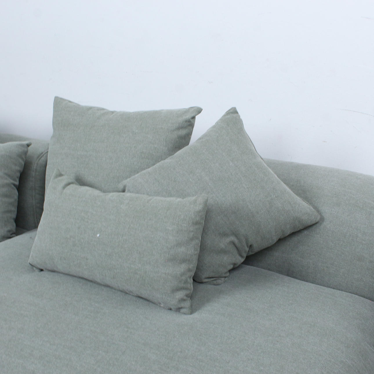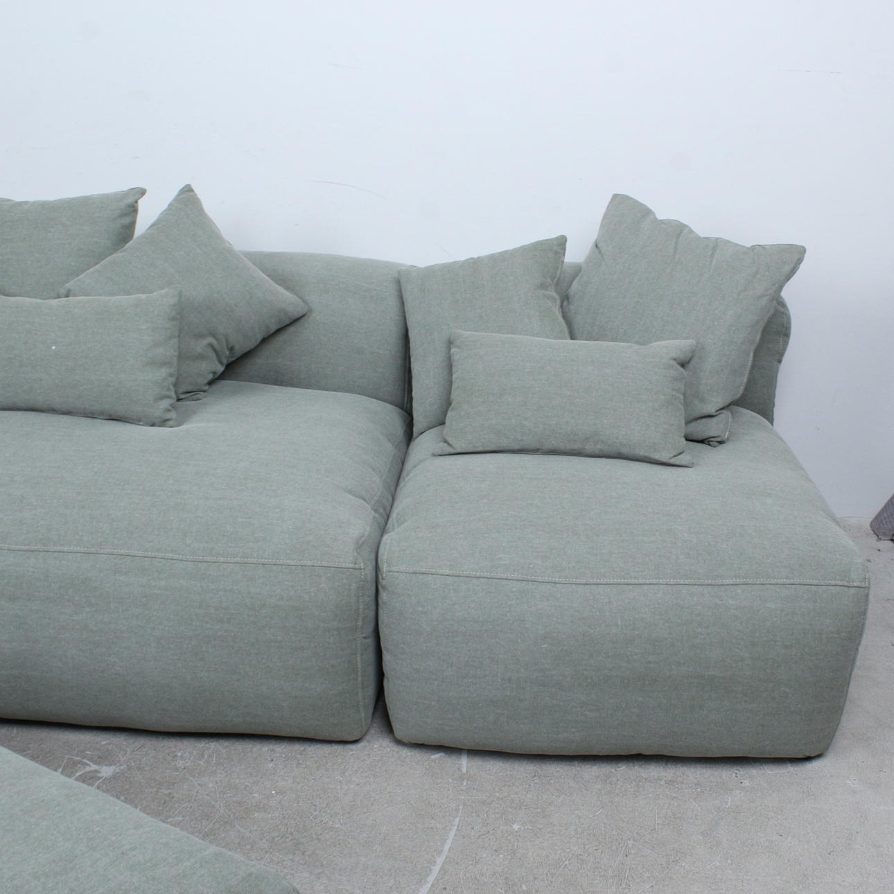 Primavera, 3-piece modular sofa and stool with 9 cushions, fabric. . Wooden construction with grey-green fabric upholstery.