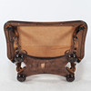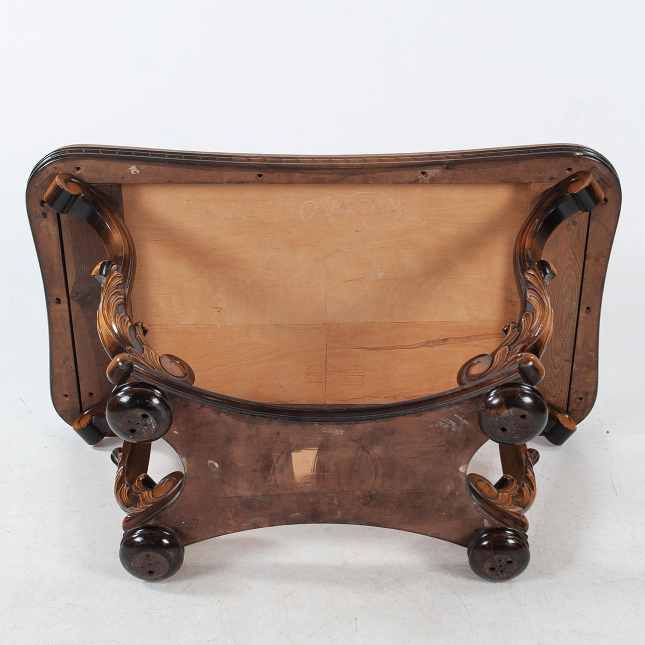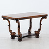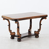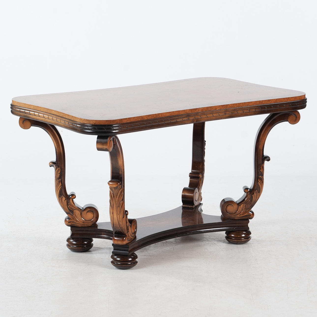 table in walnut veneer with veining and high gloss surface. Tapered disc with rounded corners, canneling along the edge. Flared legs with sculpted details and lower shelf. Height 62 cm, length 107 cm, width 63 cm.