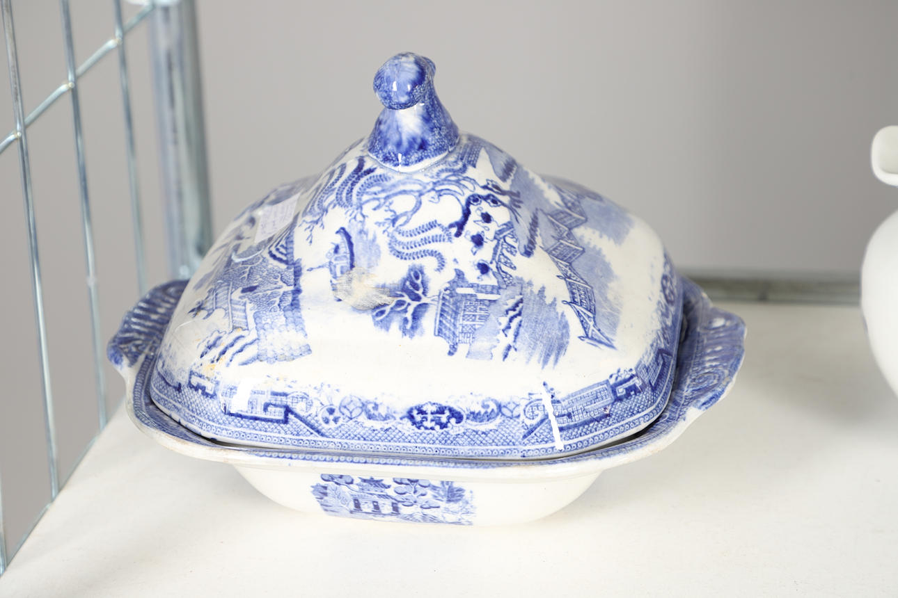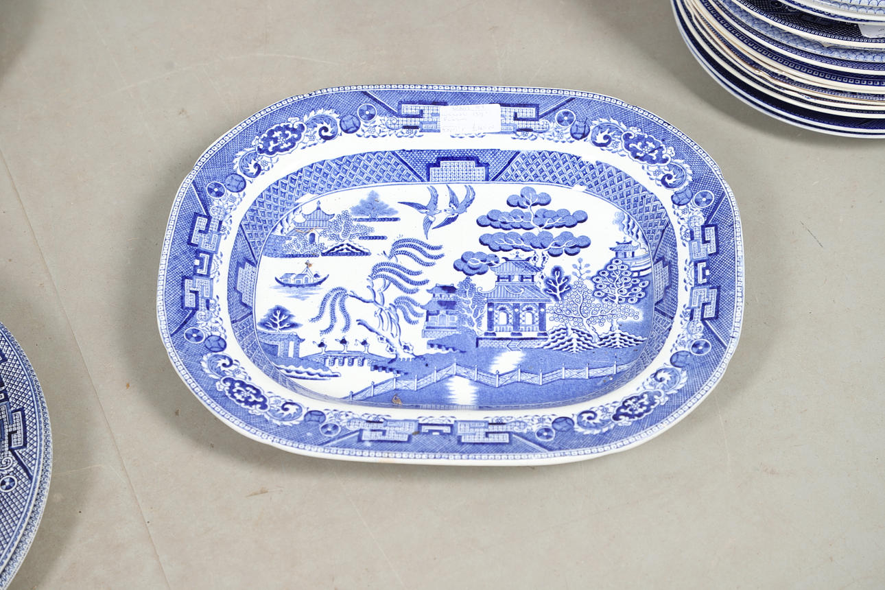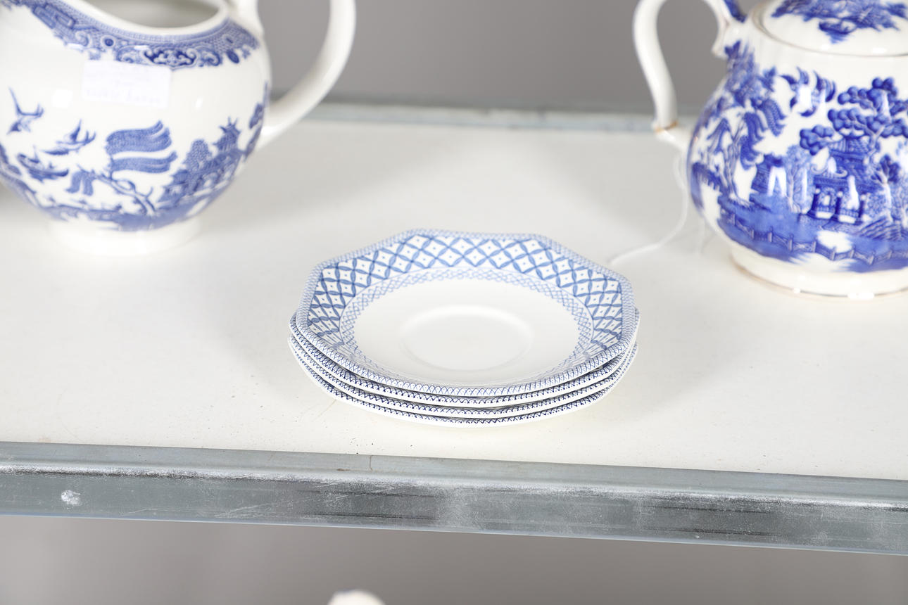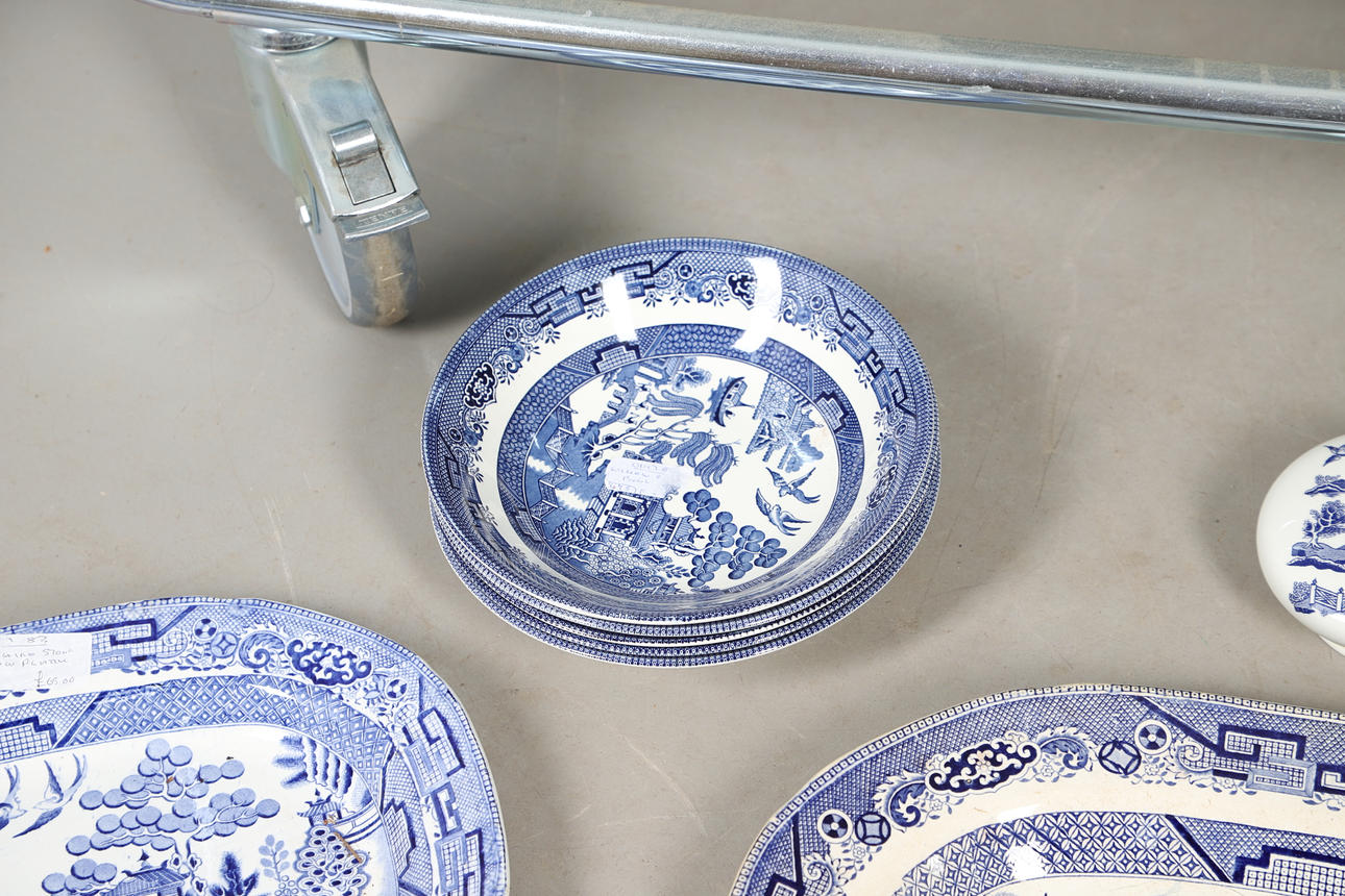 A LARGE QUANTITY OF BLUE AND WHITE WILLOW PATTERN TABLEWARE.