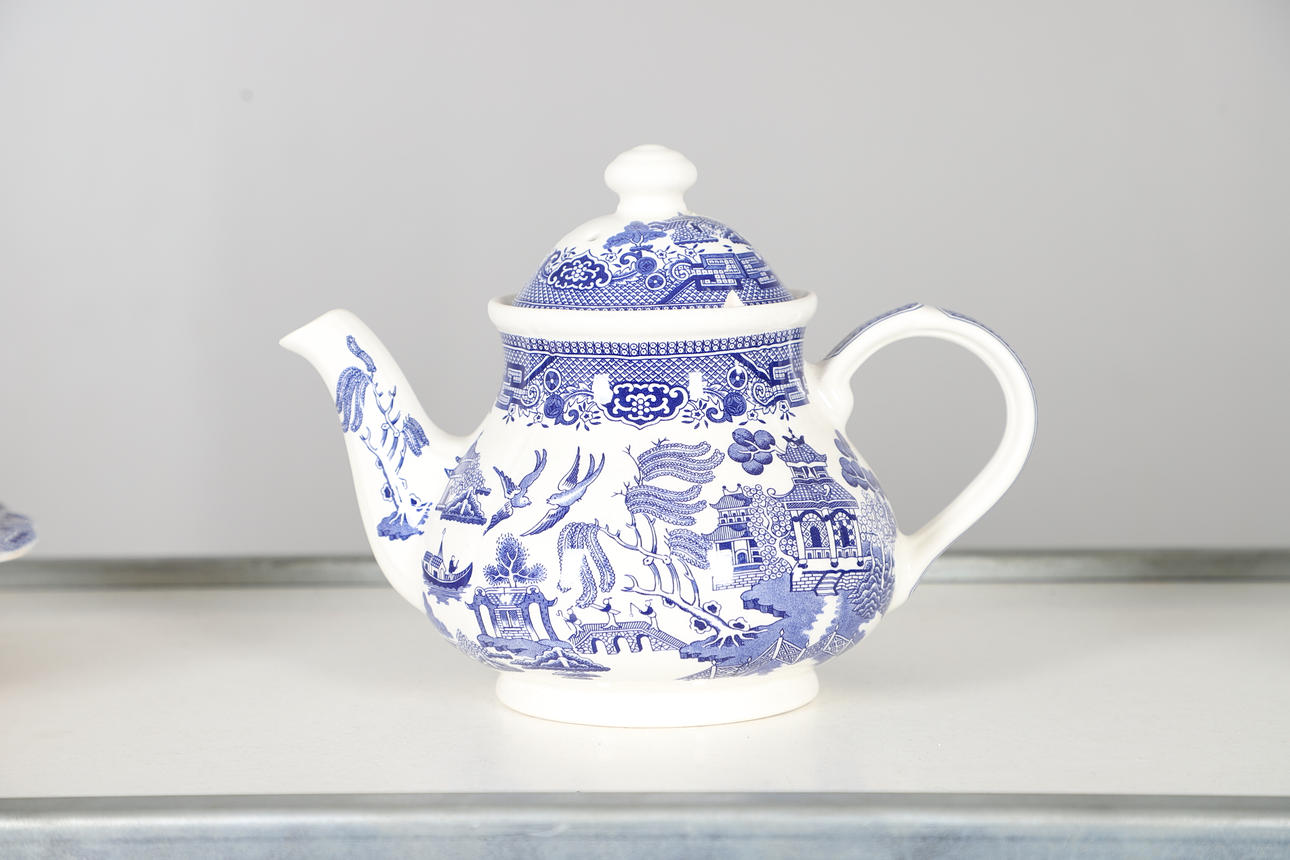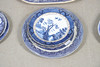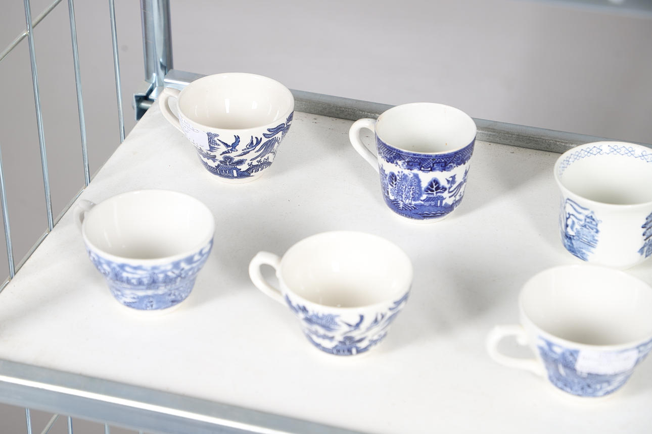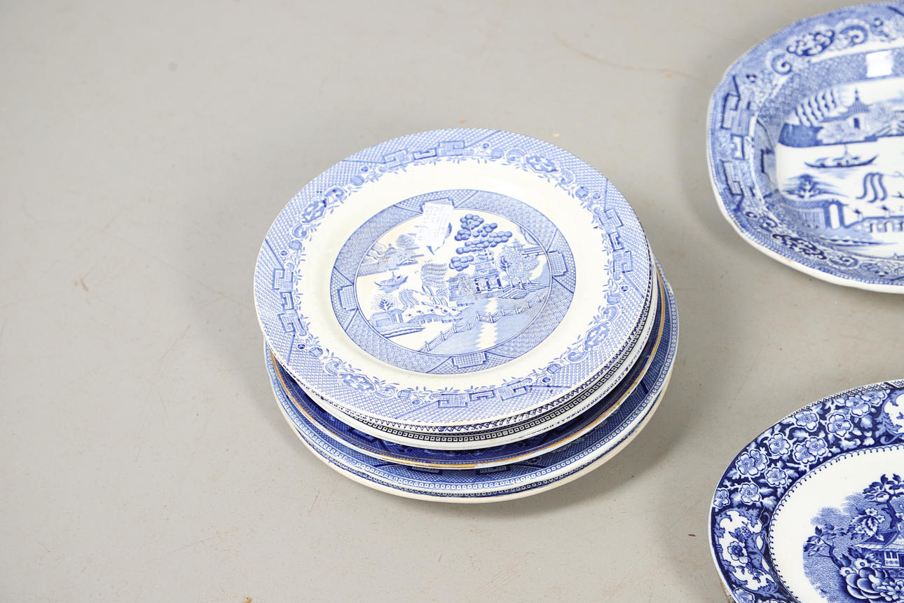 A LARGE QUANTITY OF BLUE AND WHITE WILLOW PATTERN TABLEWARE.