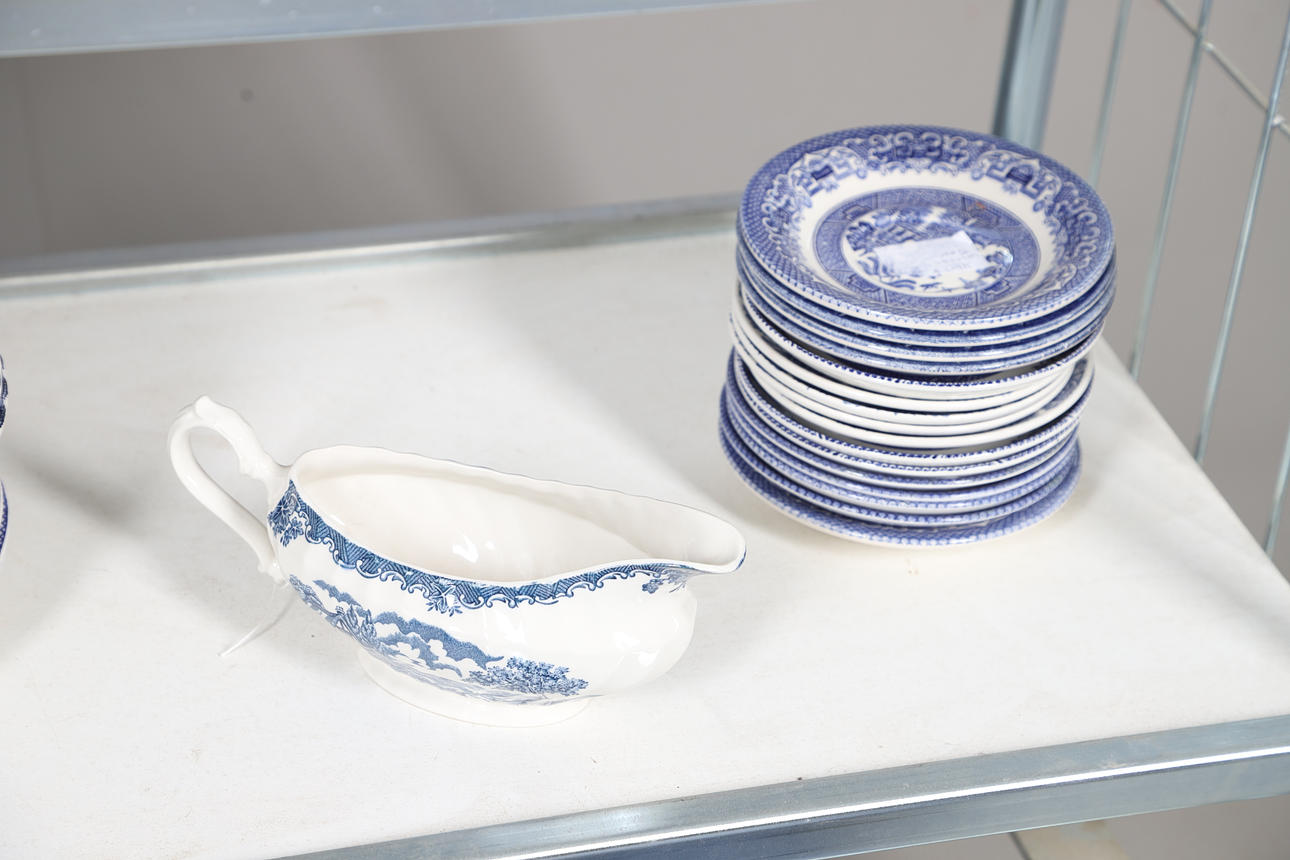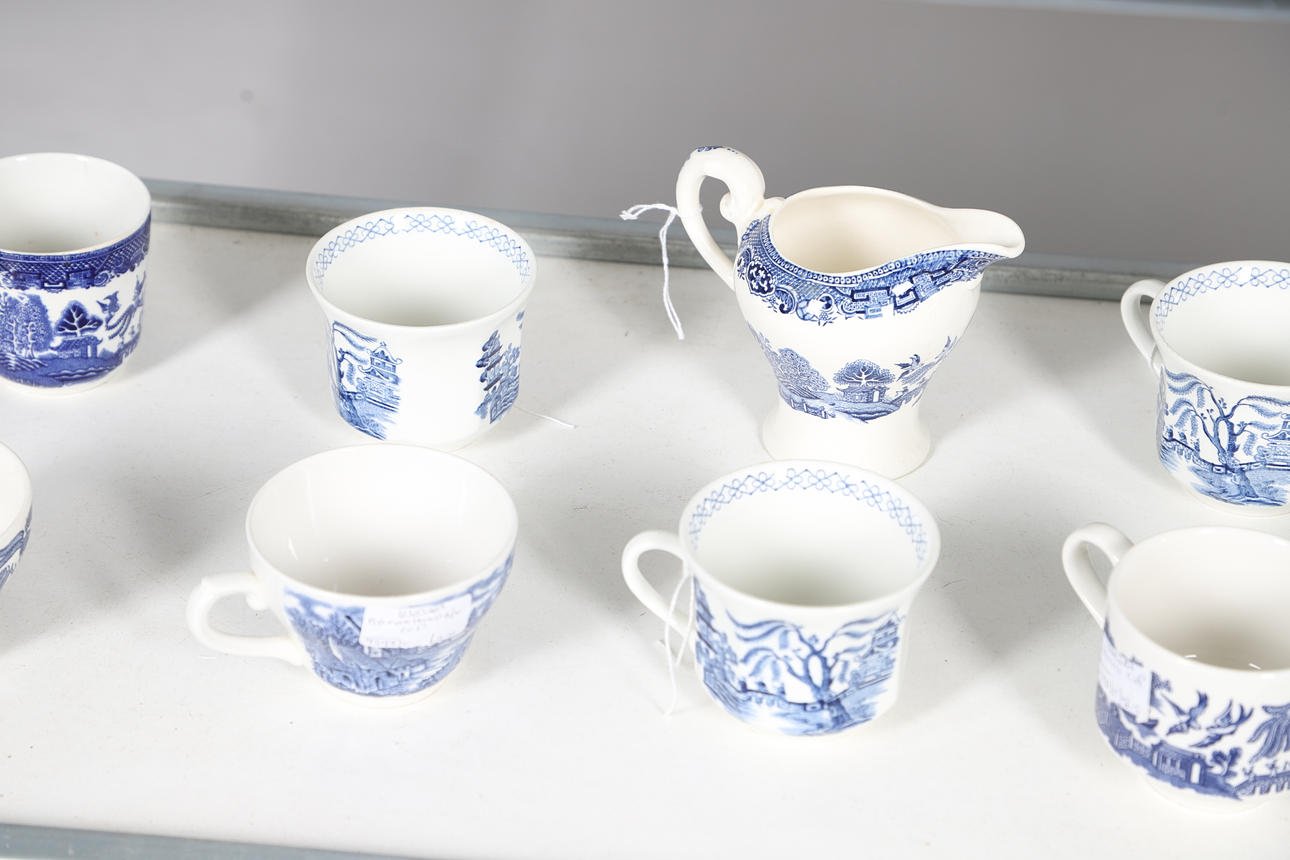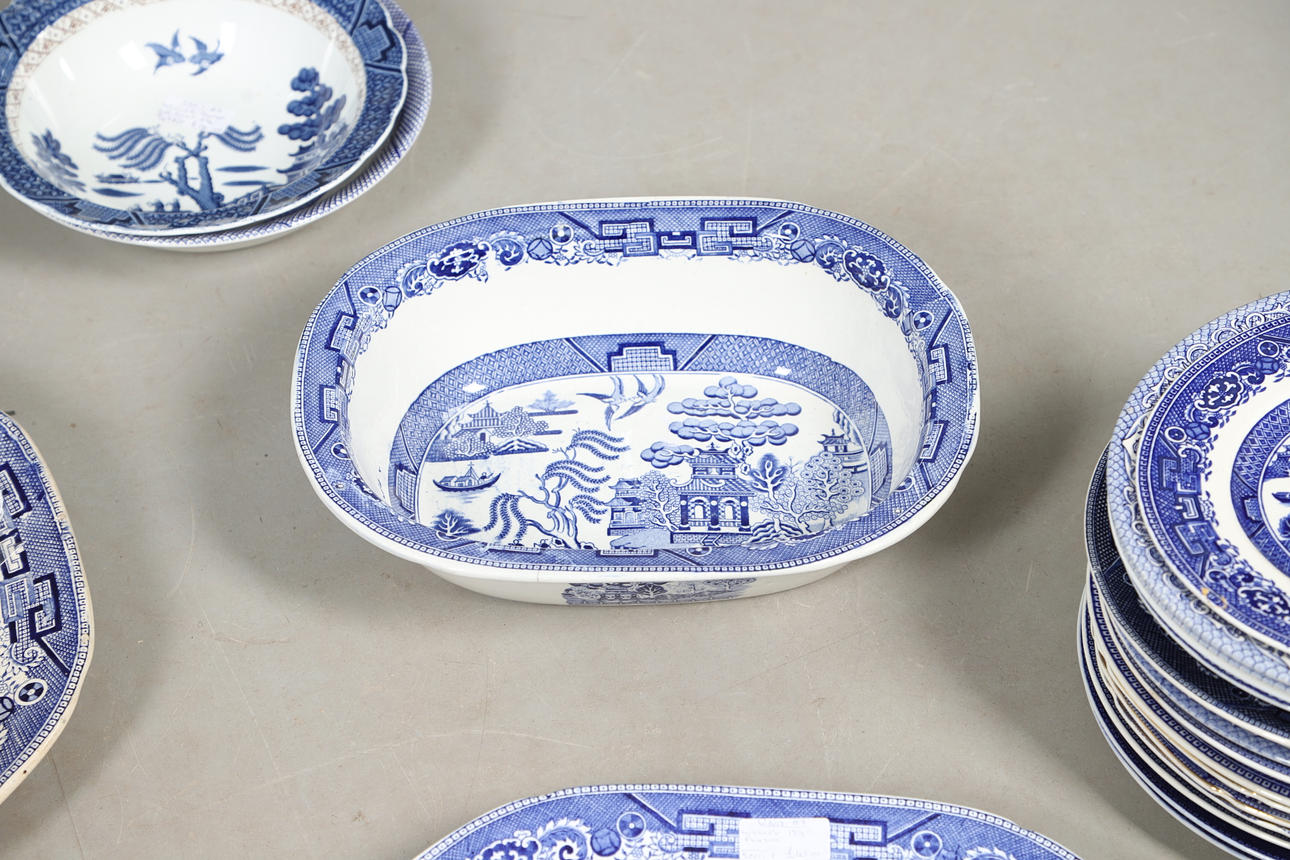 4985717. A LARGE QUANTITY OF BLUE AND WHITE WILLOW PATTERN TABLEWARE.