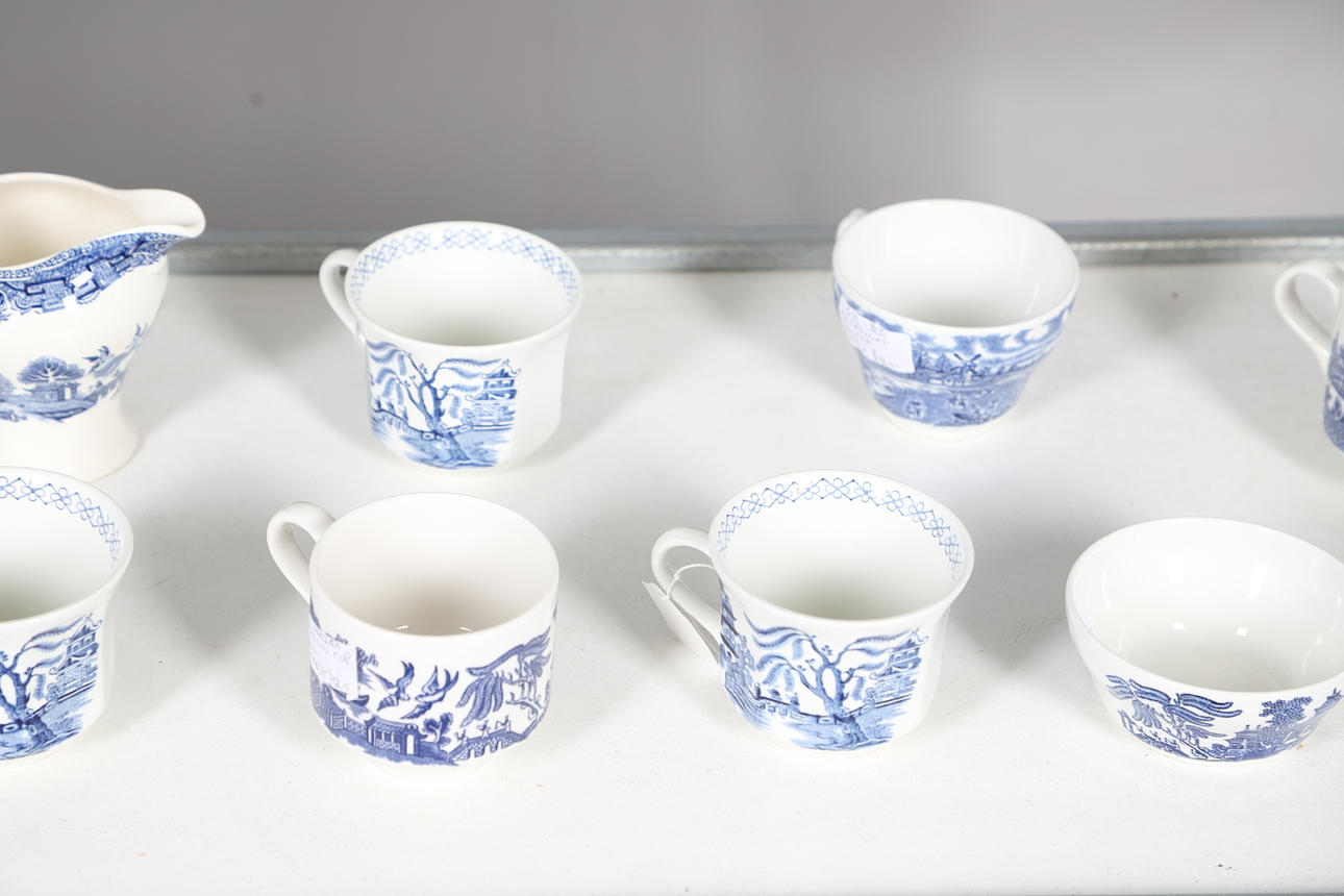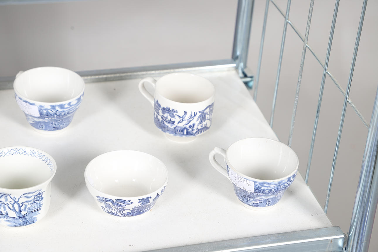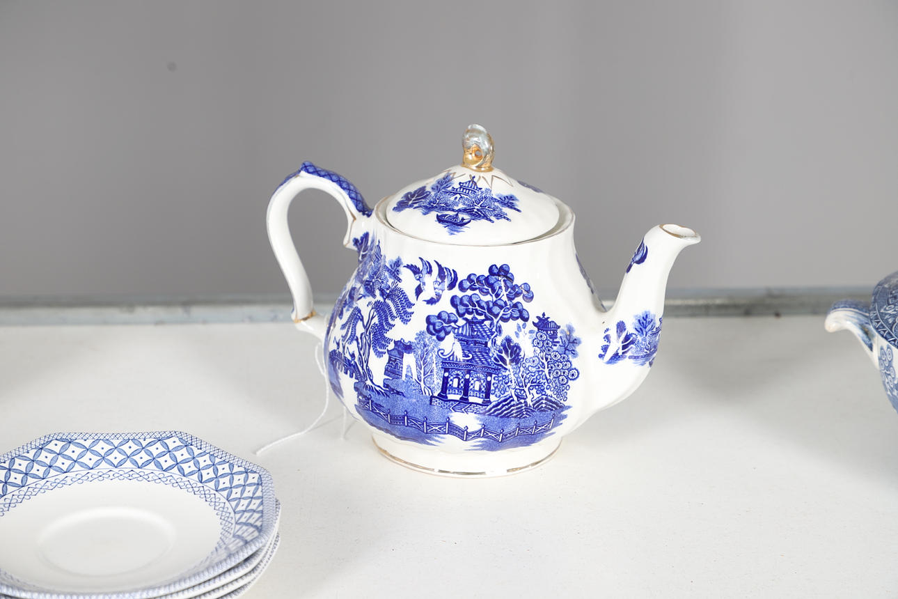 4985717. A LARGE QUANTITY OF BLUE AND WHITE WILLOW PATTERN TABLEWARE.