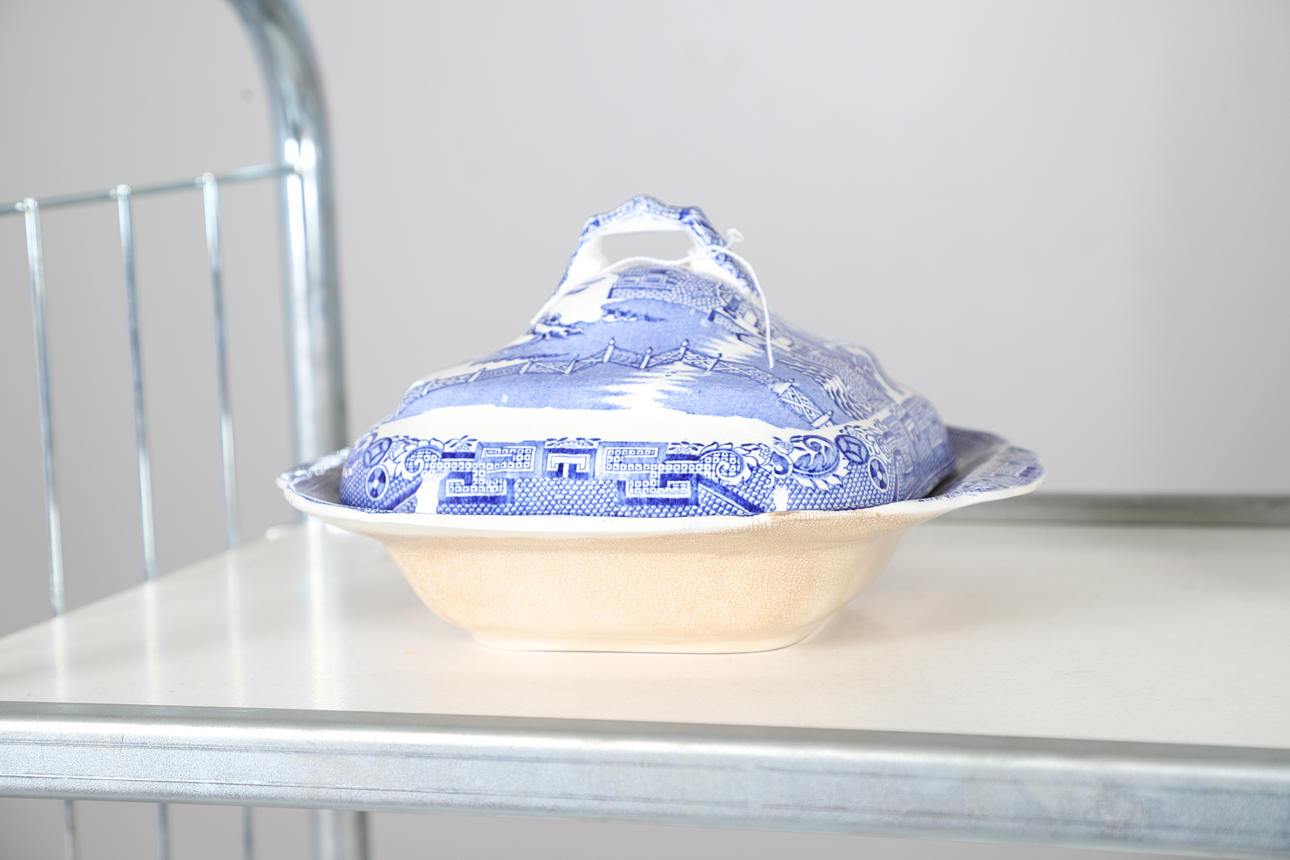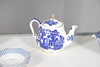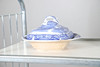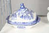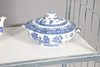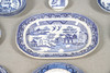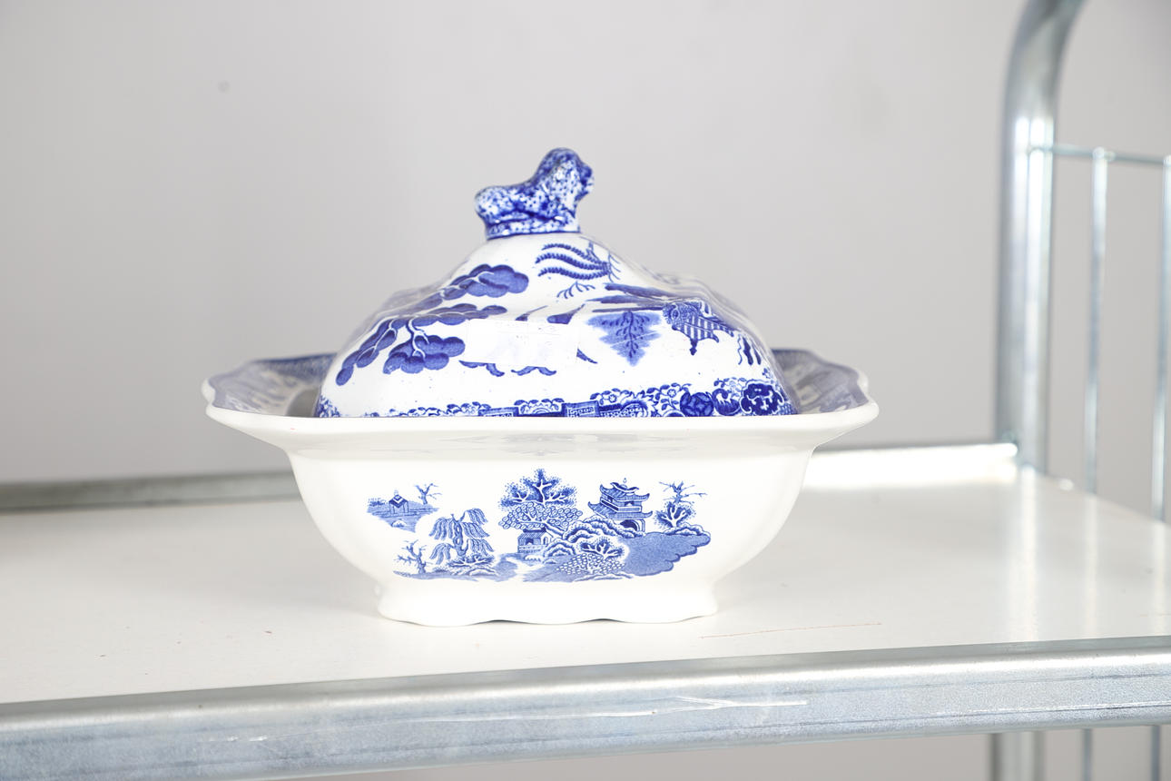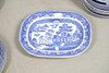 A large quantity of blue and white willow pattern tableware of varied ages, to include various plates of different sizes, four lidded terrines of various sizes, two tea pots, various cups and saucers, four of which are Royal Staffordshire, sauce boats, a cheese dish, and others etc. Size of largest platter, 46cm x 36cm. (QTY).