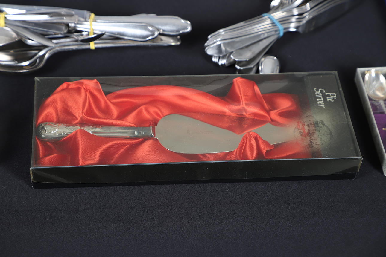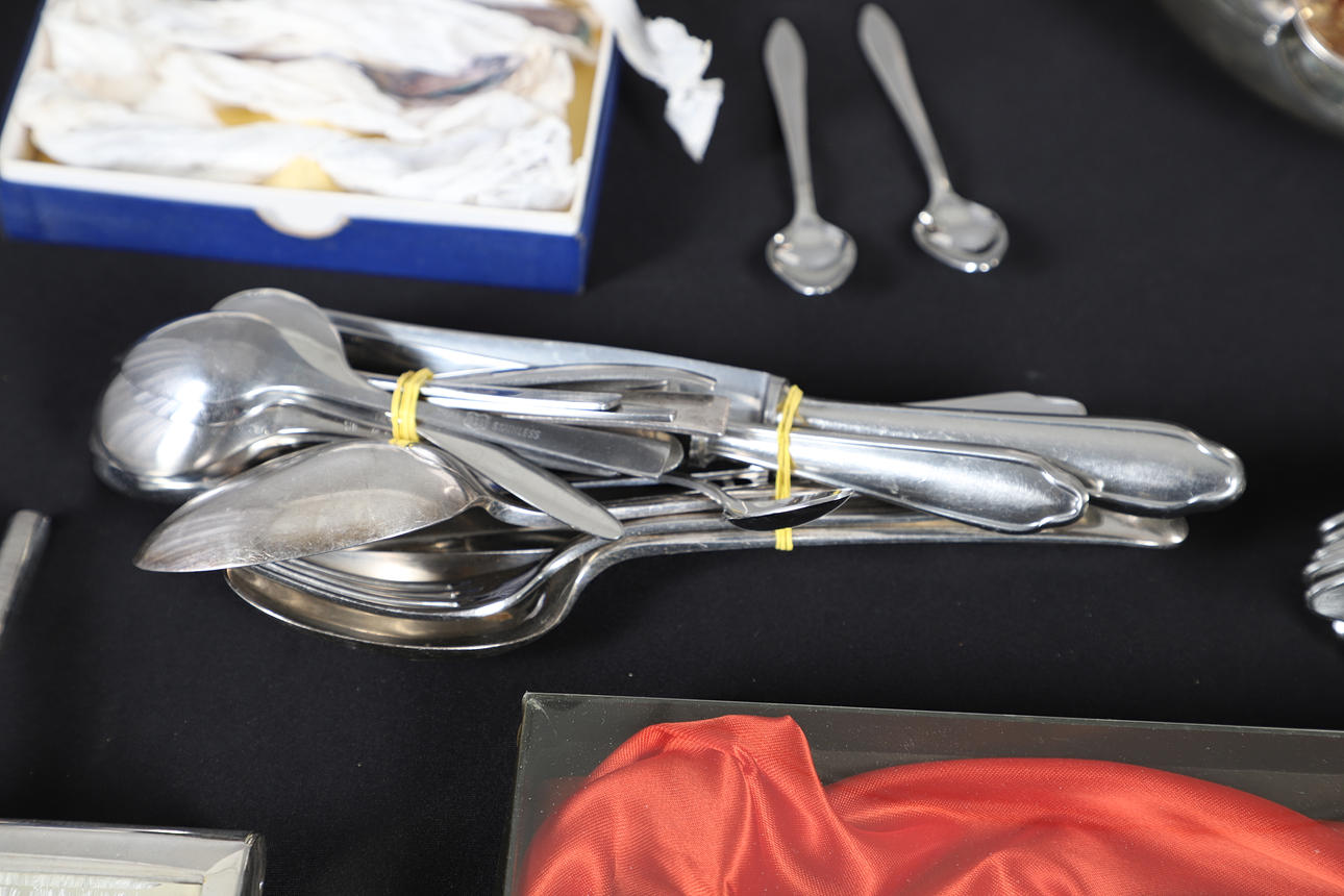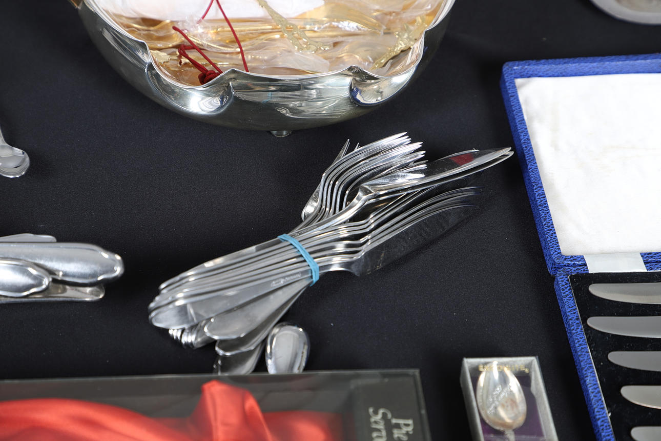 To include a quantity of loose flatware, cased flatware sets, small dishes of various design, a tray and various other items of interest. Contents box measures Height 19cm x Width 30cm x Depth 40cm. Please see online images.