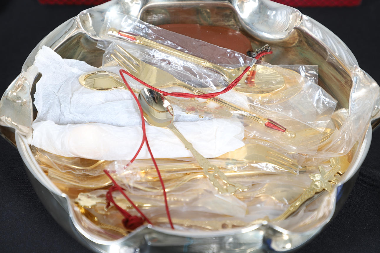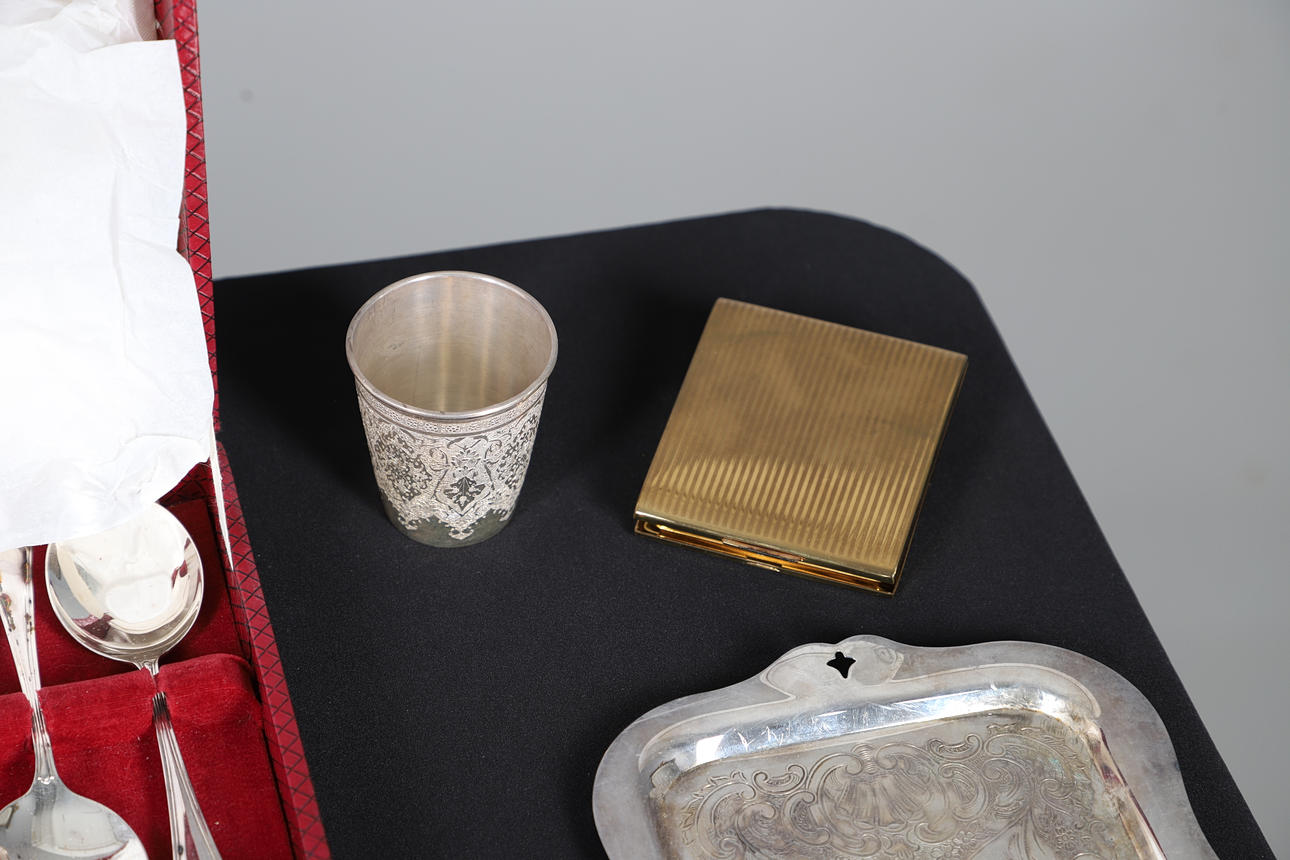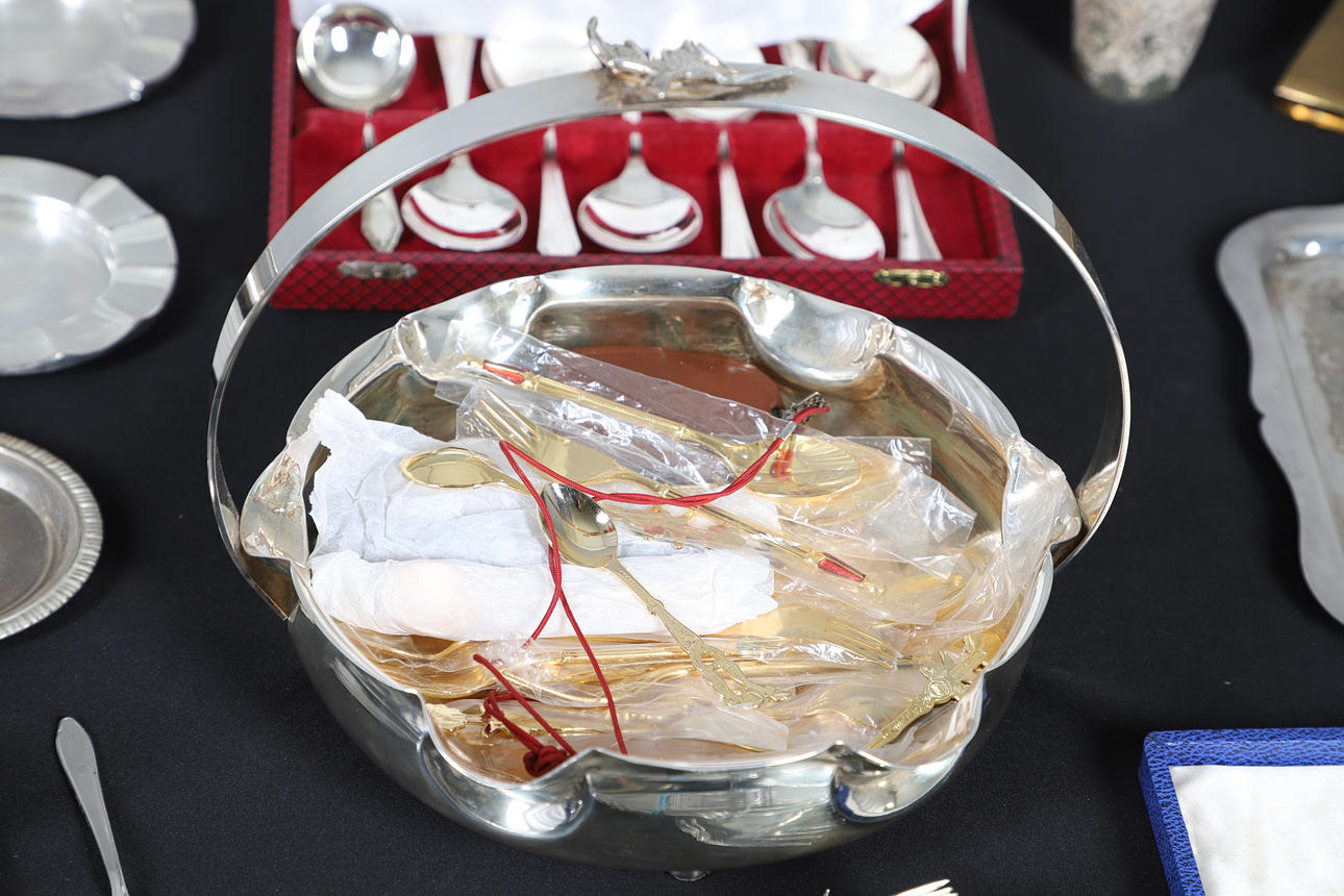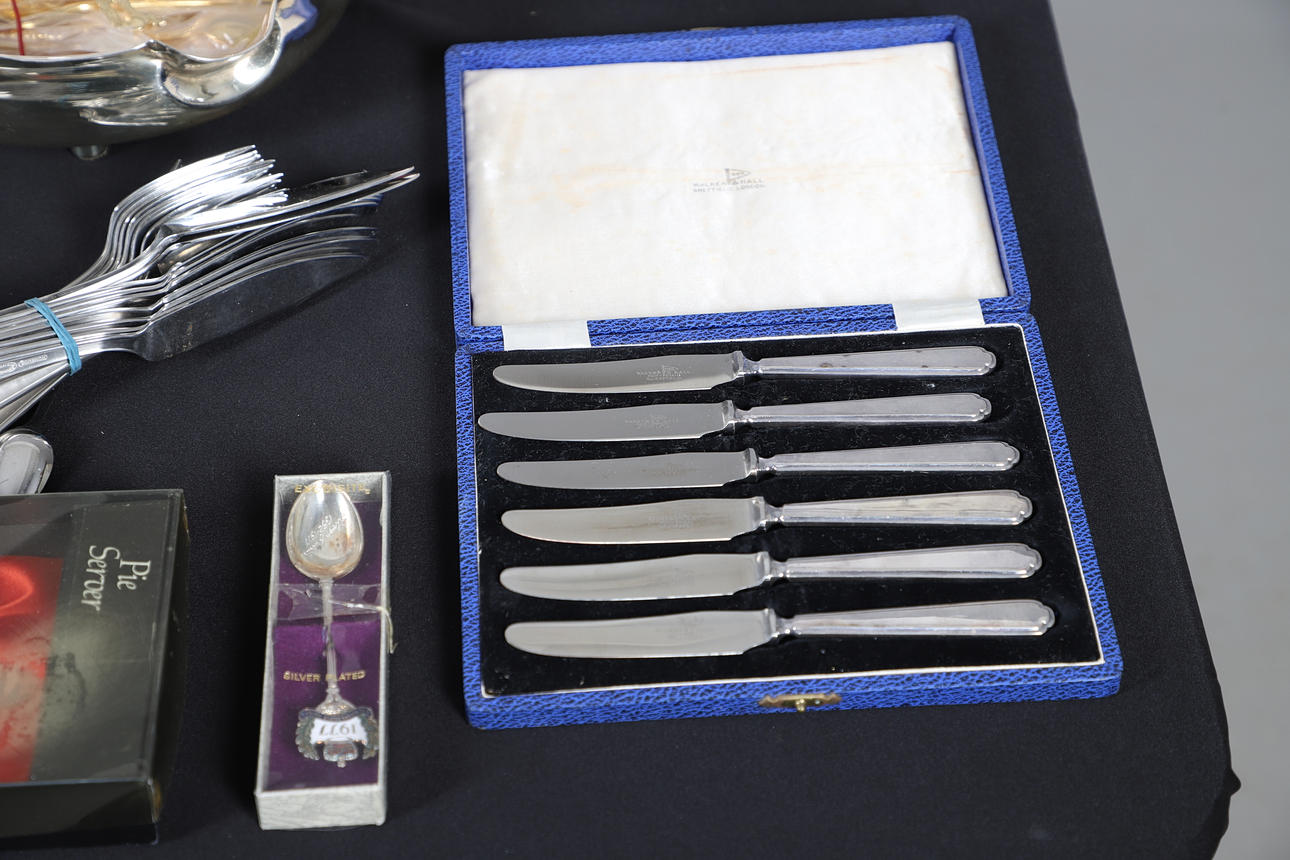 To include a quantity of loose flatware, cased flatware sets, small dishes of various design, a tray and various other items of interest. Contents box measures Height 19cm x Width 30cm x Depth 40cm. Please see online images.