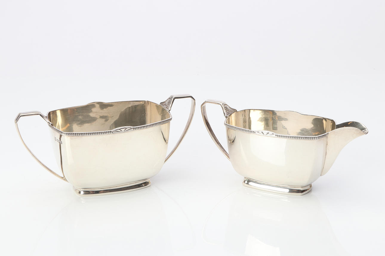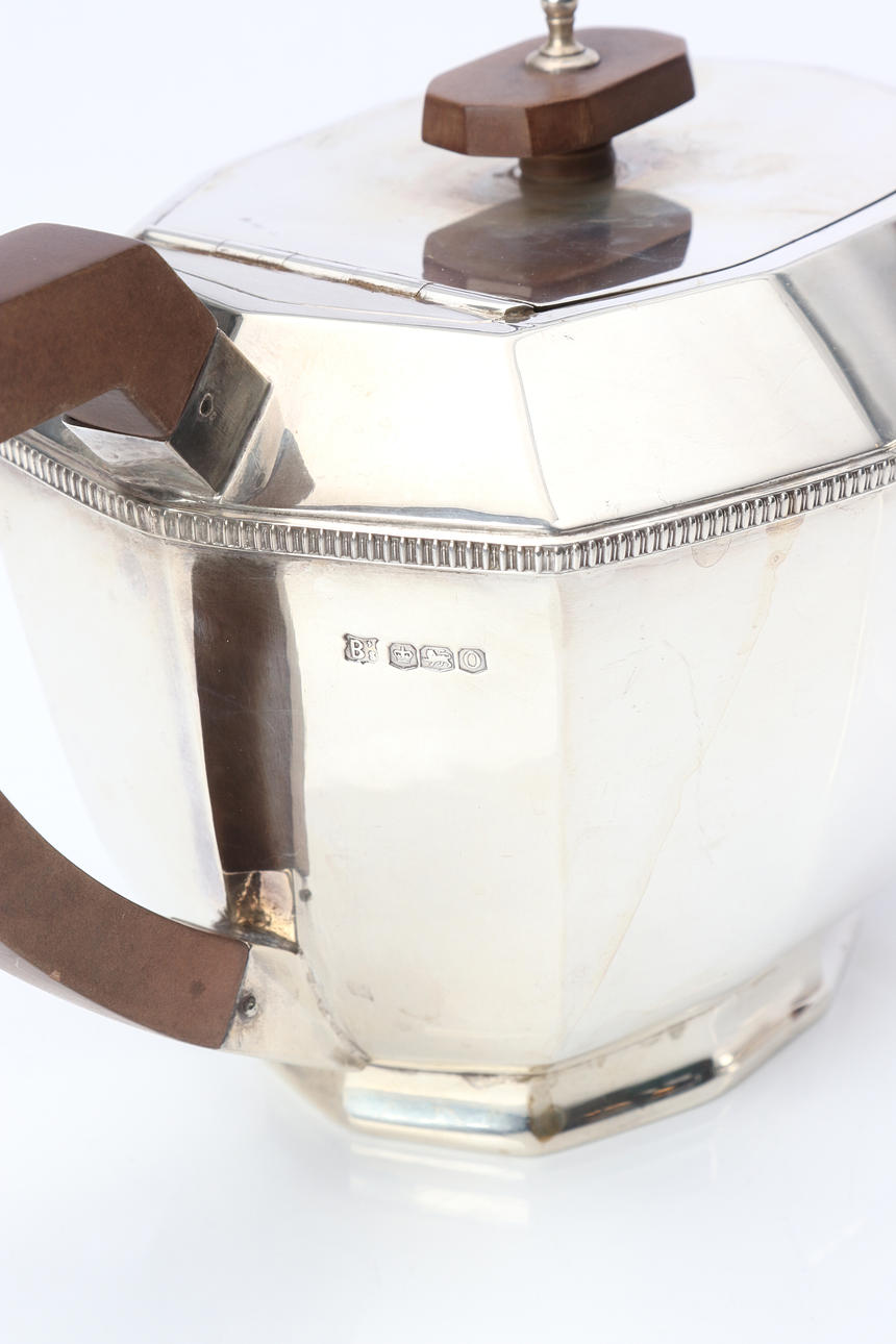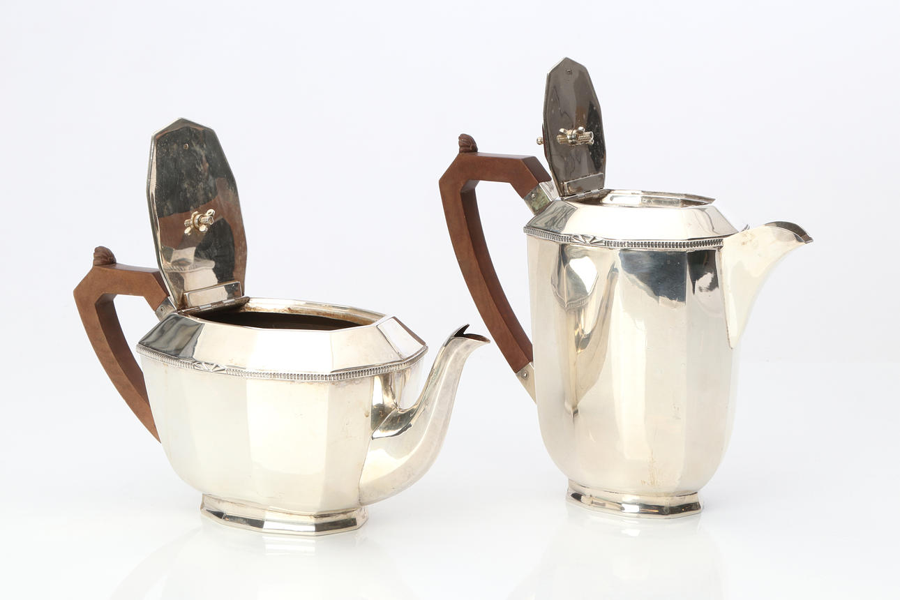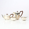 COFFEE AND TEA SET, FOUR PIECES. Sterling silver, with handles and lid knobs in bakelite. It's Sheffield. Total weight about 1855 grams.