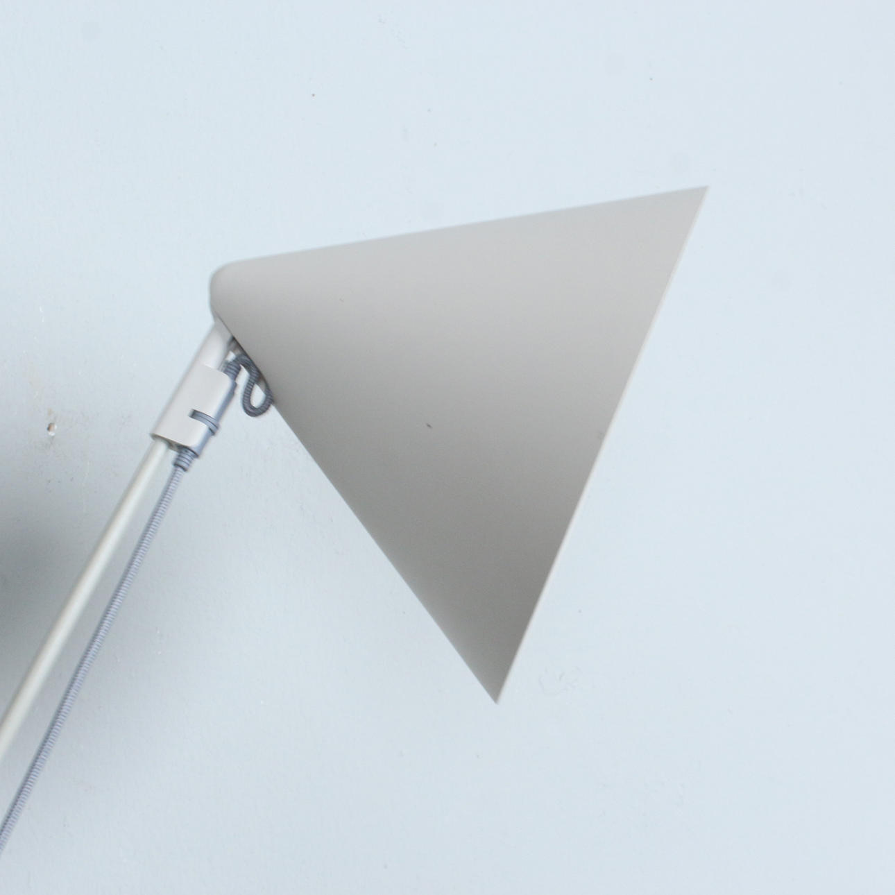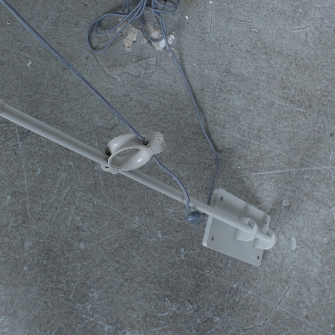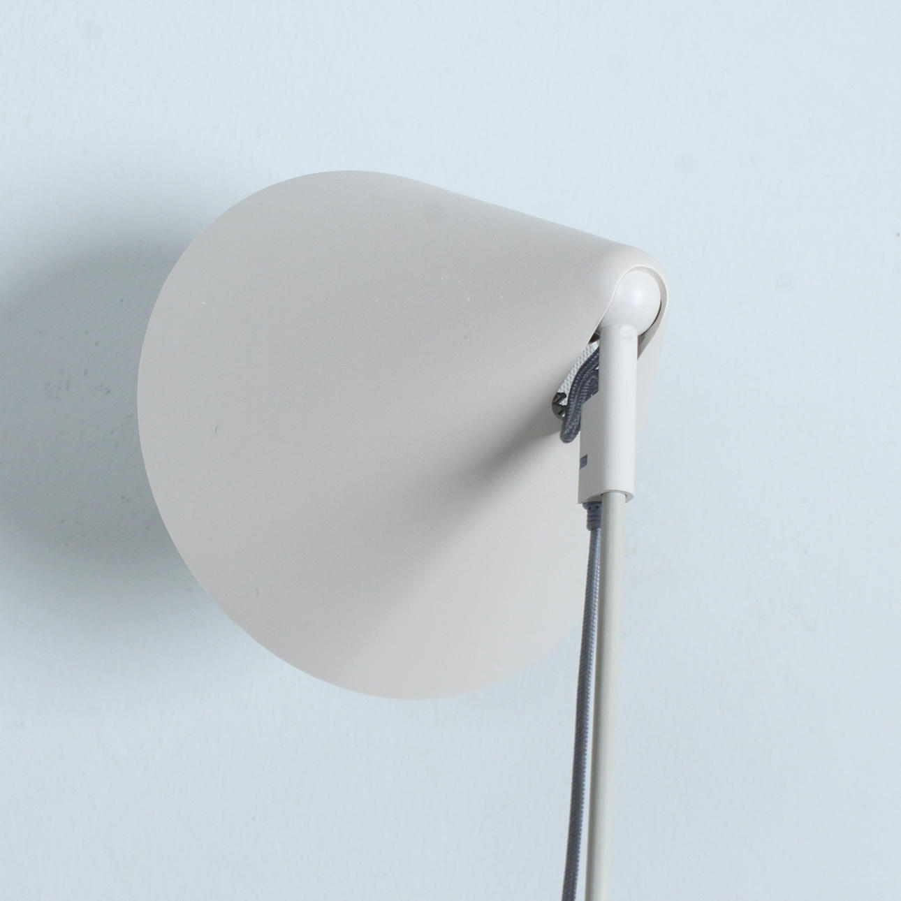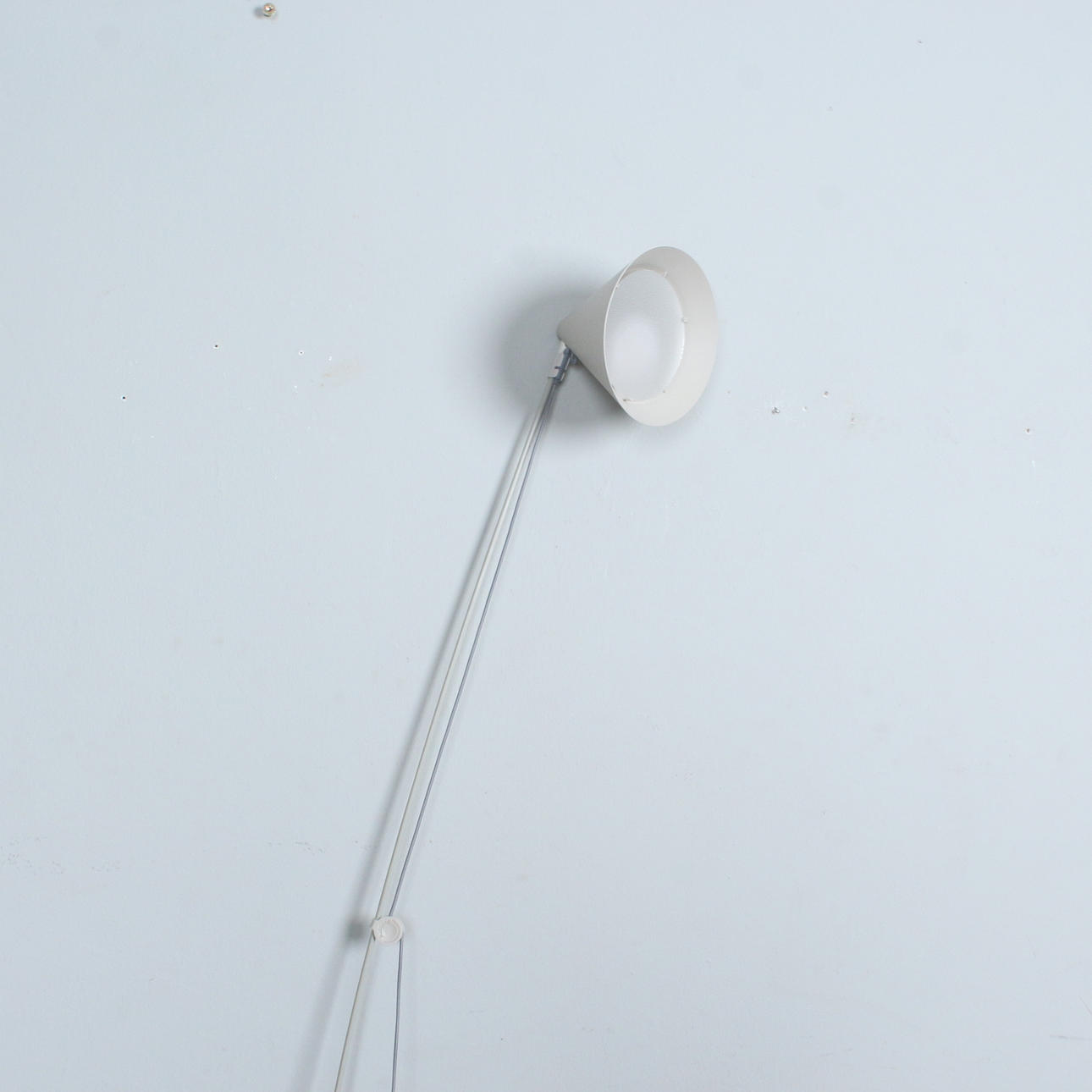 Midgard, wall lamp, “Ayno” model. Base and frame: powder-coated steel, heat sink: aluminum, diffuser: polycarbonate, textile cable, fibreglass rod.