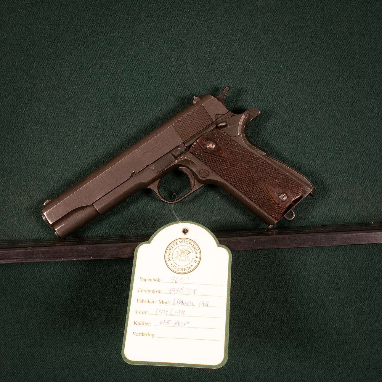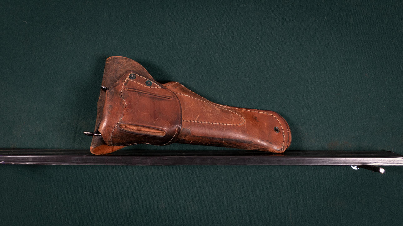 Pistol American Semi-automatic. Make Ithaca. Model Colt 1911 A1. Caliber 45ACP. Additional No. 1442198. Spout length 12,5cm. Fixed aim. Piston sides made of wood. Frame marked. “United States property M1911 A1 U.S. Army”. Leather holster marked “U.S. Warren Leather Goods Co.“.