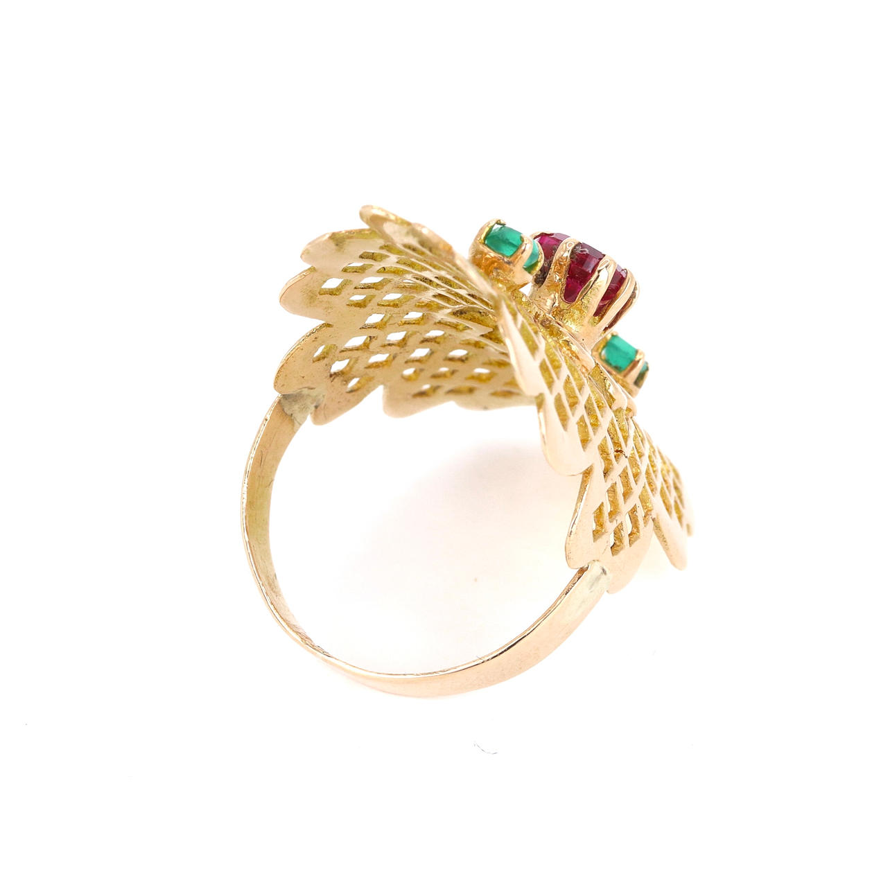 An 18ct yellow gold ring set with round cut ruby and two green stones. UK ring size: L,5.