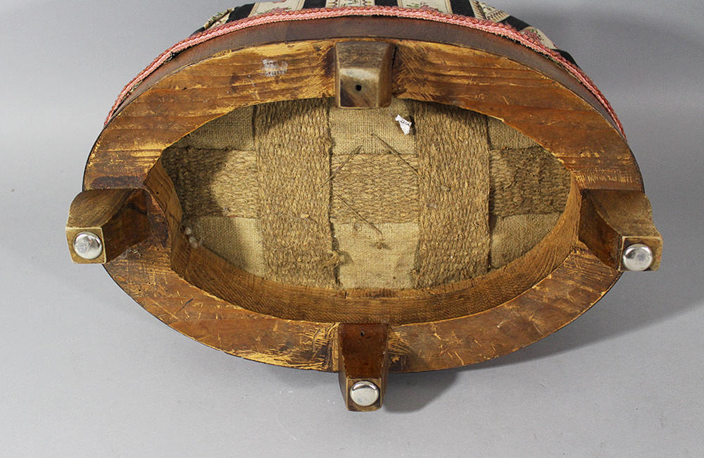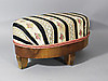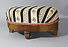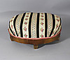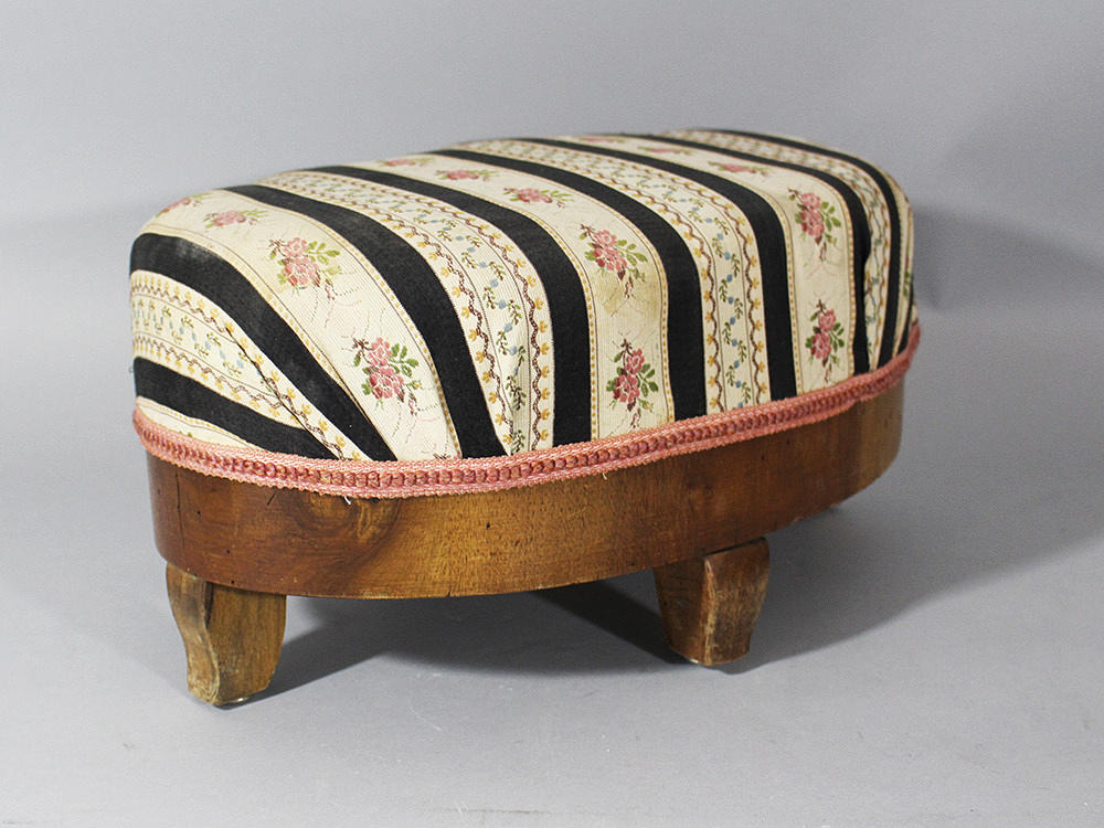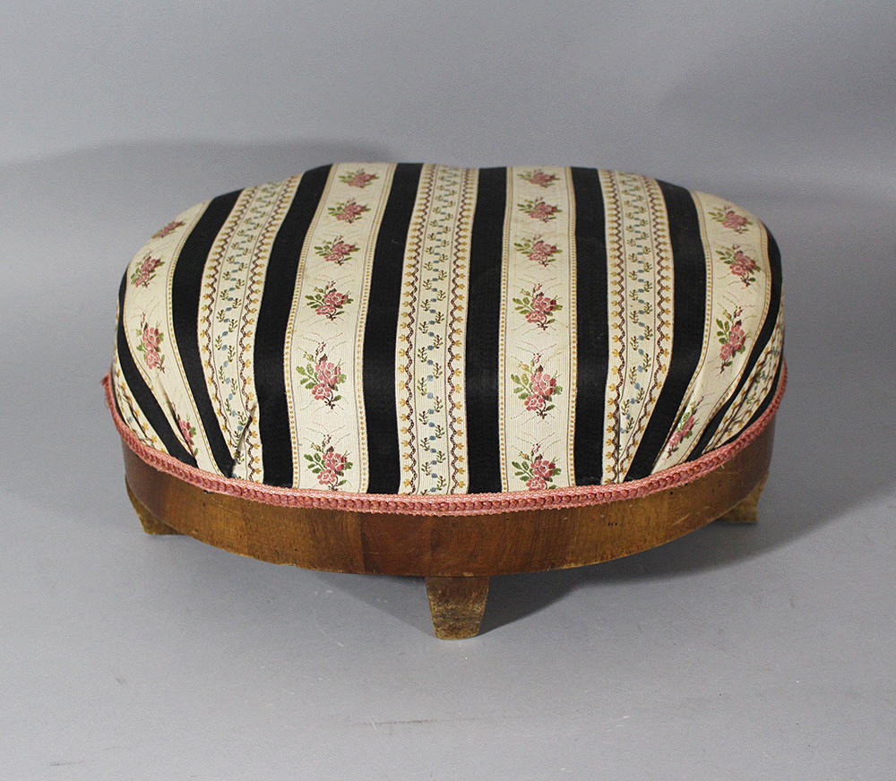 Biedermeier stool, ovlae form with four curved short feet, solid mush wood and veneered on softwood, original upholstery, cover from a later period, Vienna around 1840. Length 39 cm, depth 27 cm, height 20 cm.
