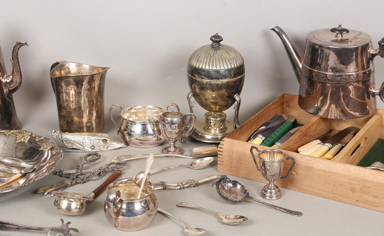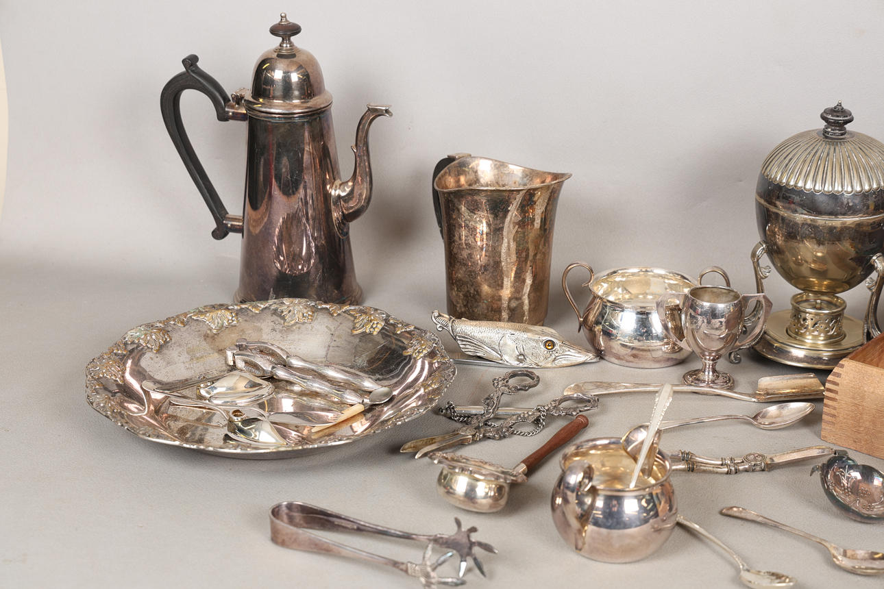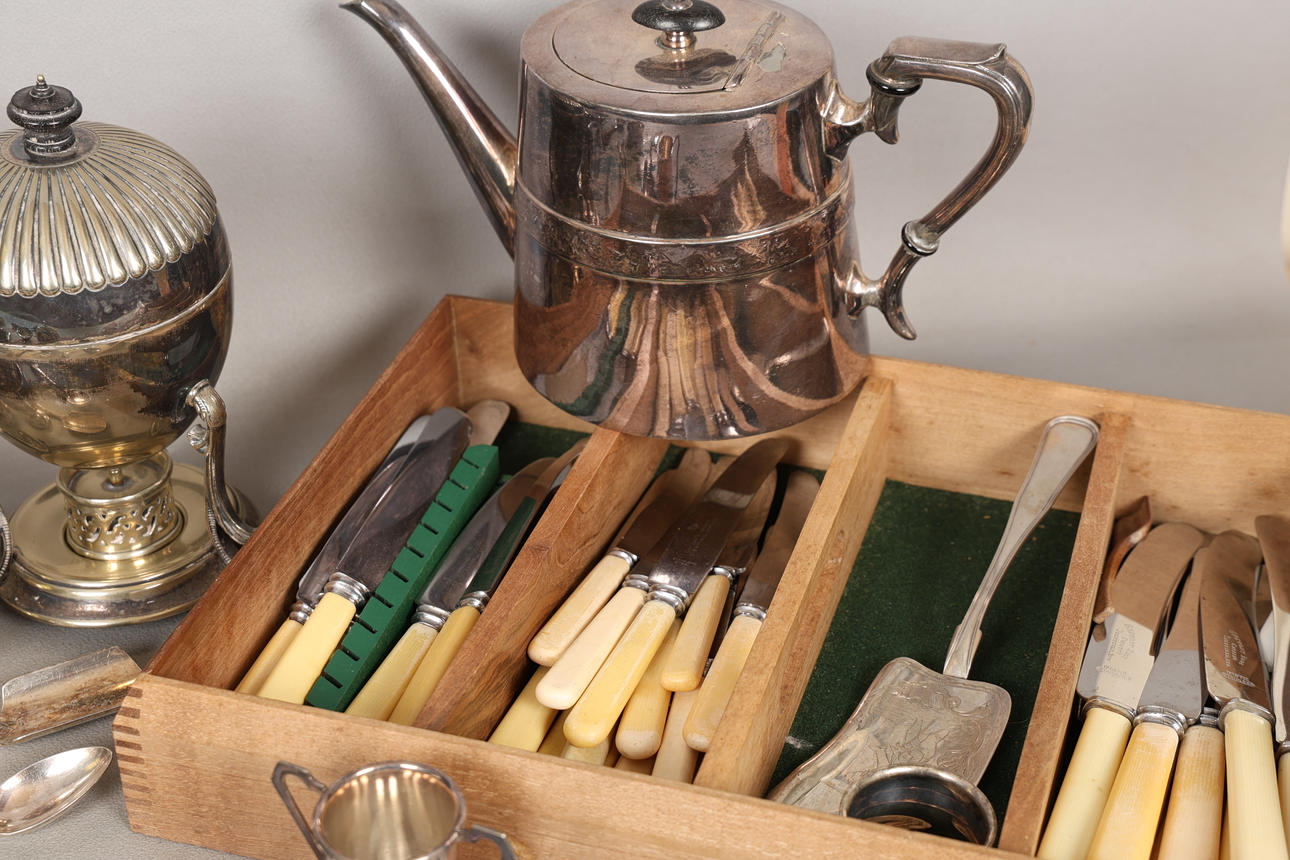 To include teapot, coffee pot, flatware, etc, the largest 26cm high.