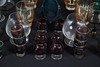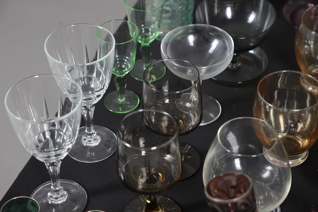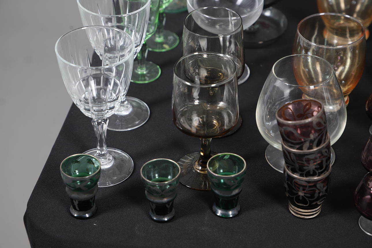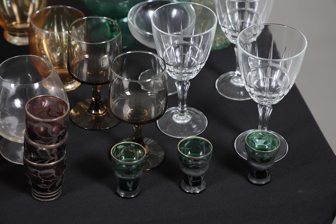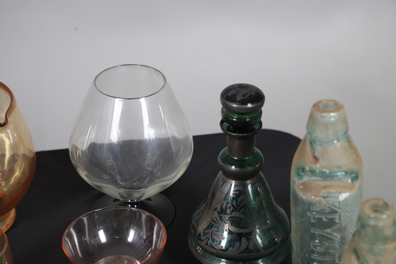 Including metalwork shot glasses, a decanter, champagne glasses, water jug with glasses, wine glasses etc. also with three cod neck bottles, largest H26cm (qty).
