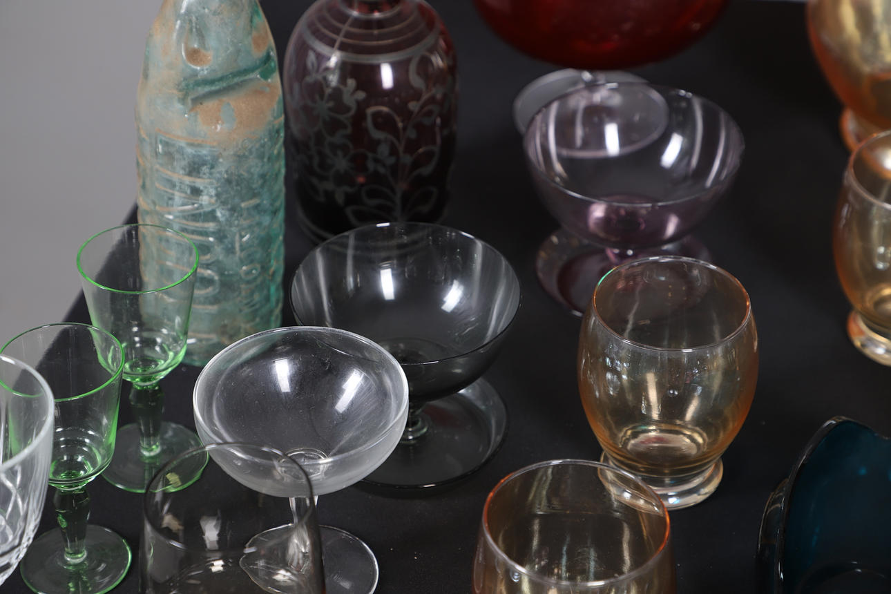 ASSORTED COLOURED GLASSWARE.