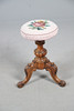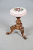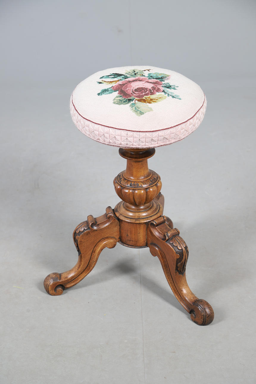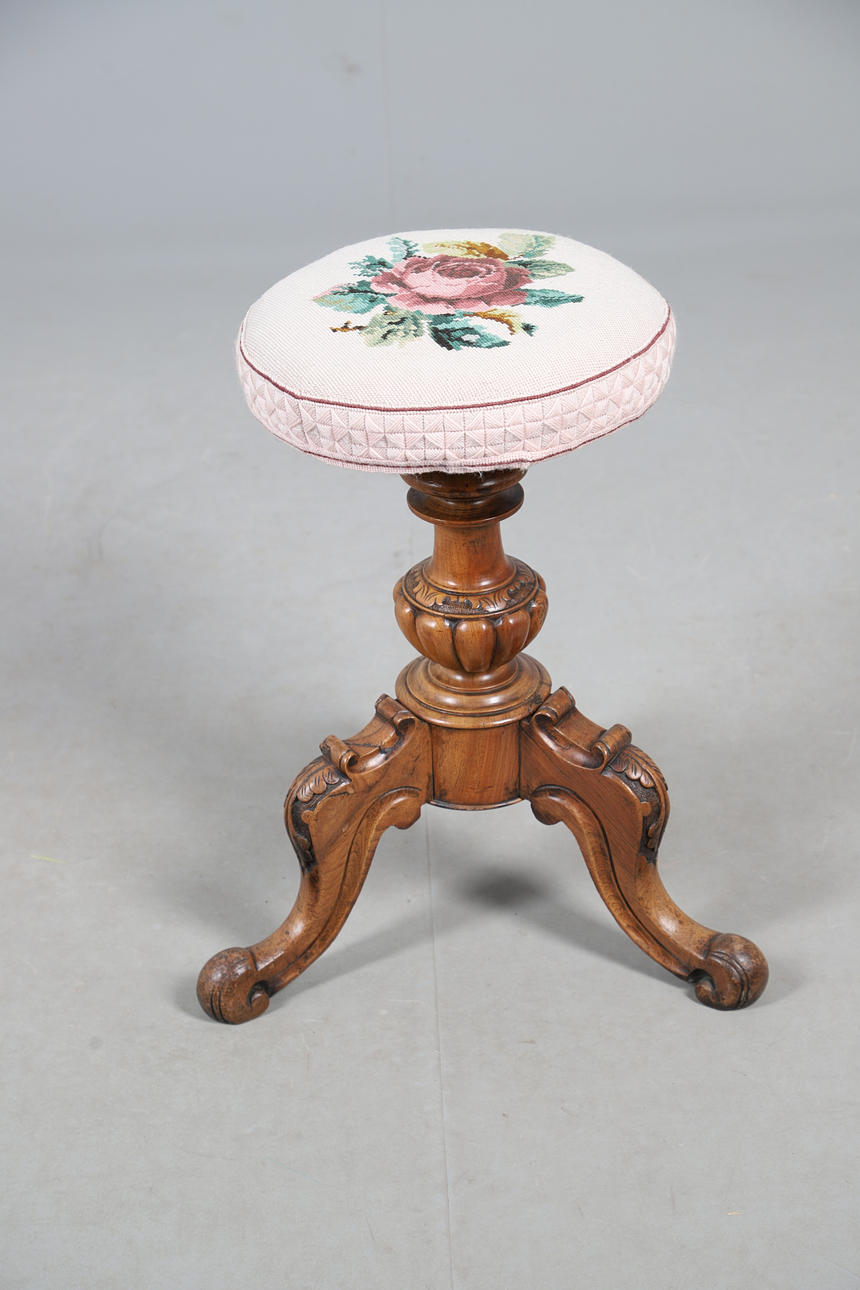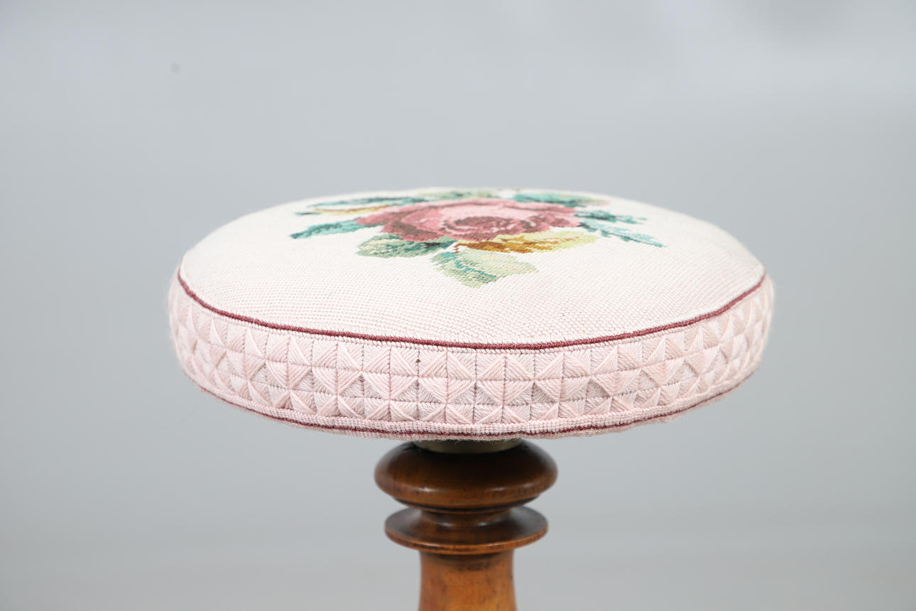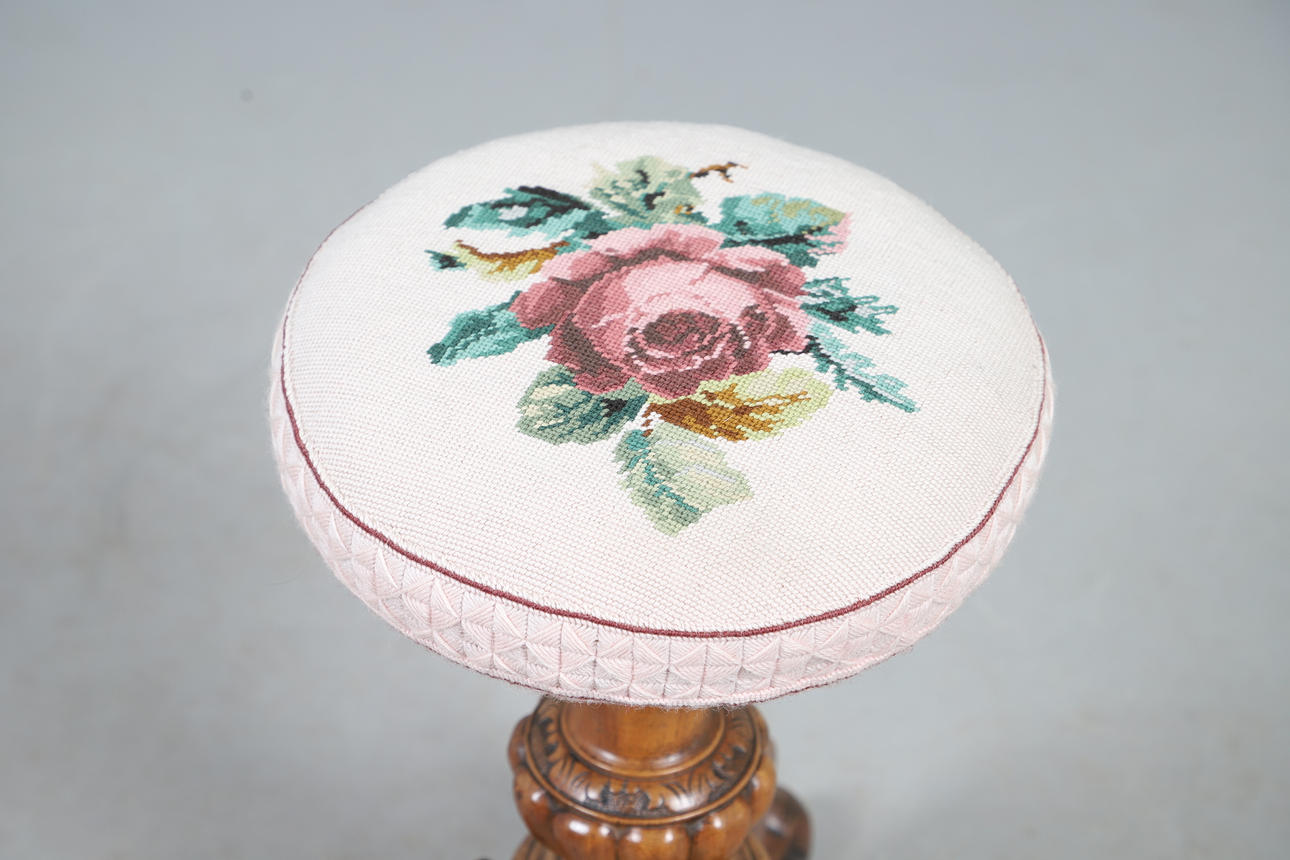 A Victorian walnut piano stool, with a needlework floral decoration to the adjustable seat, and raised on a carved tripod base. 52cm (h) x 30cm (w).