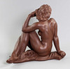 Porcelain with pressed sword mark from the Meissen porcelain factory, Böttger stoneware and model no. *85022* and other press numbers, 1999, 1. Choice, designed by Robert Ullmann 1940, signed and dated, female nude sitting on a cloth base, looking slightly and playing with one hand in curly hair, L ca. 37 cm, height approx. 32.5 cm, firework caused by manufacturing on the underside, source Sabine & Thomas Bergmann, Meissen artist figures, Erlangen 2010, p. 605, no. 1234.