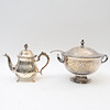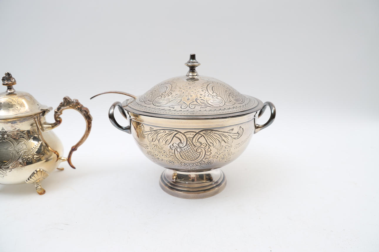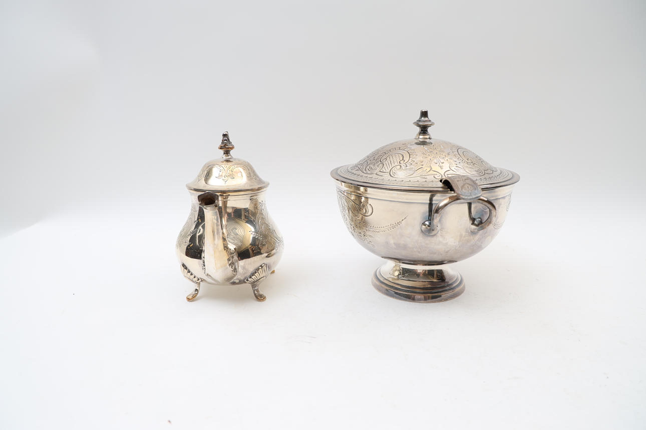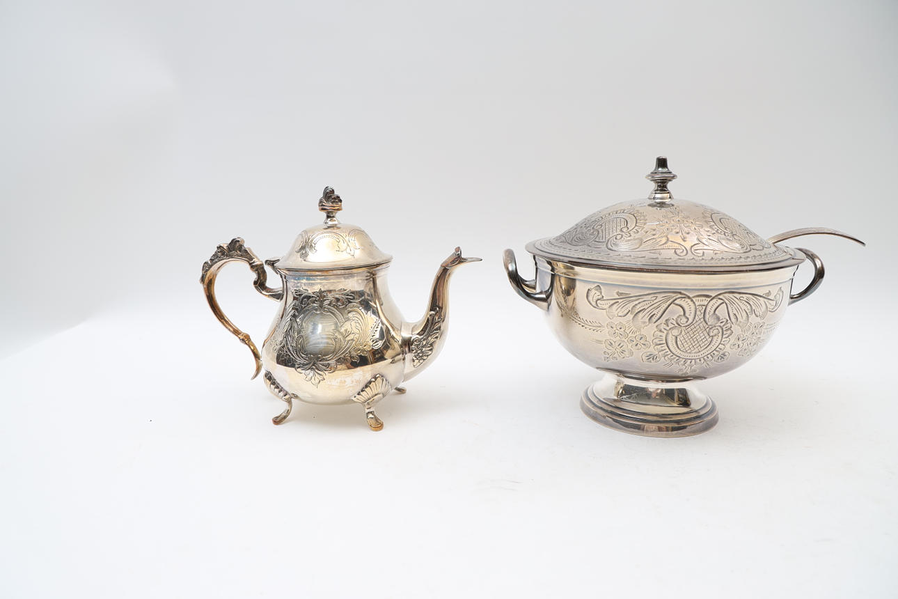 Terrine with soup spoon and teapot. With engraved decor. Stamped EPNS.