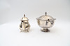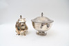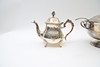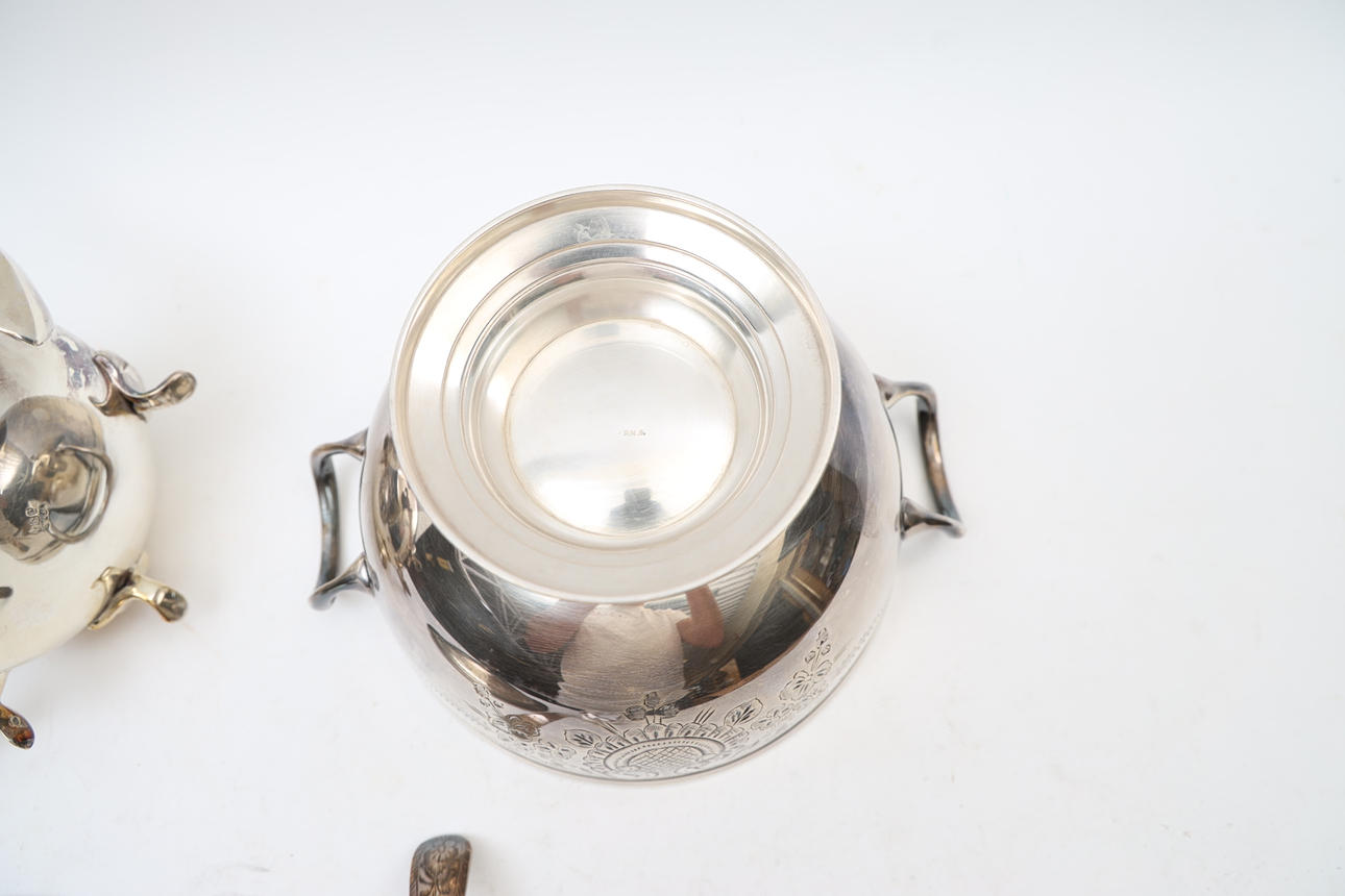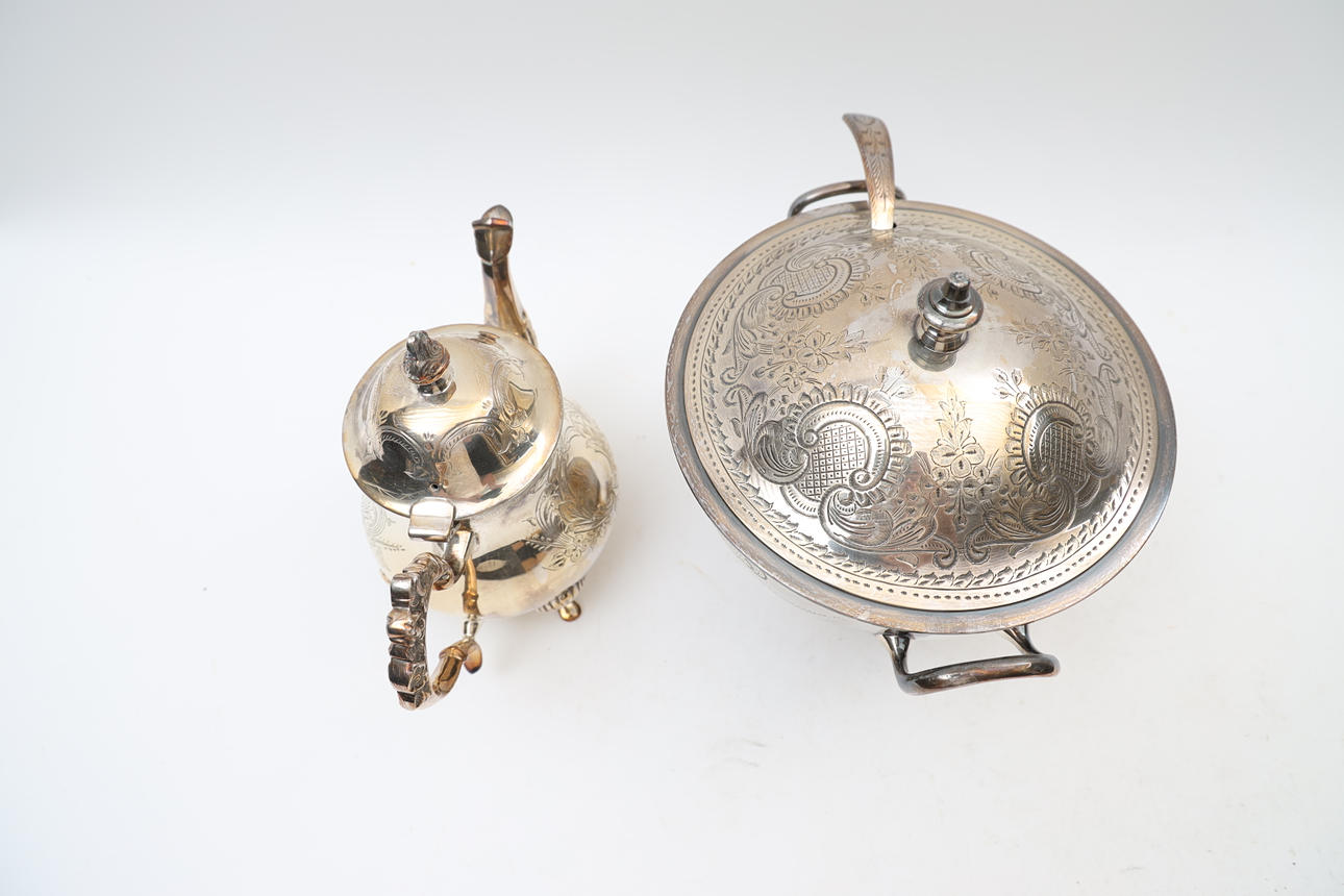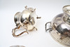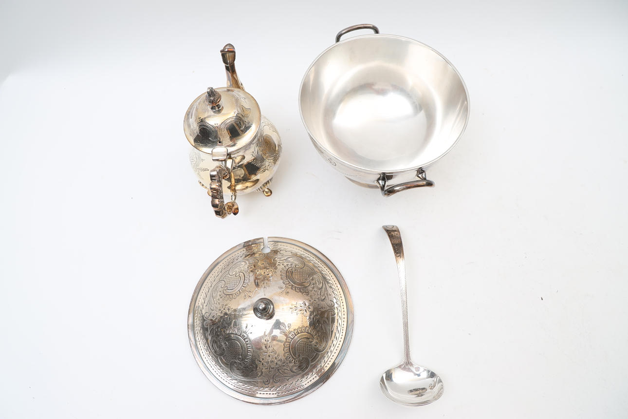 Terrine with soup spoon and teapot. With engraved decor. Stamped EPNS.