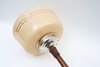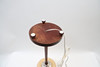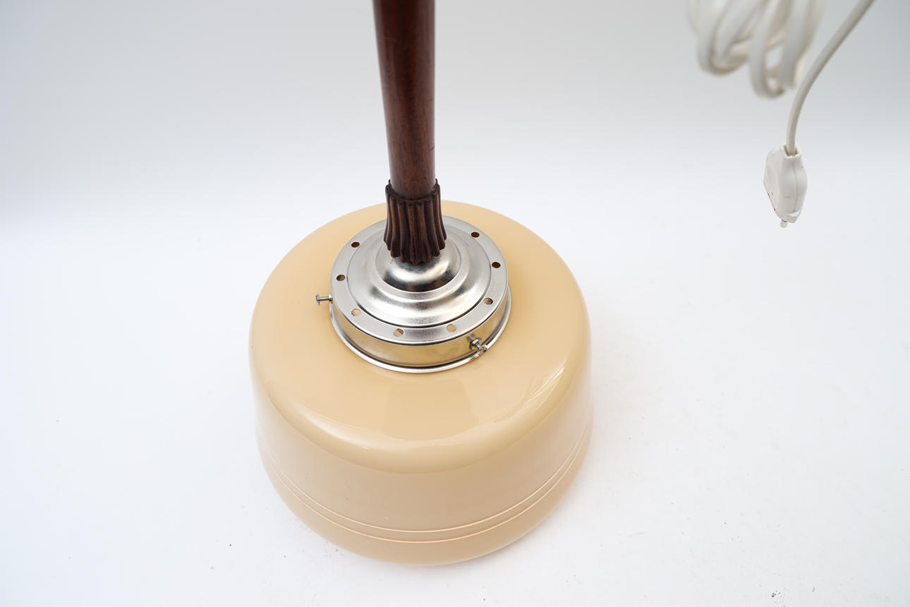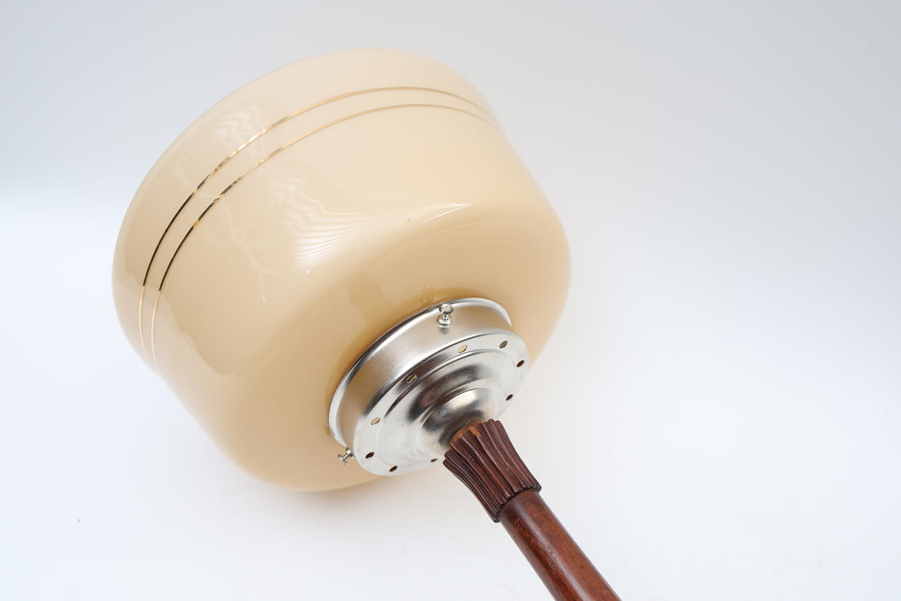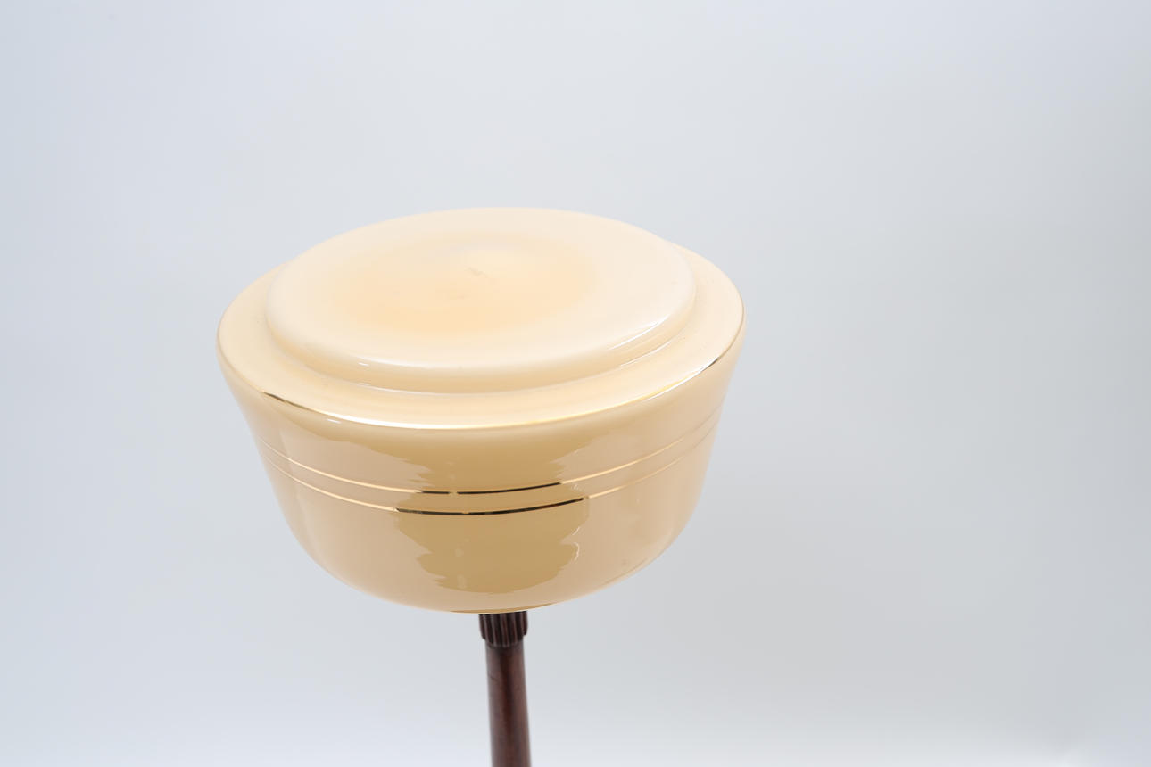 Stained wooden frame with cut decoration. Cream-colored mug with gilded decor. Metal bracket.
