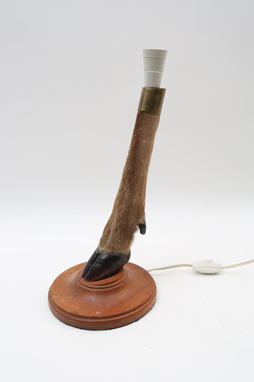 Animal foot mounted on wooden board. Porcelain plinth, brass bracket.