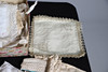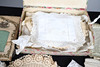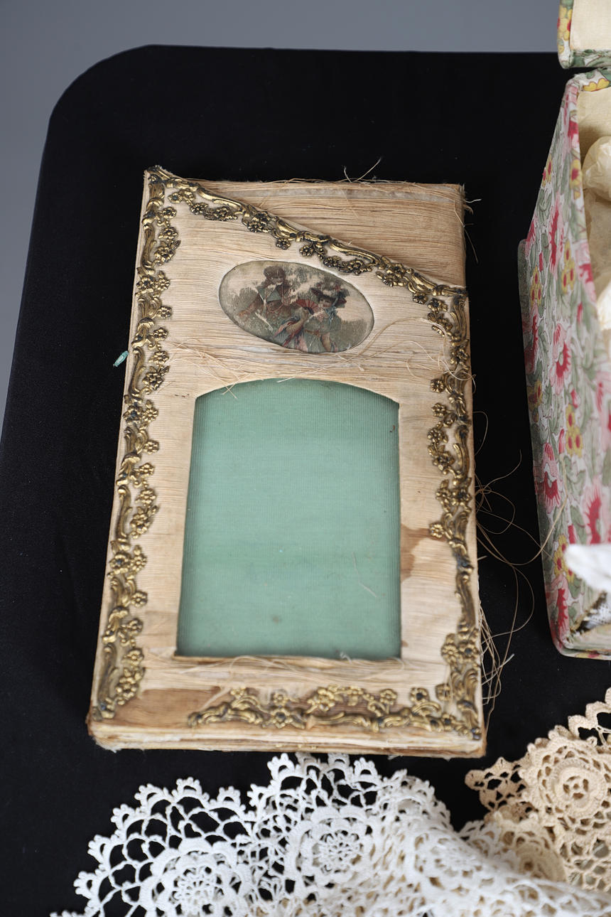 including table mats, runners etc fits box 35cm x 22cm; together with a triple folding silk photoframe, 30cm x 16cm.