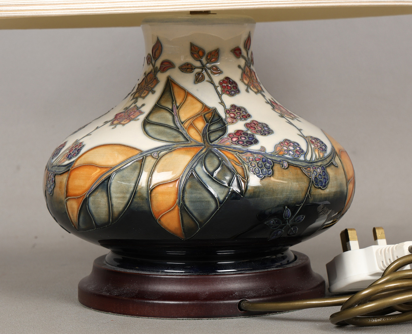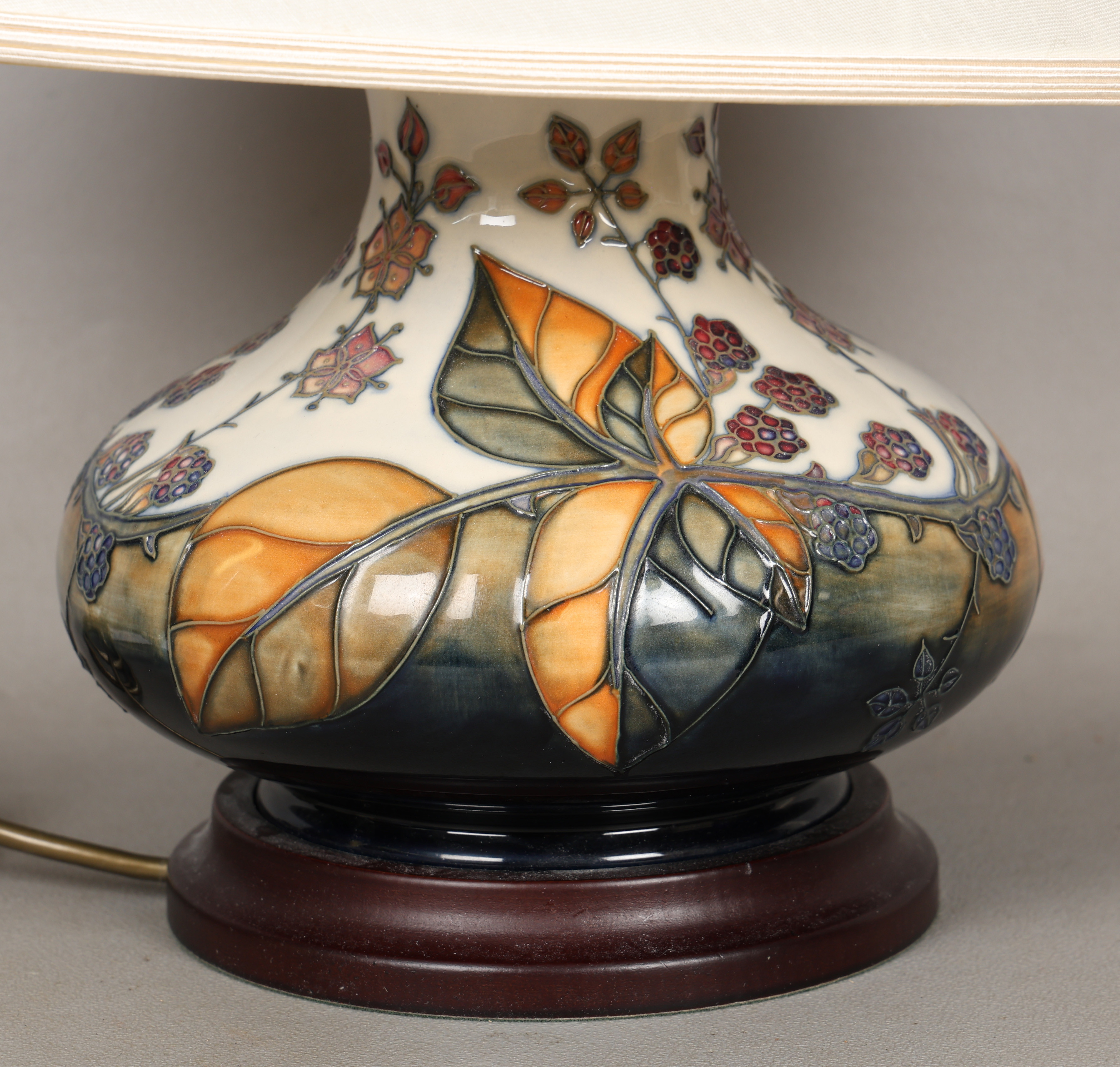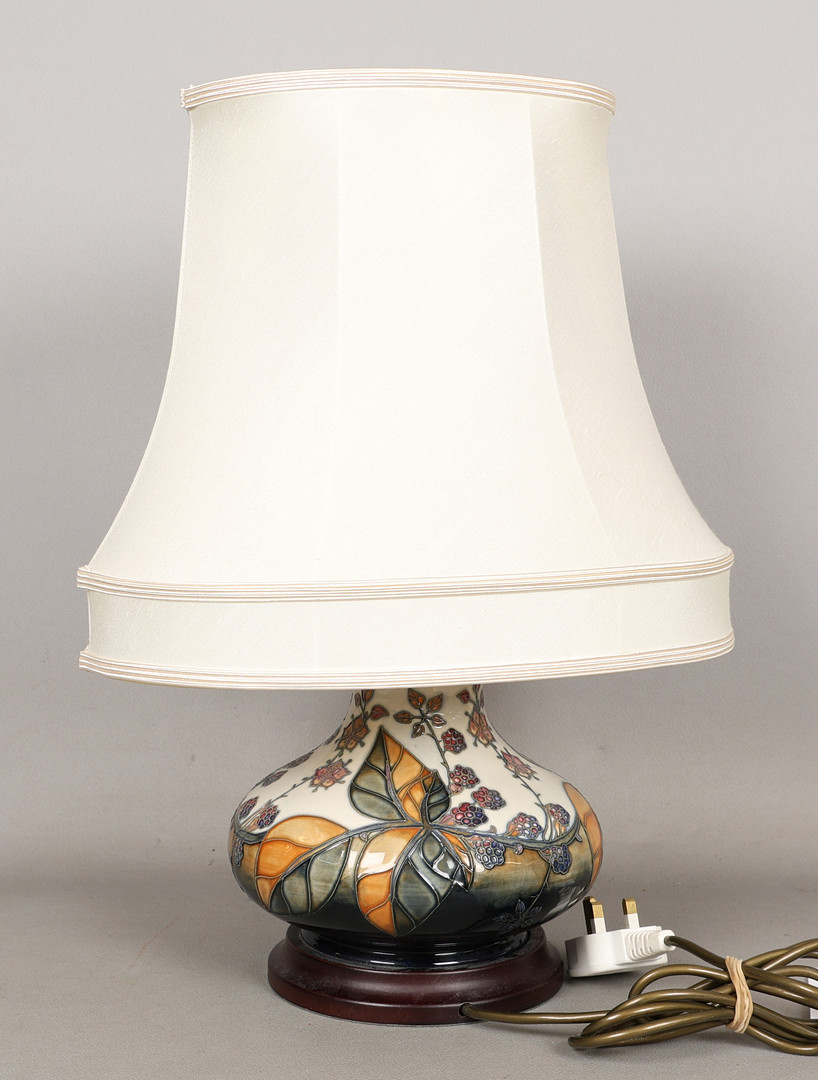 4987428. A MOORCROFT POTTERY BRAMBLE PATTERNED TABLE LAMP AND SHADE.