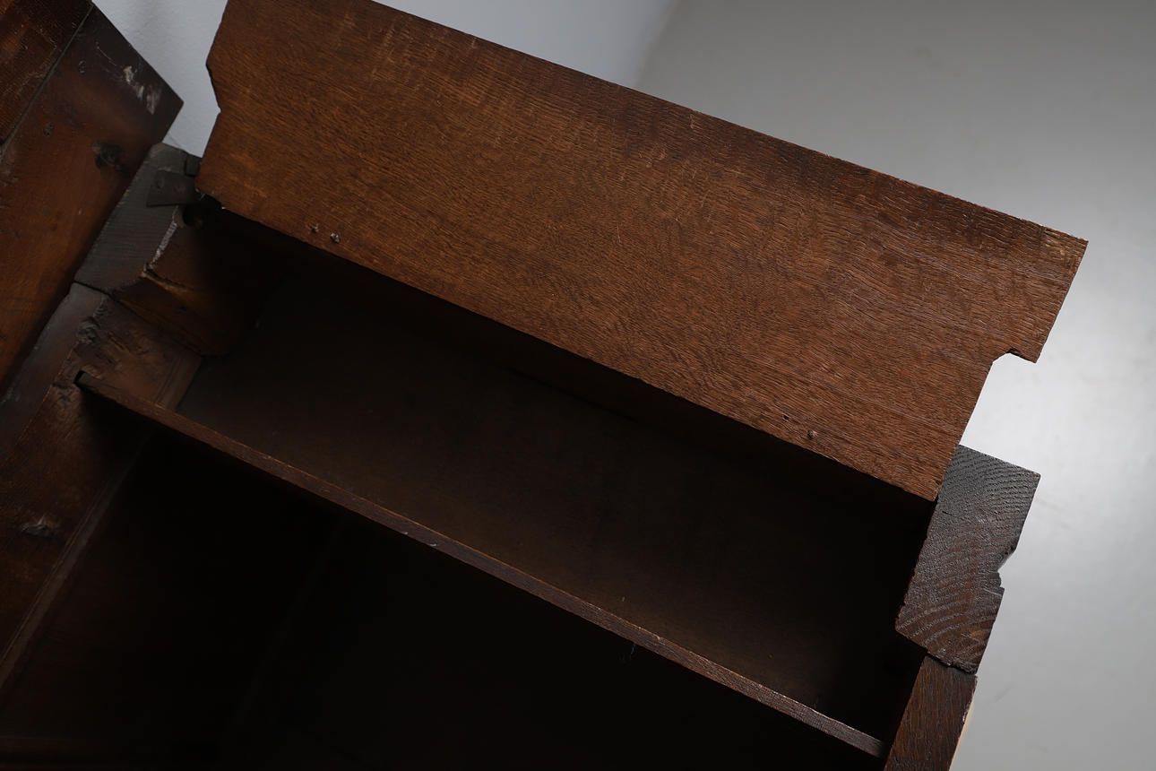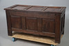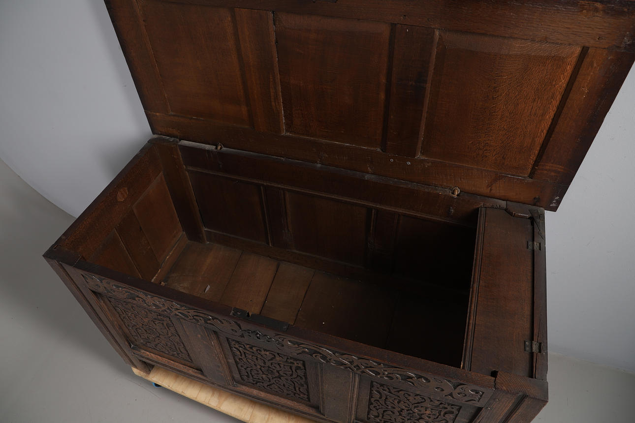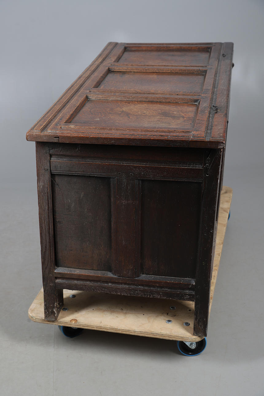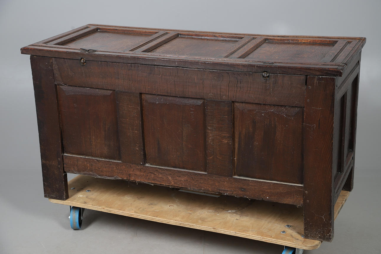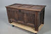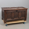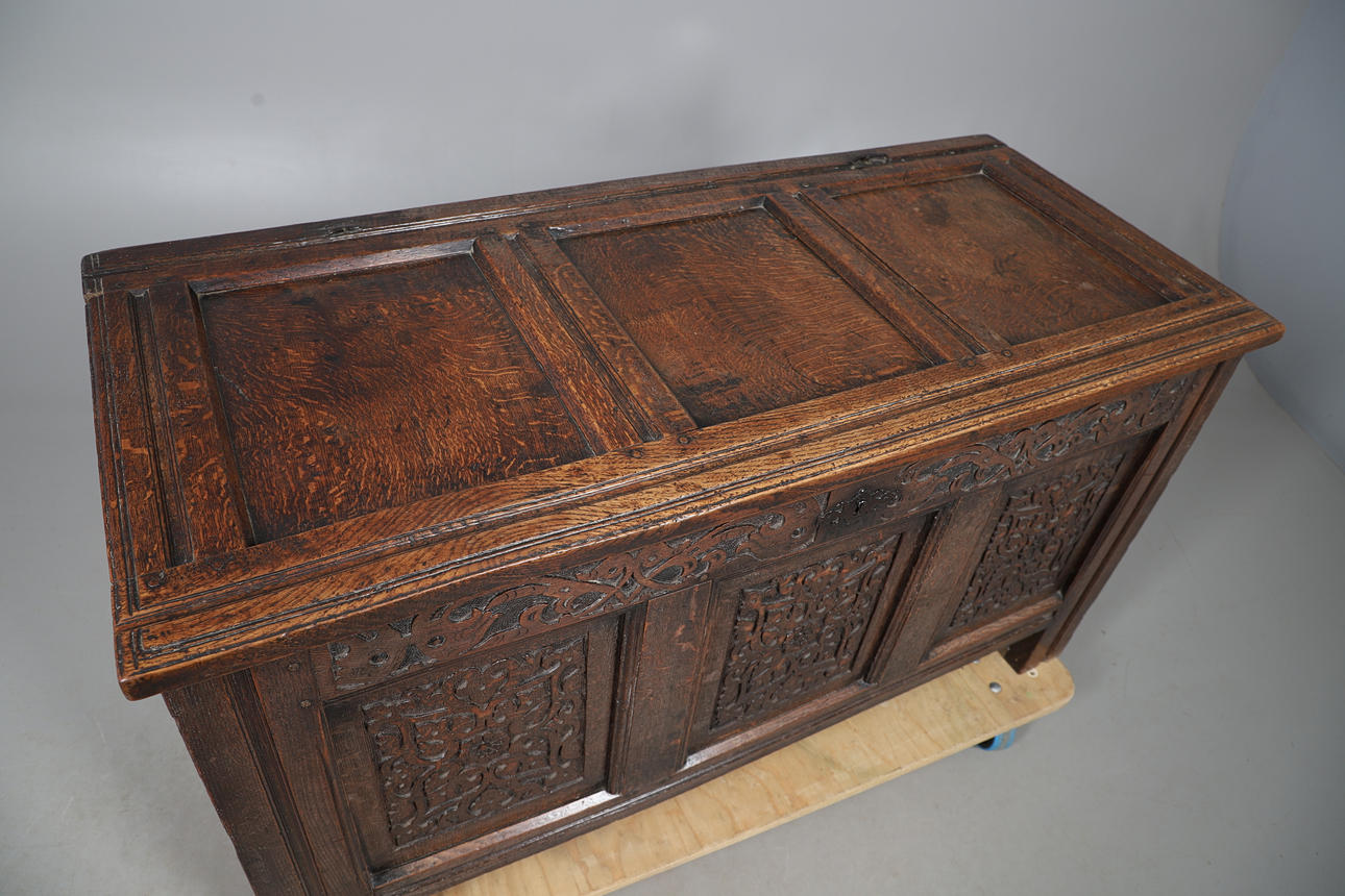 A 17th century and later oak coffer, with a hinged three panel top and carved panels to the front, raised on straight feet. 66.5cm (h) x 127cm (w) x 56cm (d).