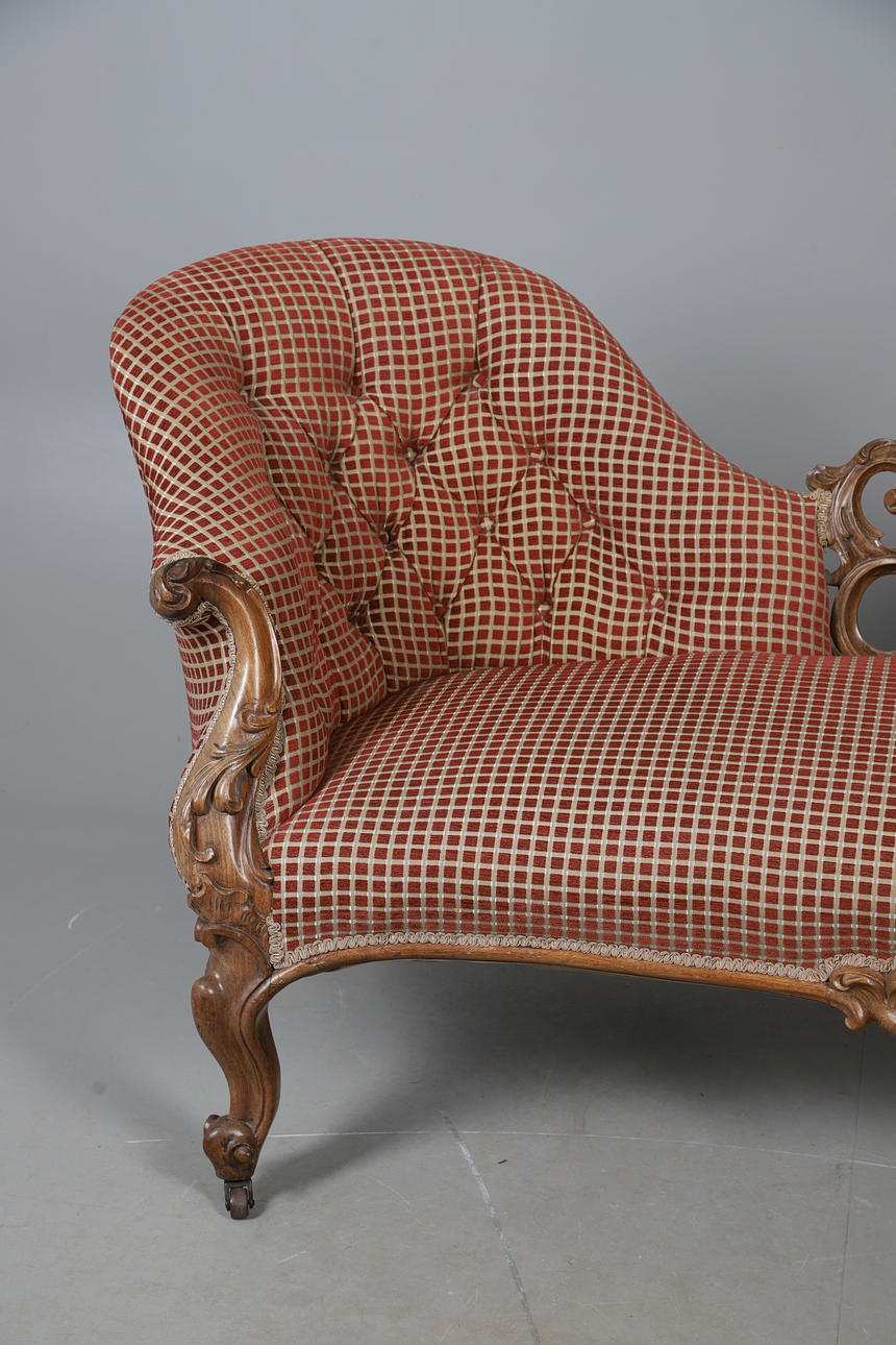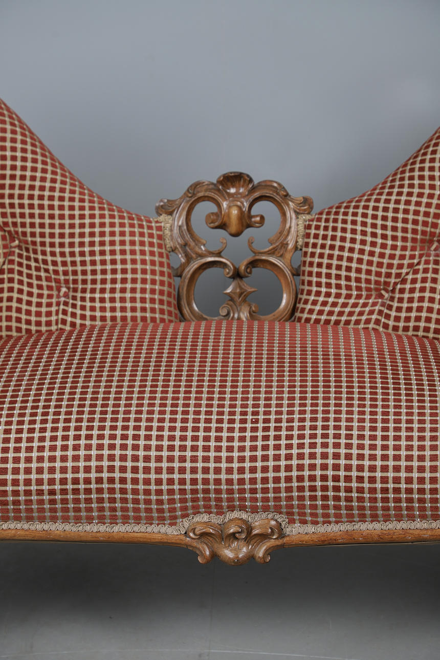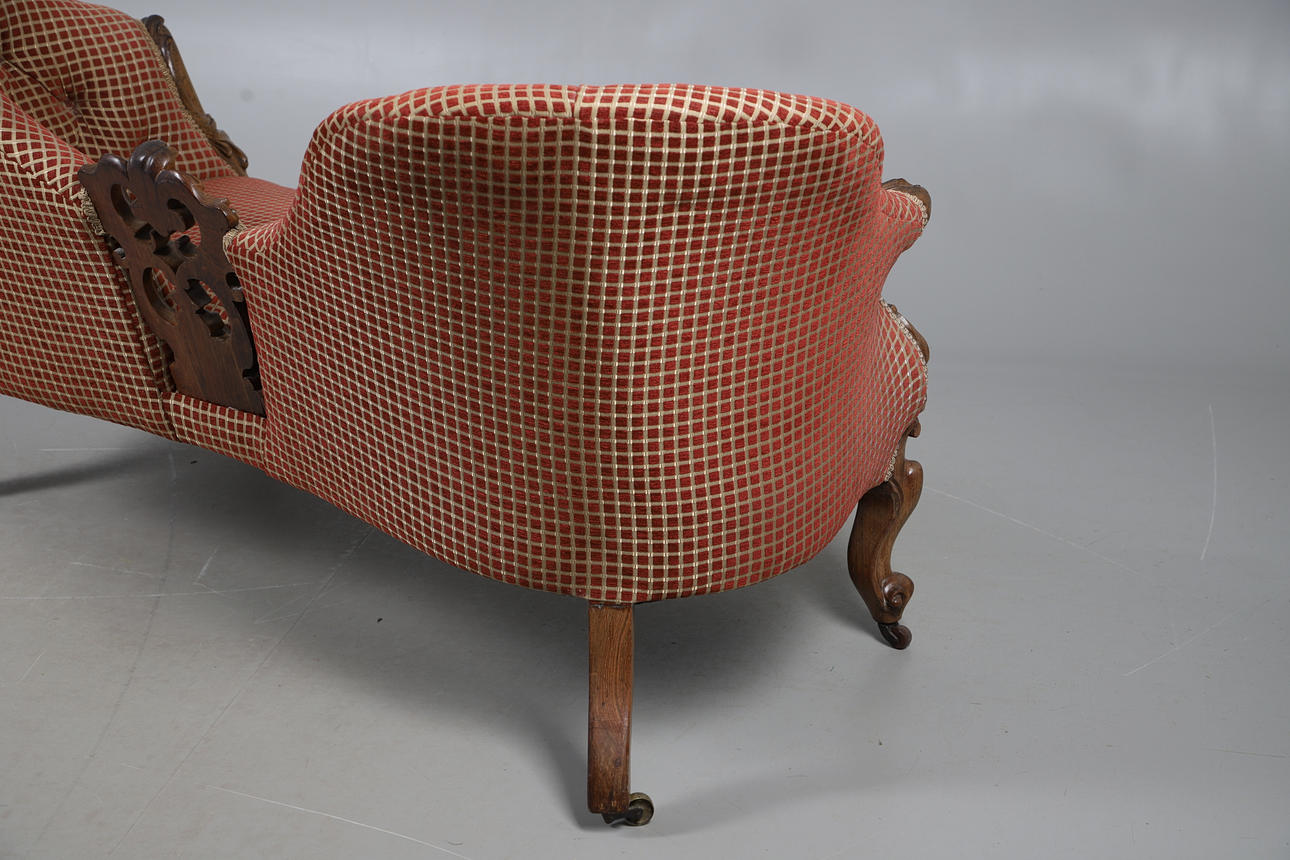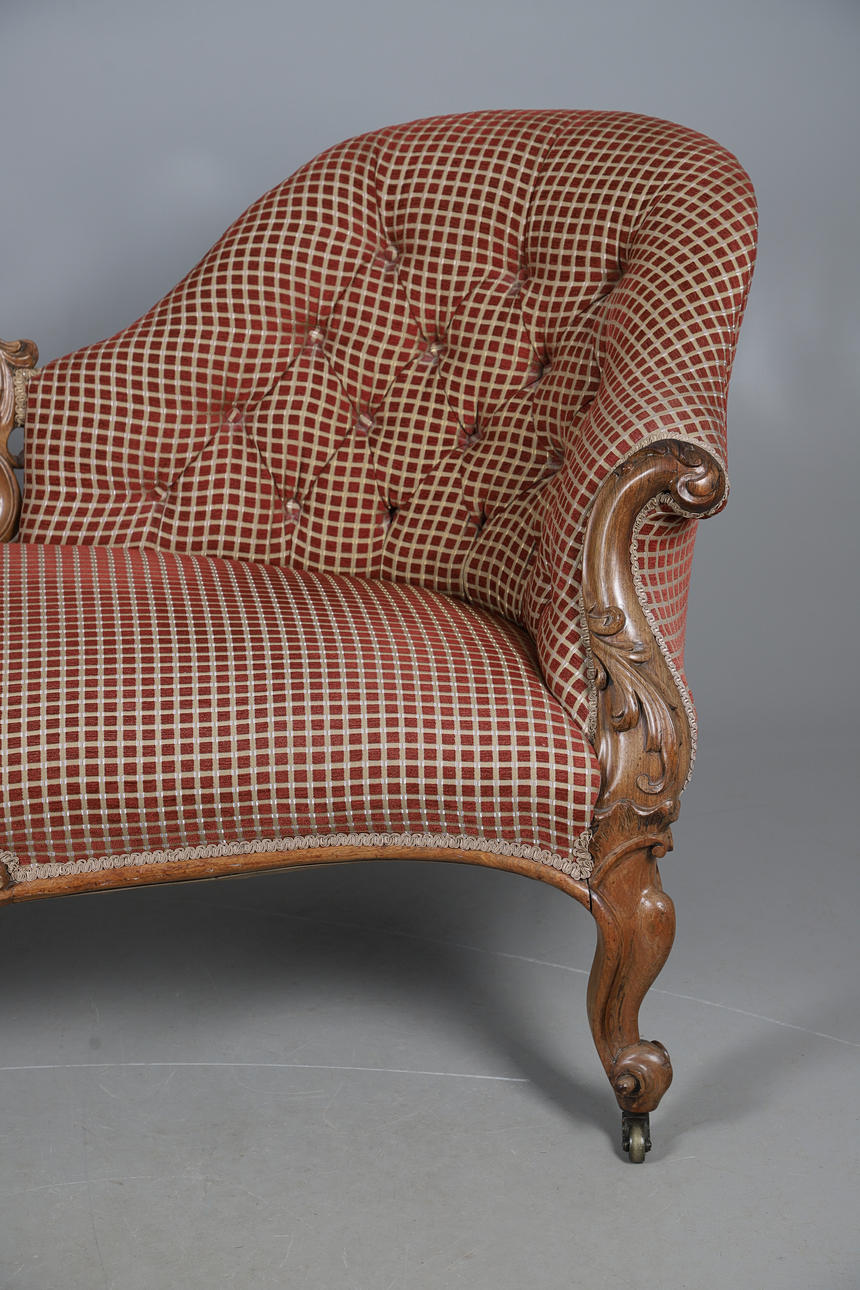 4987442. A VICTORIAN WALNUT FRAMED TWIN CHAIR BACK SCROLL END SETTEE.