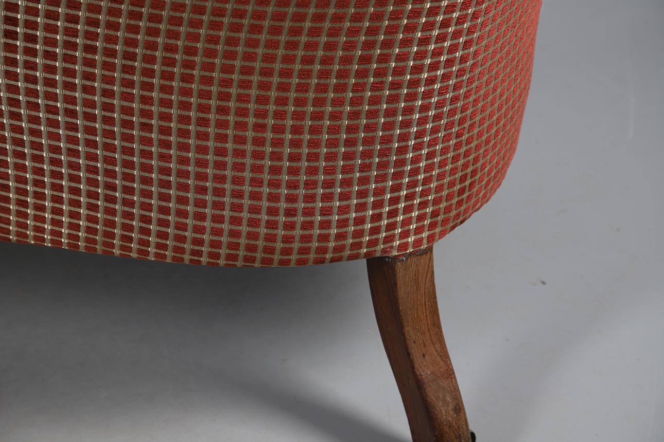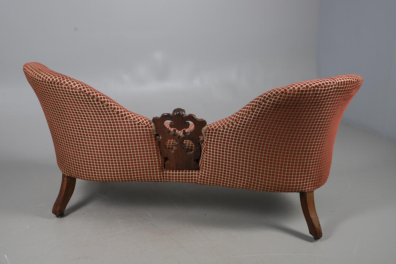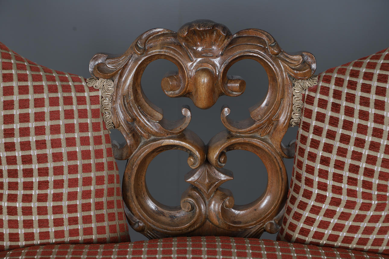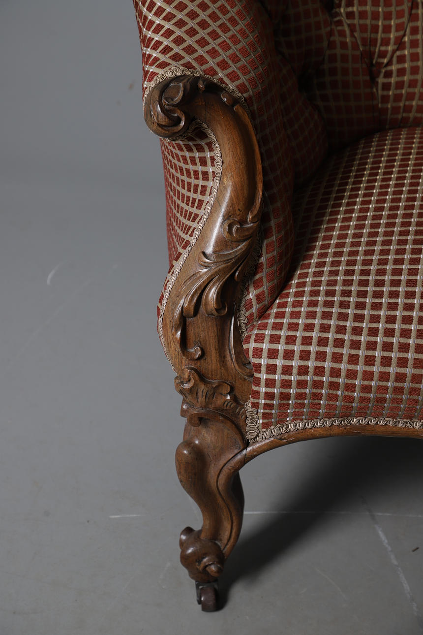 4987442. A VICTORIAN WALNUT FRAMED TWIN CHAIR BACK SCROLL END SETTEE.