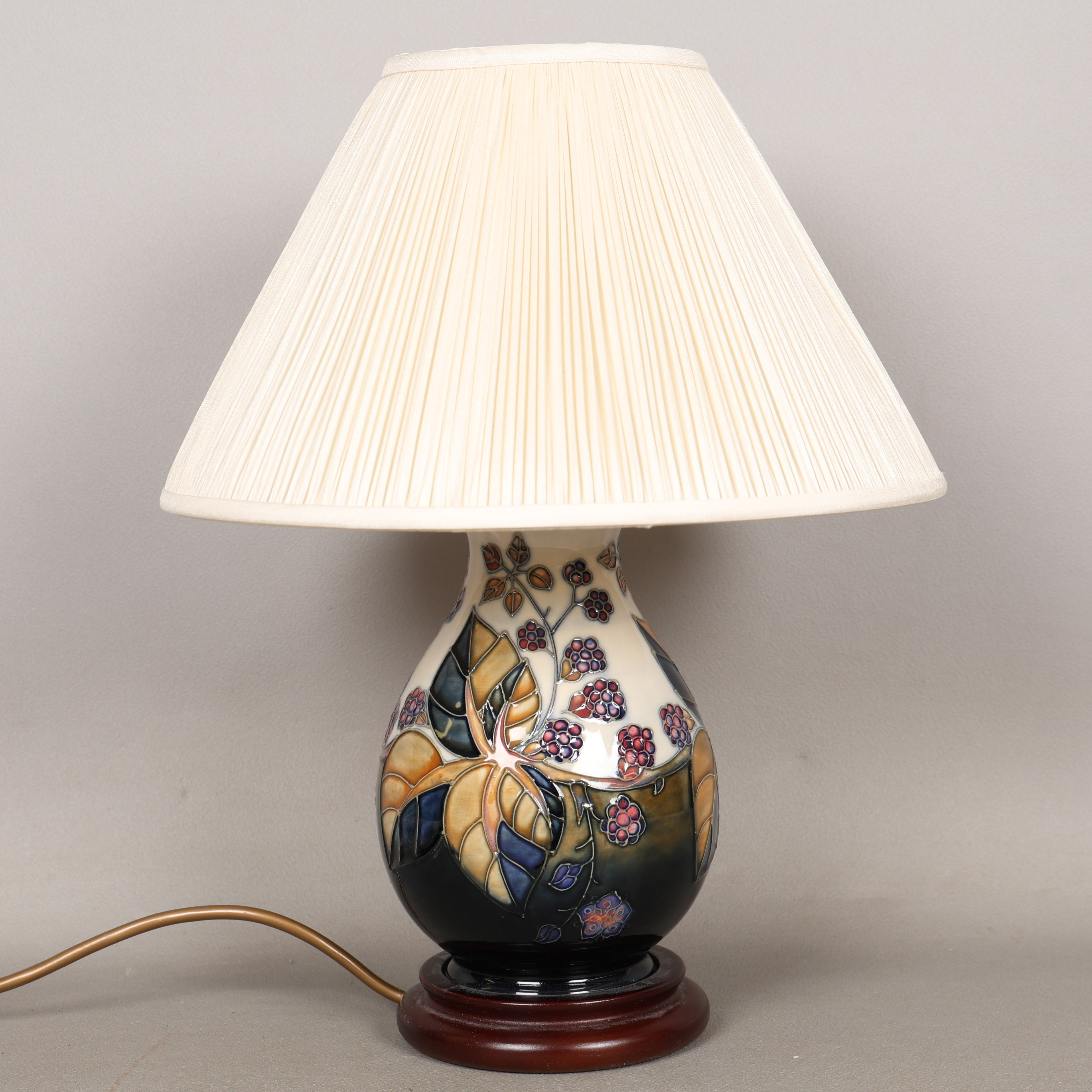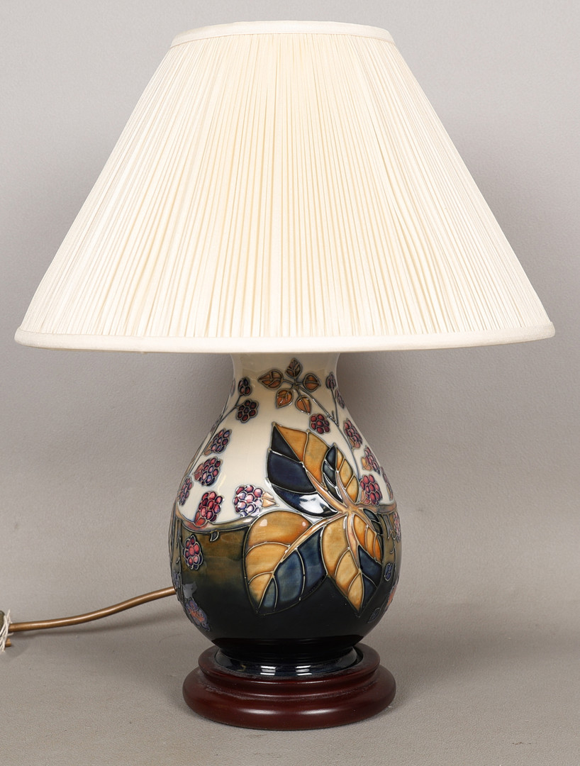 4987447. A MOORCROFT POTTERY BRAMBLE PATTERN TABLE LAMP AND SHADE.