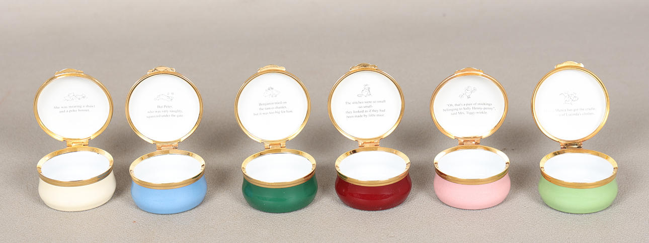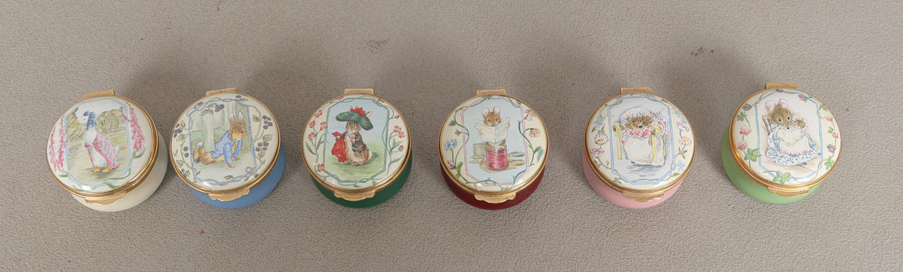 4987481. SIX CRUMMLES, BEATRIX POTTER ENAMEL BOXES EXCLUSIVELY COMMISSIONED FOR ROYAL DOULTON (6).