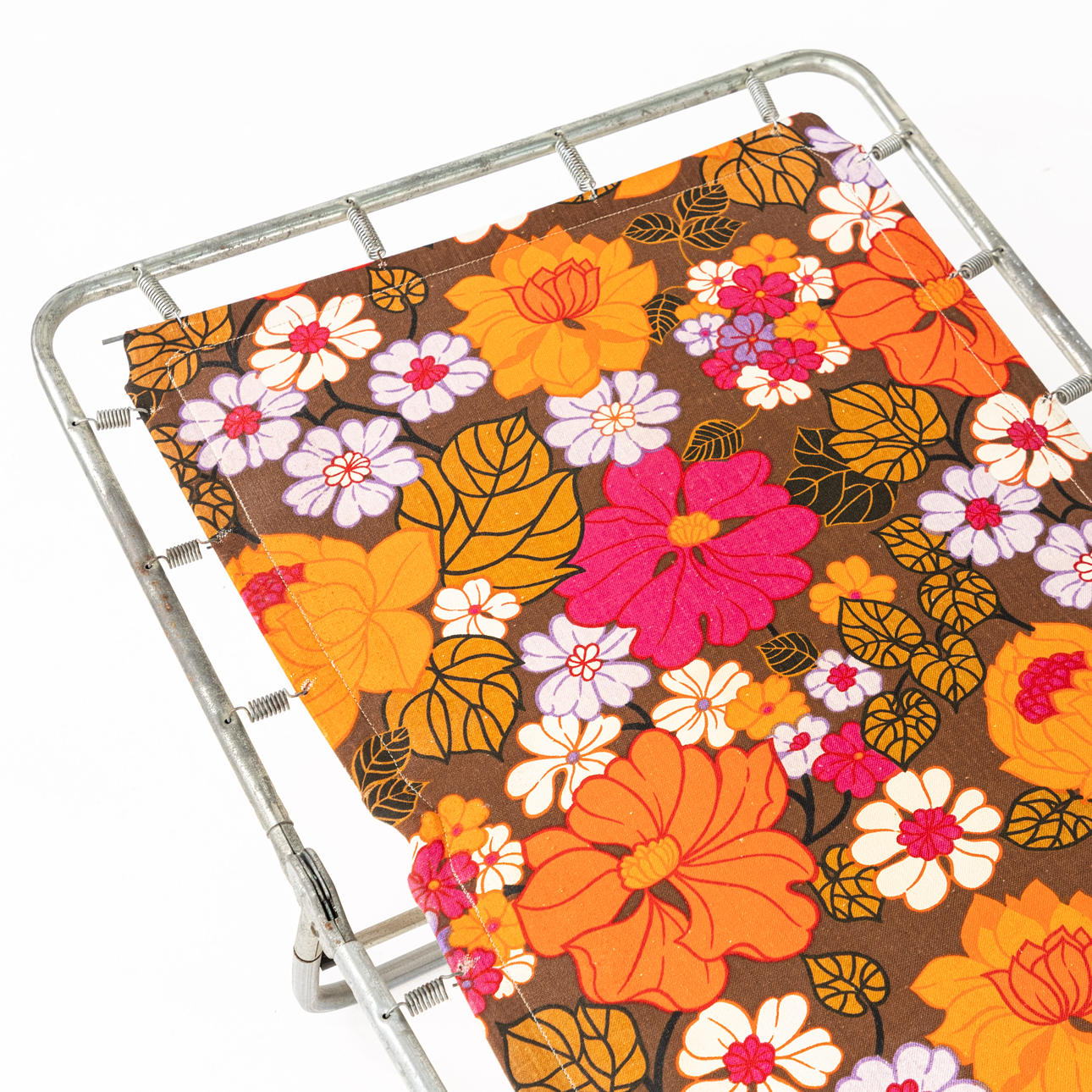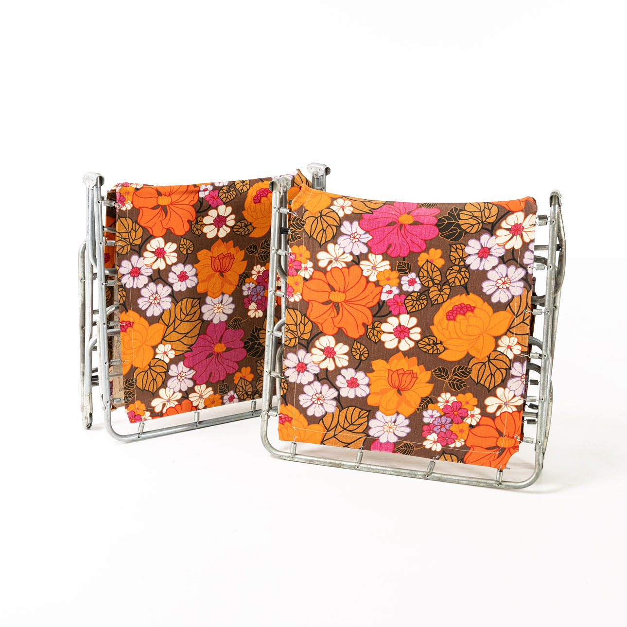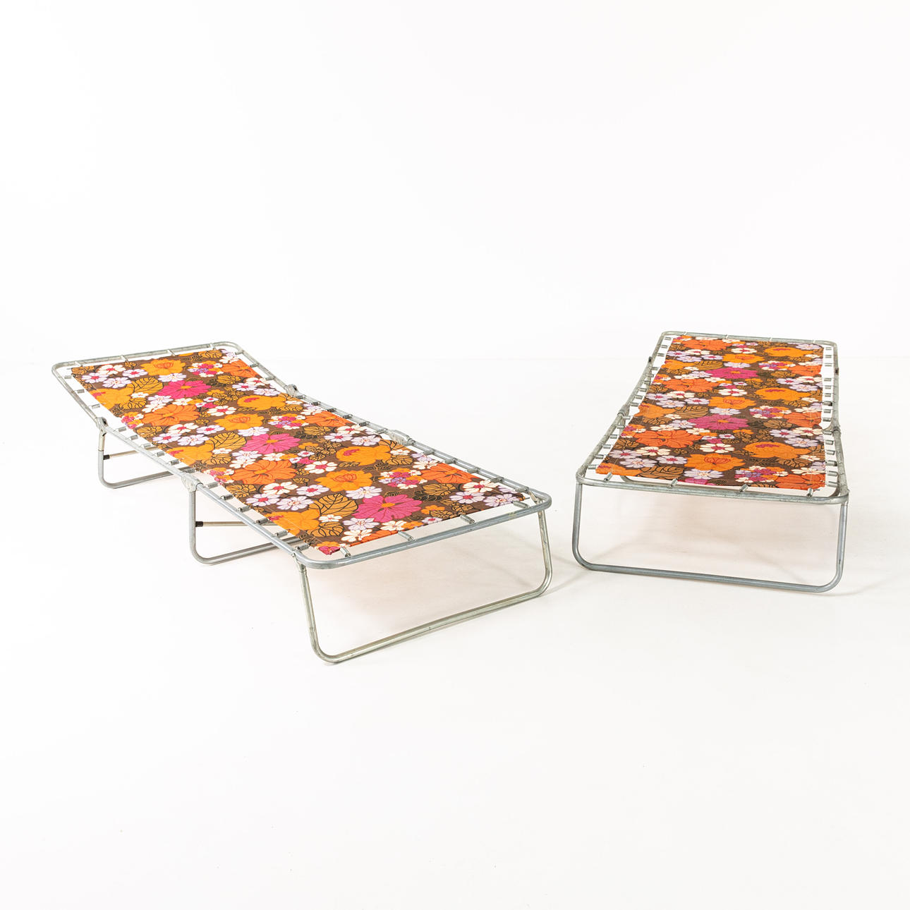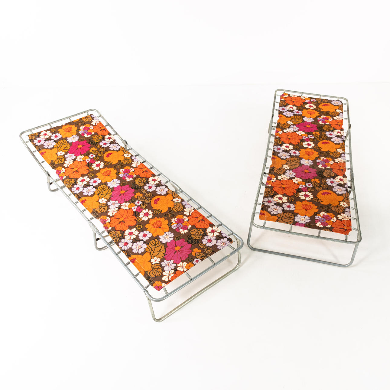 Sun beds, a pair, frame metal tube, upholstered with large-flowered coloured textile, circa 1960/70's